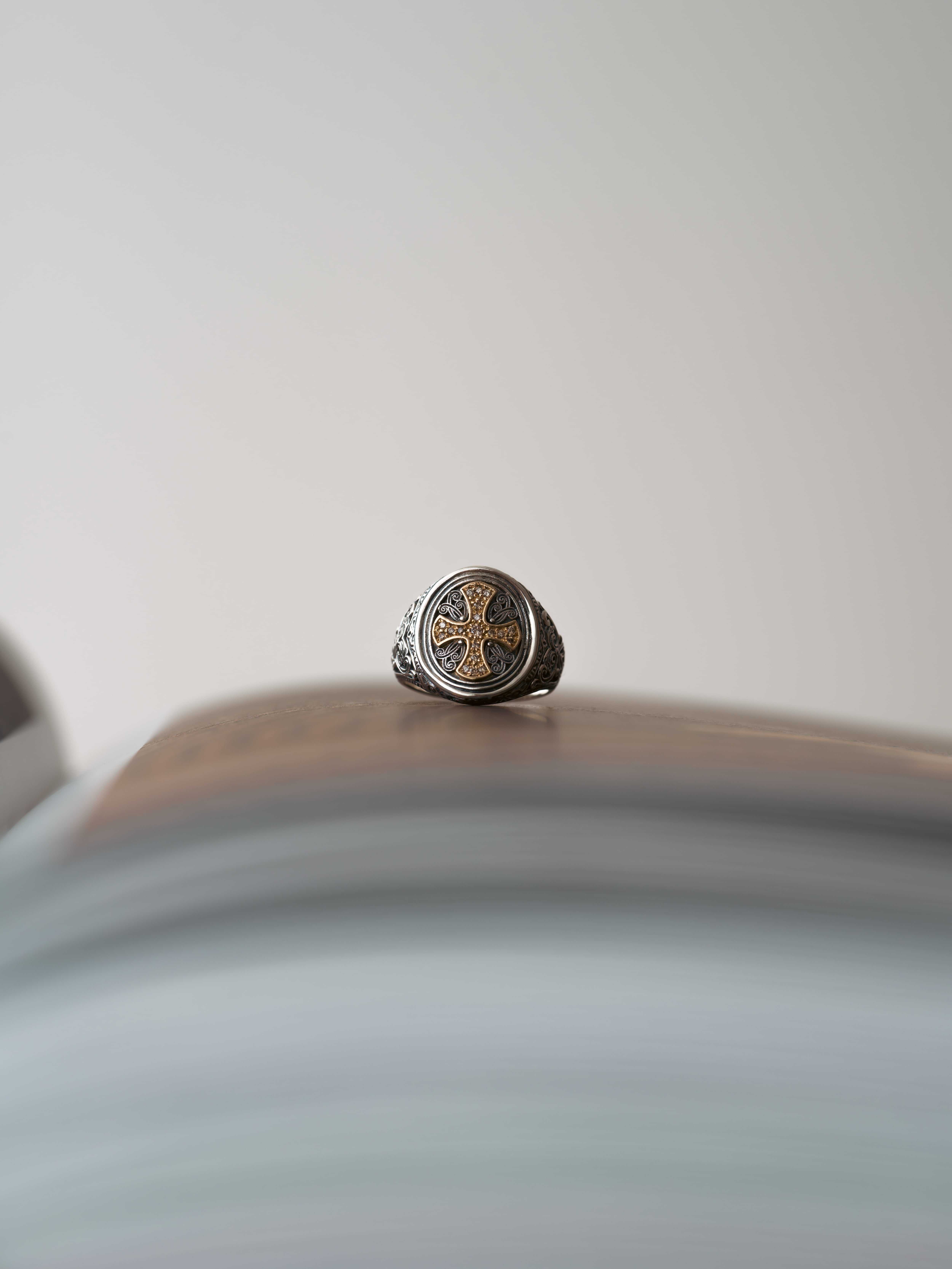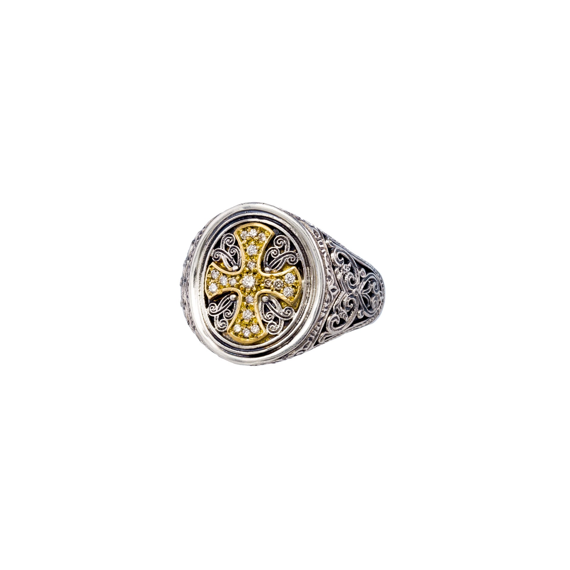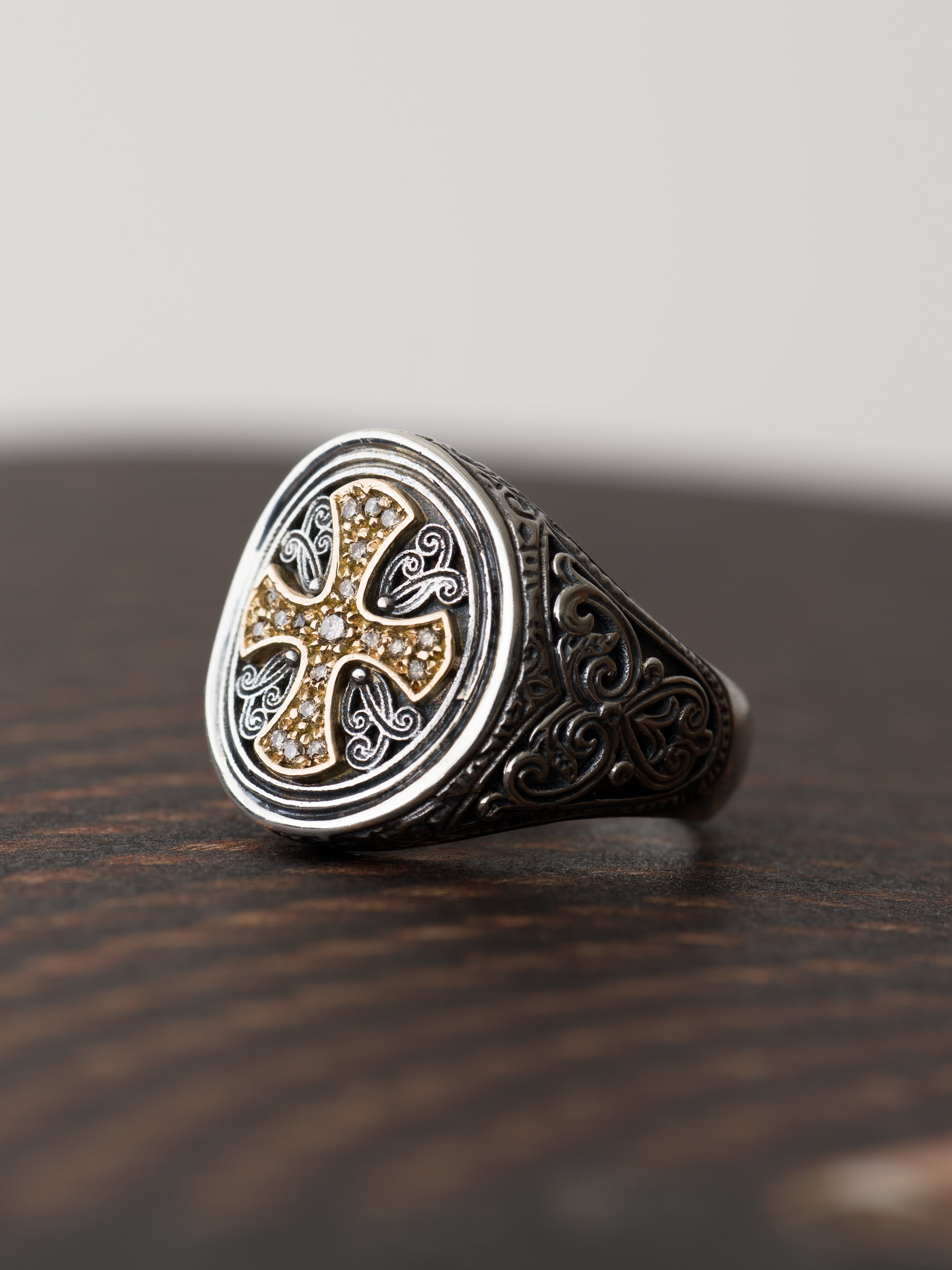 Gerochristo|ジェロクリスト シルバーと18Kゴールド製のリング、中央のクロスモチーフにメレダイヤモンド。 ギリシアに拠点を置くジェロクリストは、古典芸術様式であるビザンチンに影響を受けた伝統的な装飾技術を用い、クラシックとモダンが調和する独自のデザインでジュエリーを創り上げています。 ギリシア製 シルバー925|18Kゴールド|ダイヤモンド サイズ|JP 17.5 アイテムナンバー|GR102 価格|¥155,100