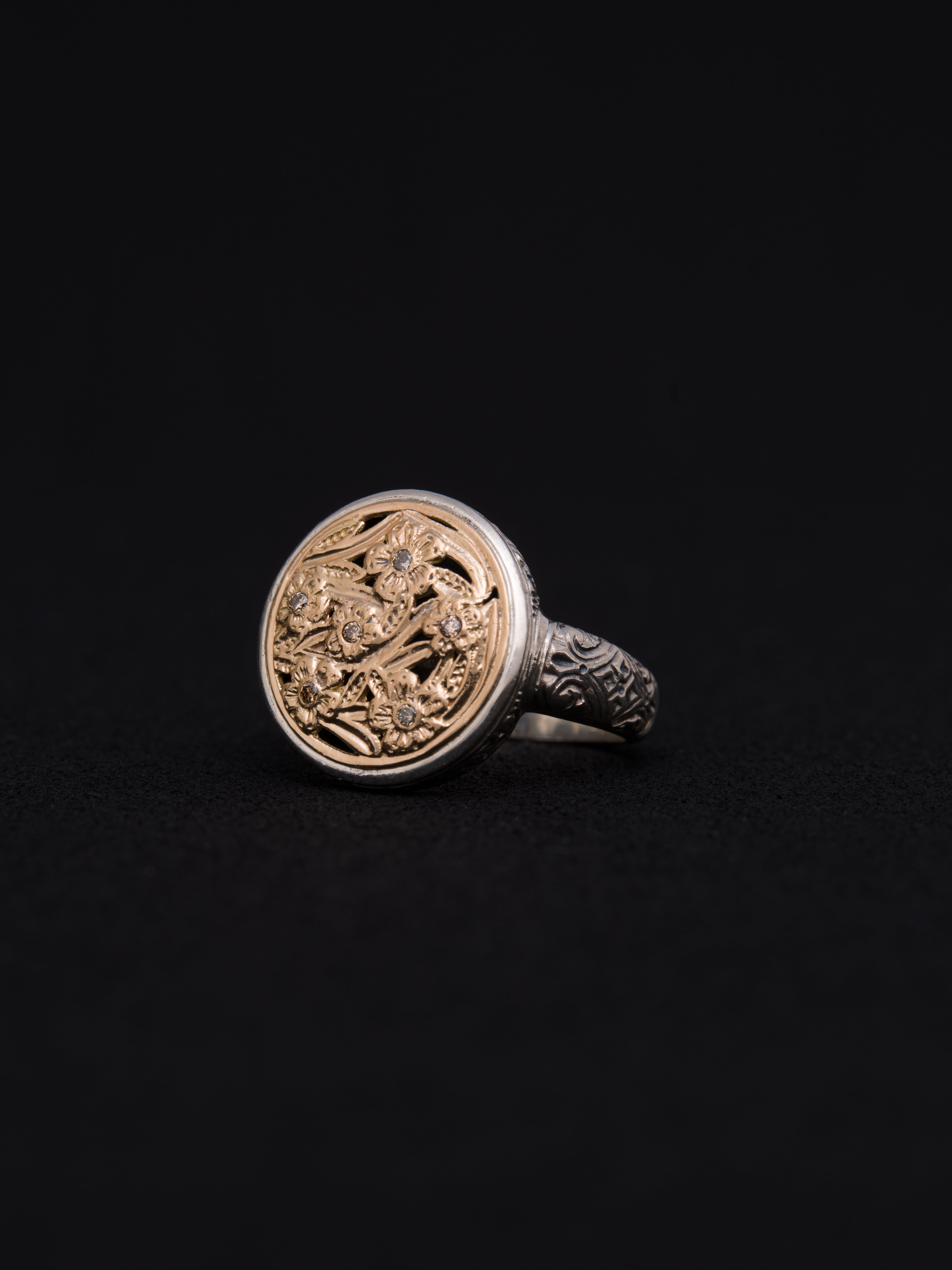 Gerochristo|ジェロクリスト シルバーと18Kゴールド製のリング、フラワーモチーフにメレダイヤモンド。 ギリシアに拠点を置くジェロクリストは、古典芸術様式であるビザンチンに影響を受けた伝統的な装飾技術を用い、クラシックとモダンが調和する独自のデザインでジュエリーを創り上げています。 ギリシア製 シルバー925|18Kゴールド|ダイヤモンド サイズ|JP 13.5 アイテムナンバー|GR116