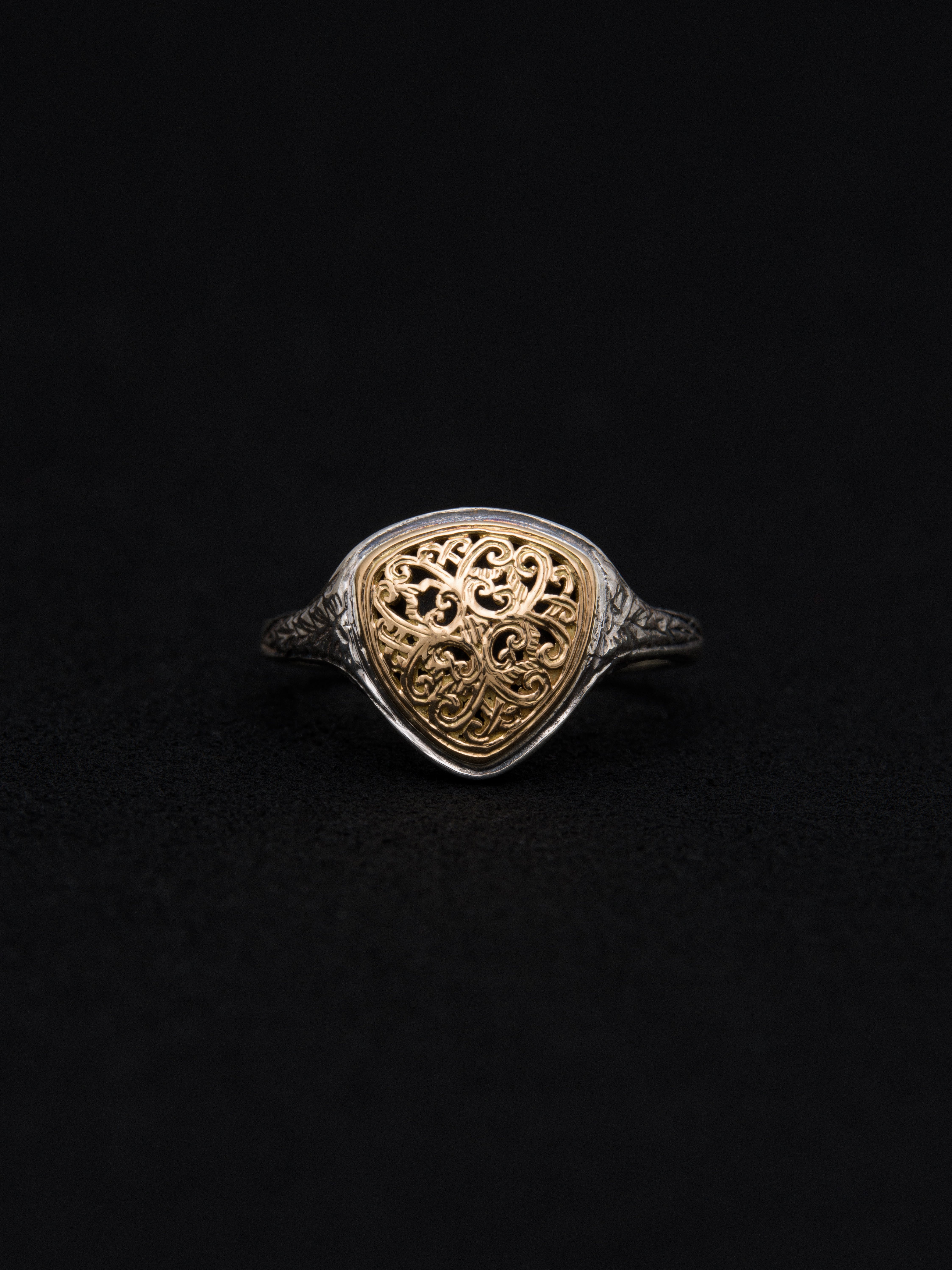 Gerochristo|ジェロクリスト シルバーと18Kゴールド製のリング。 ギリシアに拠点を置くジェロクリストは、古典芸術様式であるビザンチンに影響を受けた伝統的な装飾技術を用い、クラシックとモダンが調和する独自のデザインでジュエリーを創り上げています。 ギリシア製 シルバー925|18Kゴールド サイズ|JP 17.5 アイテムナンバー|GR120