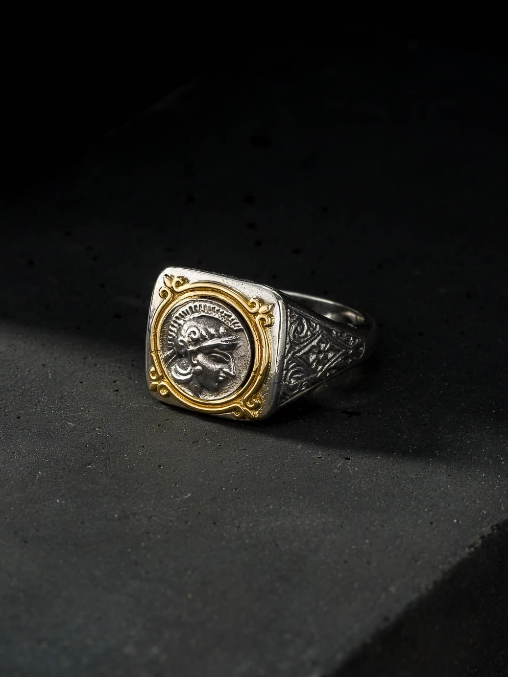Gerochristo|ジェロクリスト シルバーと18Kゴールド製のリング、中央にアテナの彫刻。 ギリシアに拠点を置くジェロクリストは、古典芸術様式であるビザンチンに影響を受けた伝統的な装飾技術を用い、クラシックとモダンが調和する独自のデザインでジュエリーを創り上げています。 ギリシア製 シルバー925|18Kゴールド サイズ|JP 18.5 アイテムナンバー|GR122