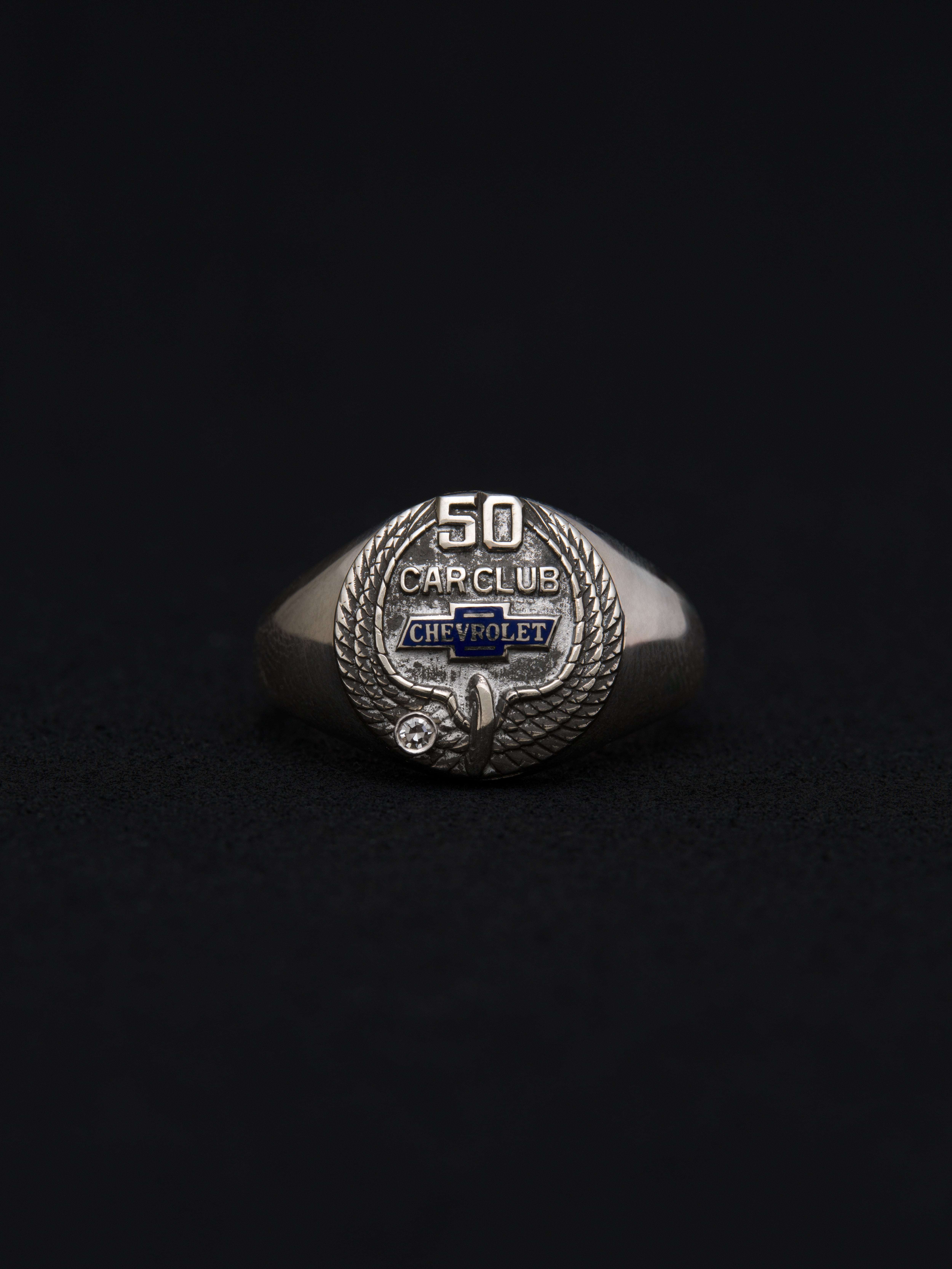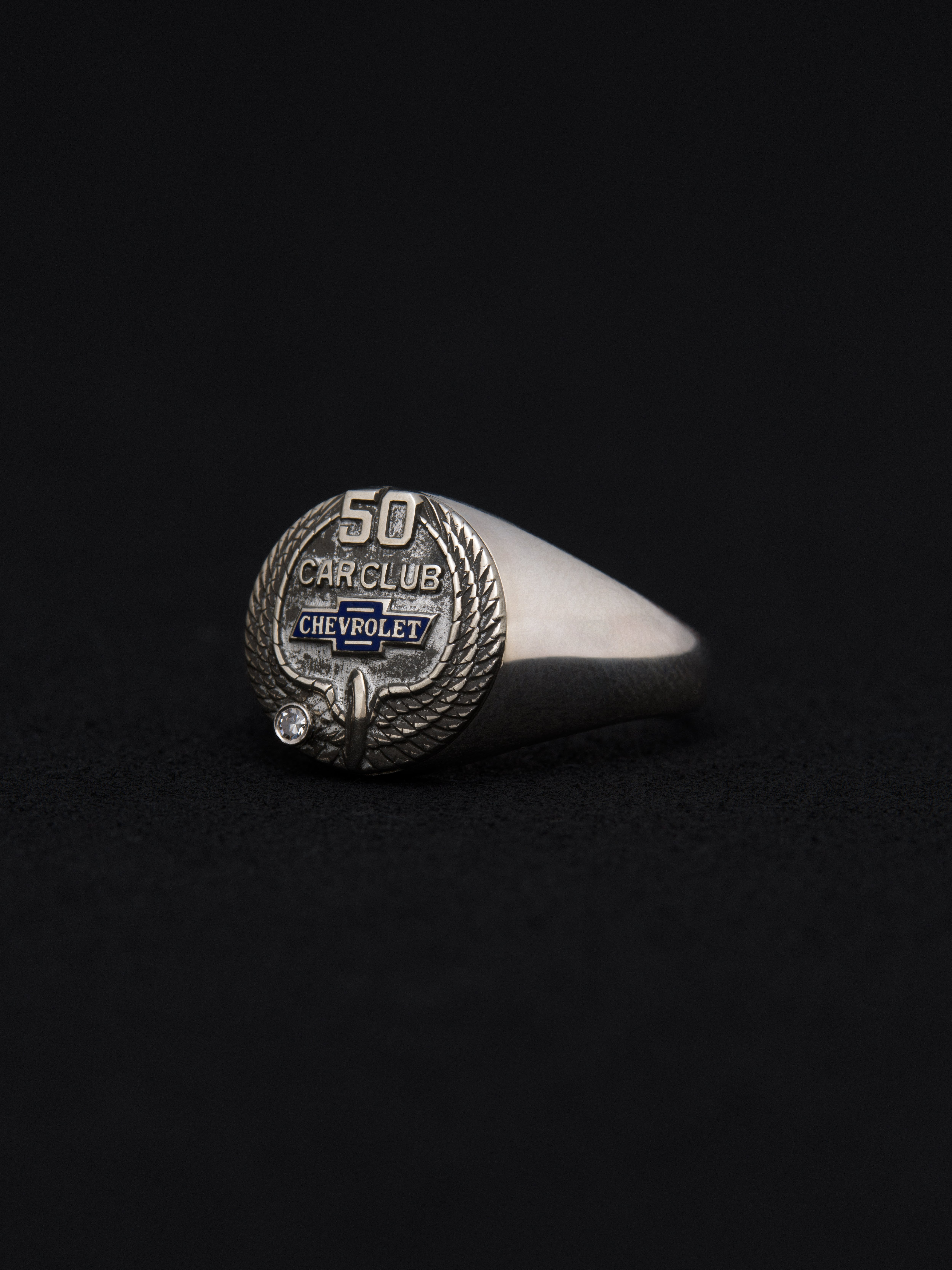 Chevrolet〈シボレー〉のシルバー製シグネットリング、ダイヤモンドをセッティング。一定期間に50台の車を成約させた社員に送られた表彰リングと推測されます。 アメリカ製 シルバー925|ダイヤモンド|エナメル サイズ|JP 21 アイテムナンバー|R2344