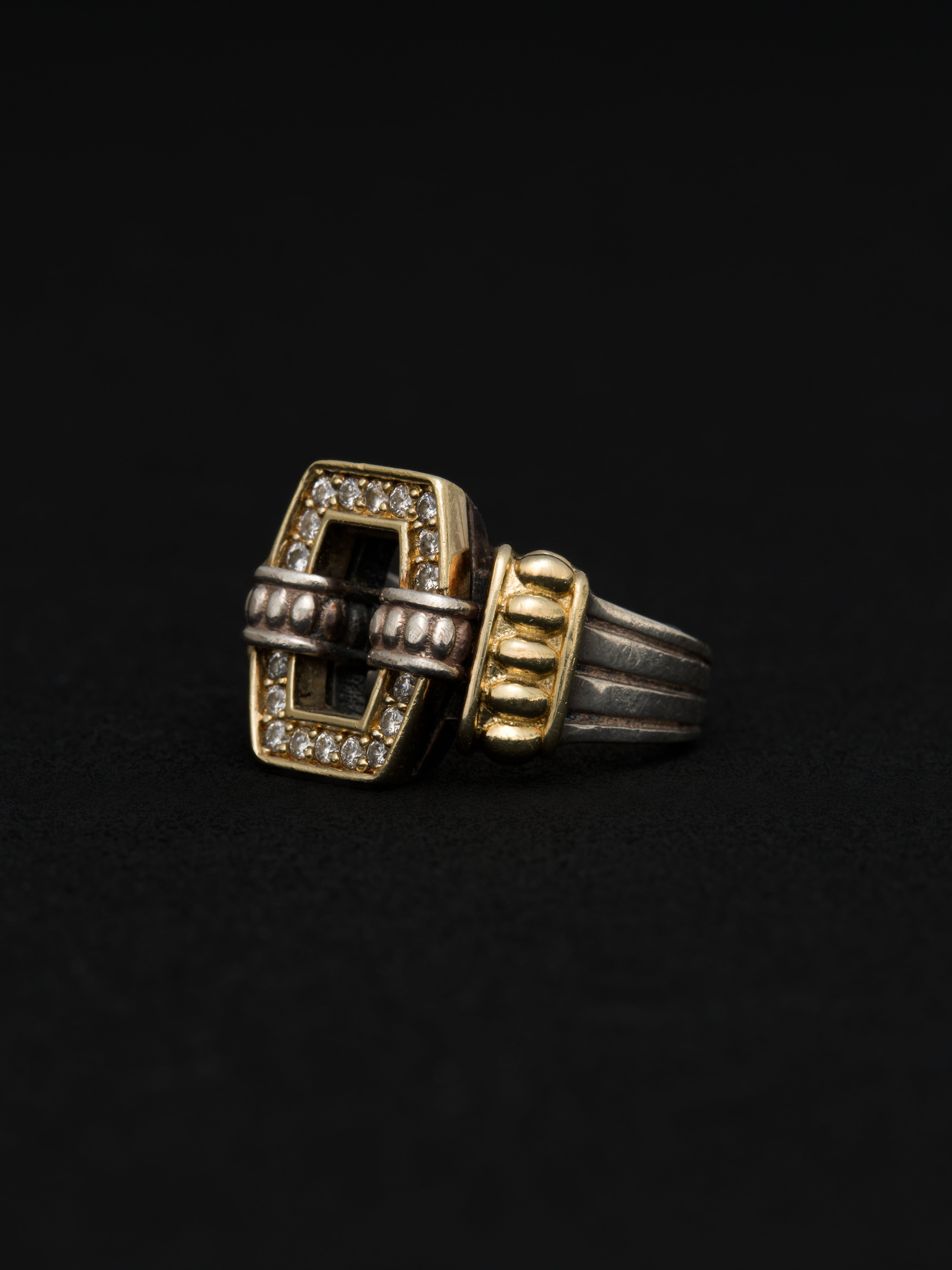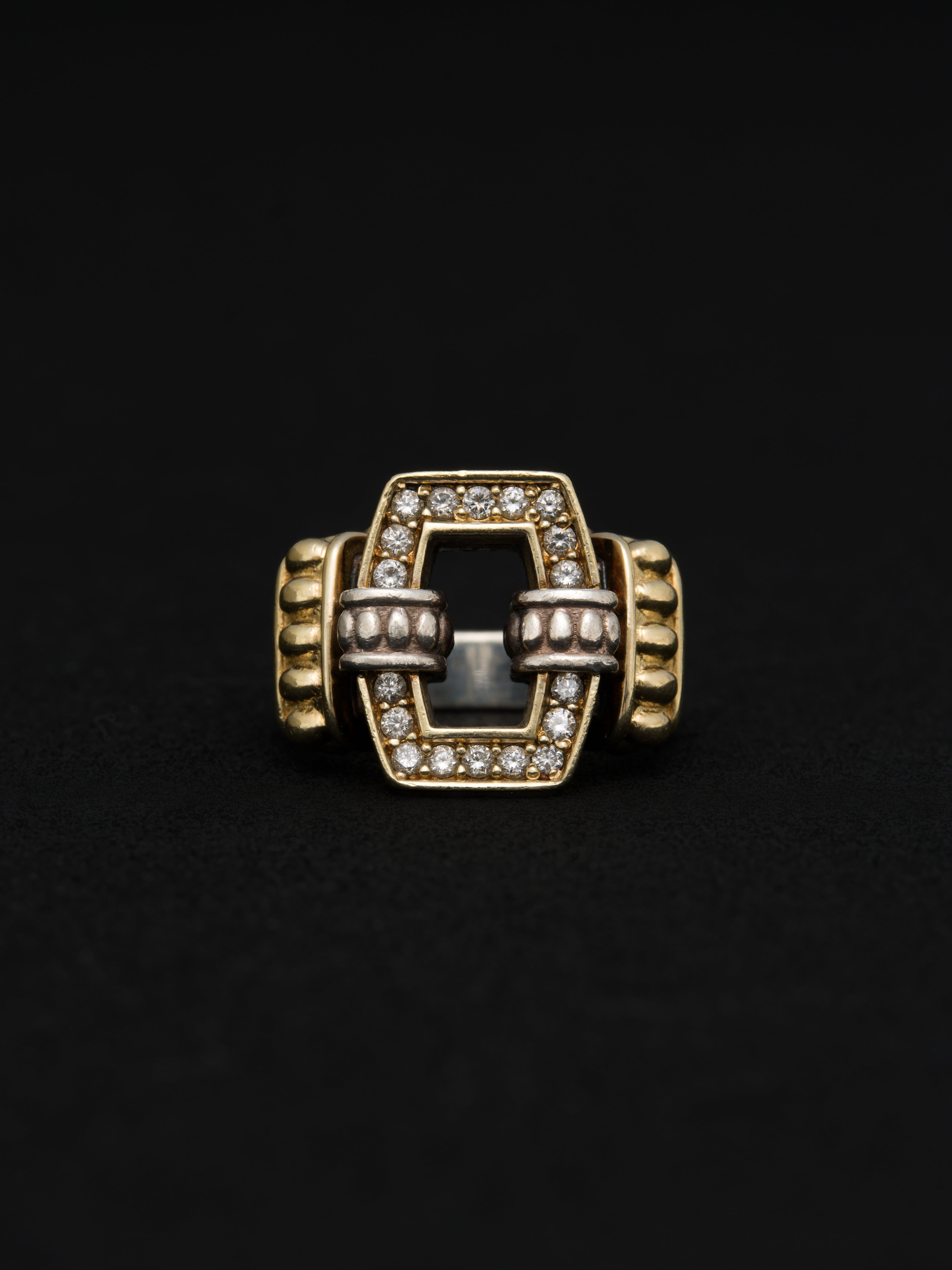 Lagos|ラゴス シルバーと18Kゴールド製のリング、ダイヤモンドをパヴェセッティング。 1977年にSteven Lagosによってアメリカで創業。その後、1984年にブランドの代名詞であるCaviarコレクションを確立しました。イノベーションをブランドのテーマに掲げ、新しいテクノロジーや素材を積極的にジュエリーに取り入れています。 アメリカ製 シルバー925|18Kゴールド|ダイヤモンド サイズ|JP 13.5 アイテムナンバー|R2346