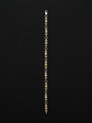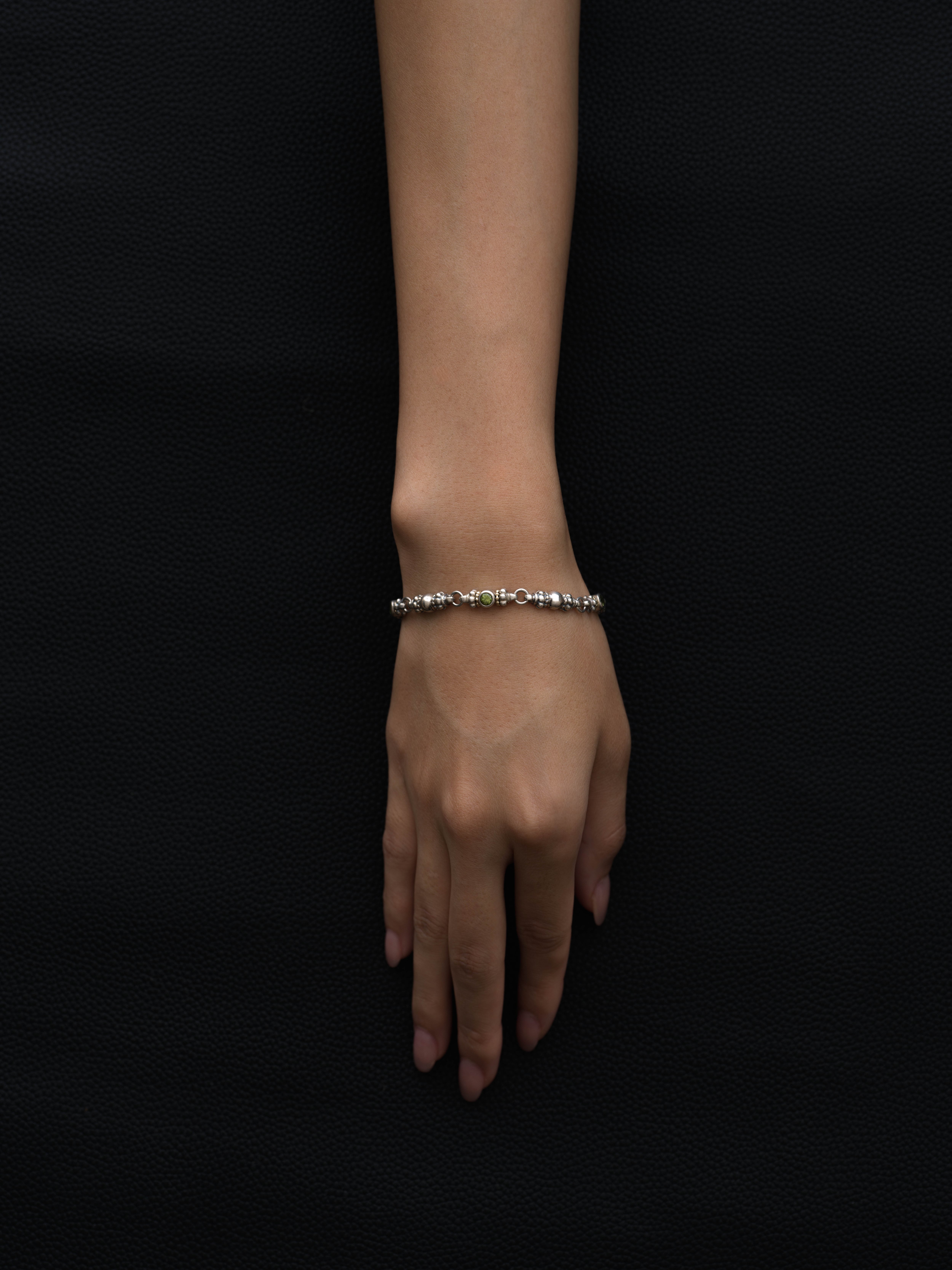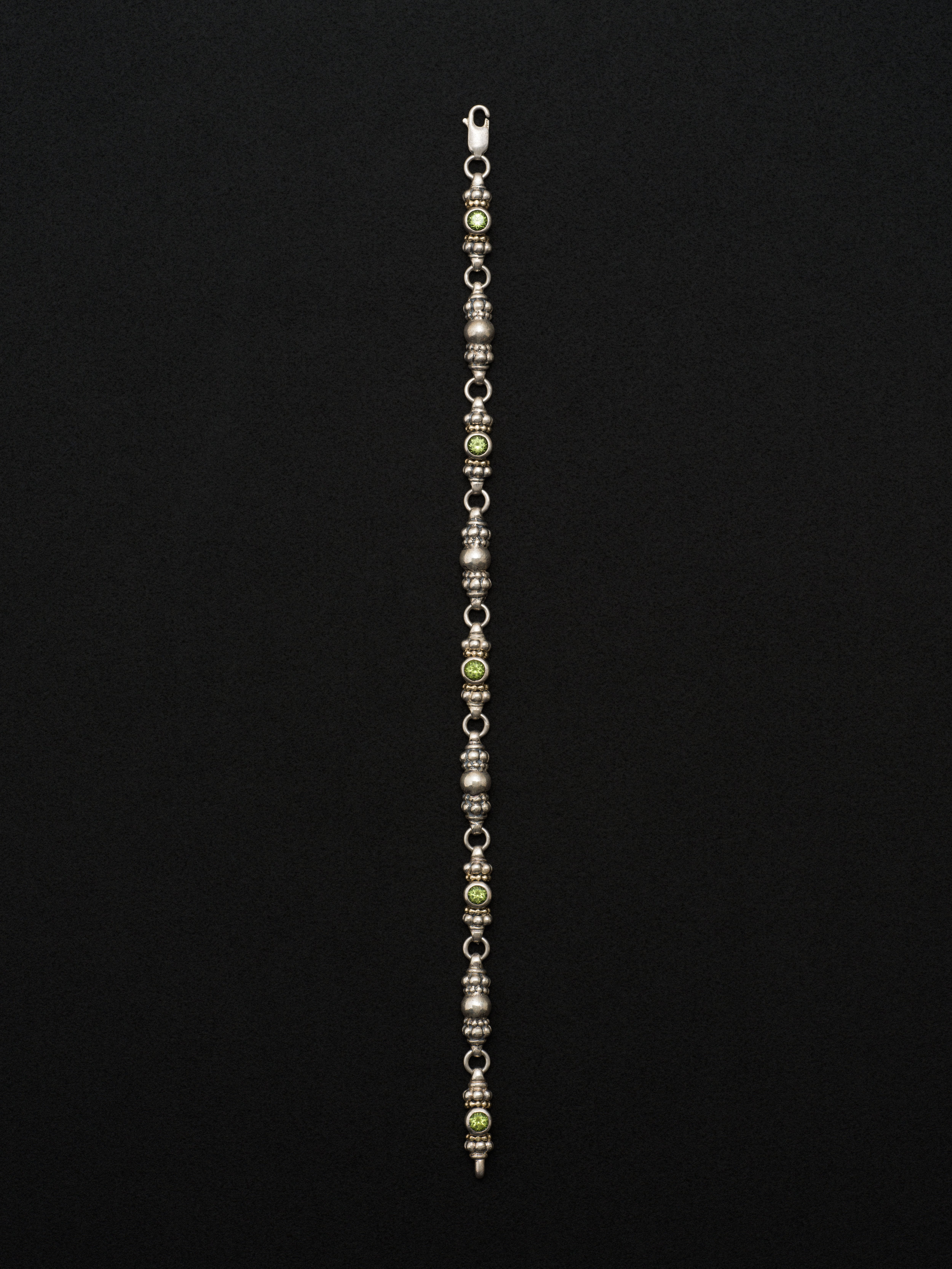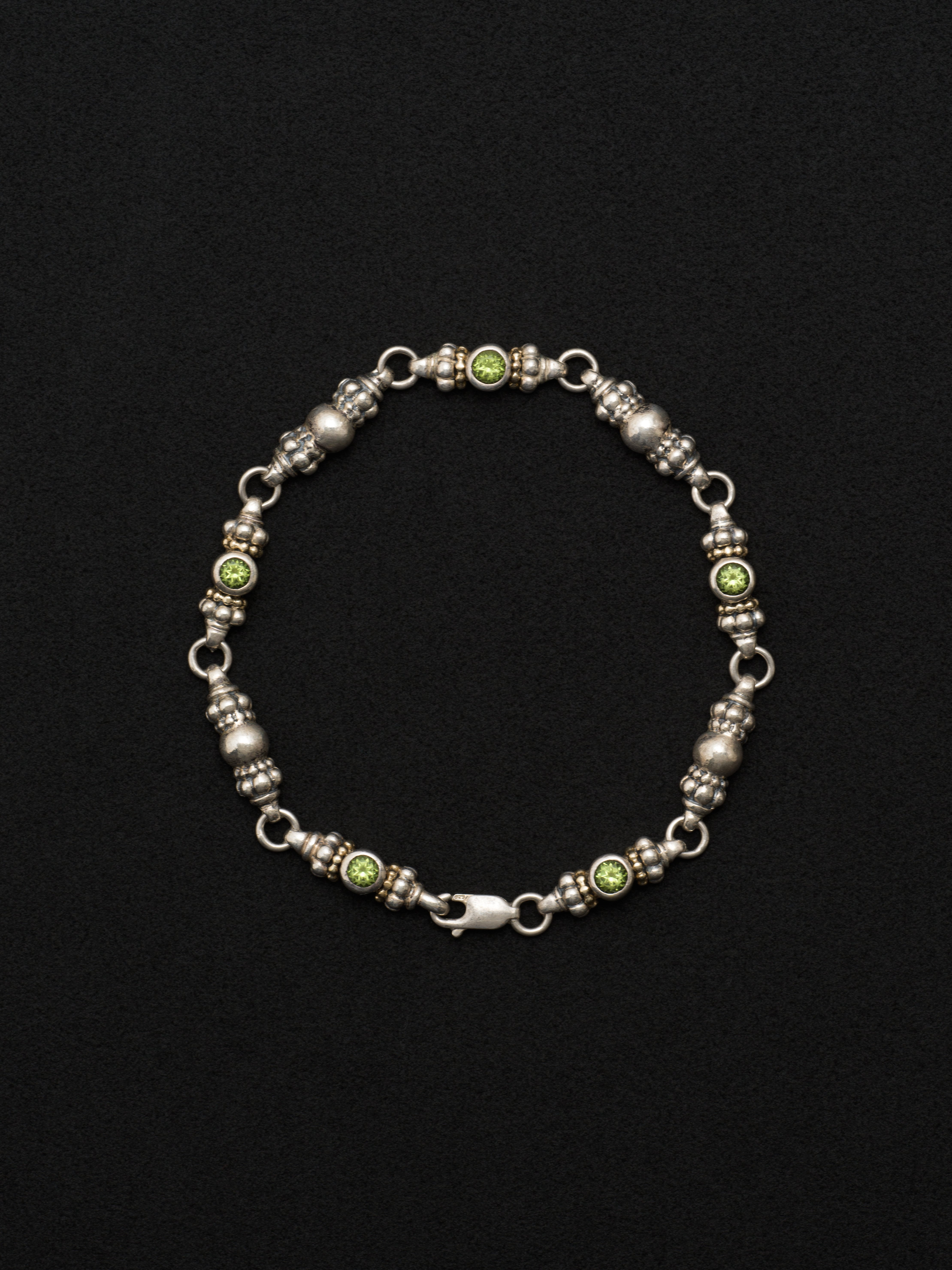 Lagos|ラゴス シルバーと18Kゴールド製のブレスレット、5つのペリドットをセッティング。 1977年にSteven Lagosによってアメリカで創業。その後、1984年にブランドの代名詞であるCaviarコレクションを確立しました。イノベーションをブランドのテーマに掲げ、新しいテクノロジーや素材を積極的にジュエリーに取り入れています。 アメリカ製 シルバー925|18Kゴールド|ペリドット 内周 : 18.5cm|幅 : 5.3mm アイテムナンバー|B1328