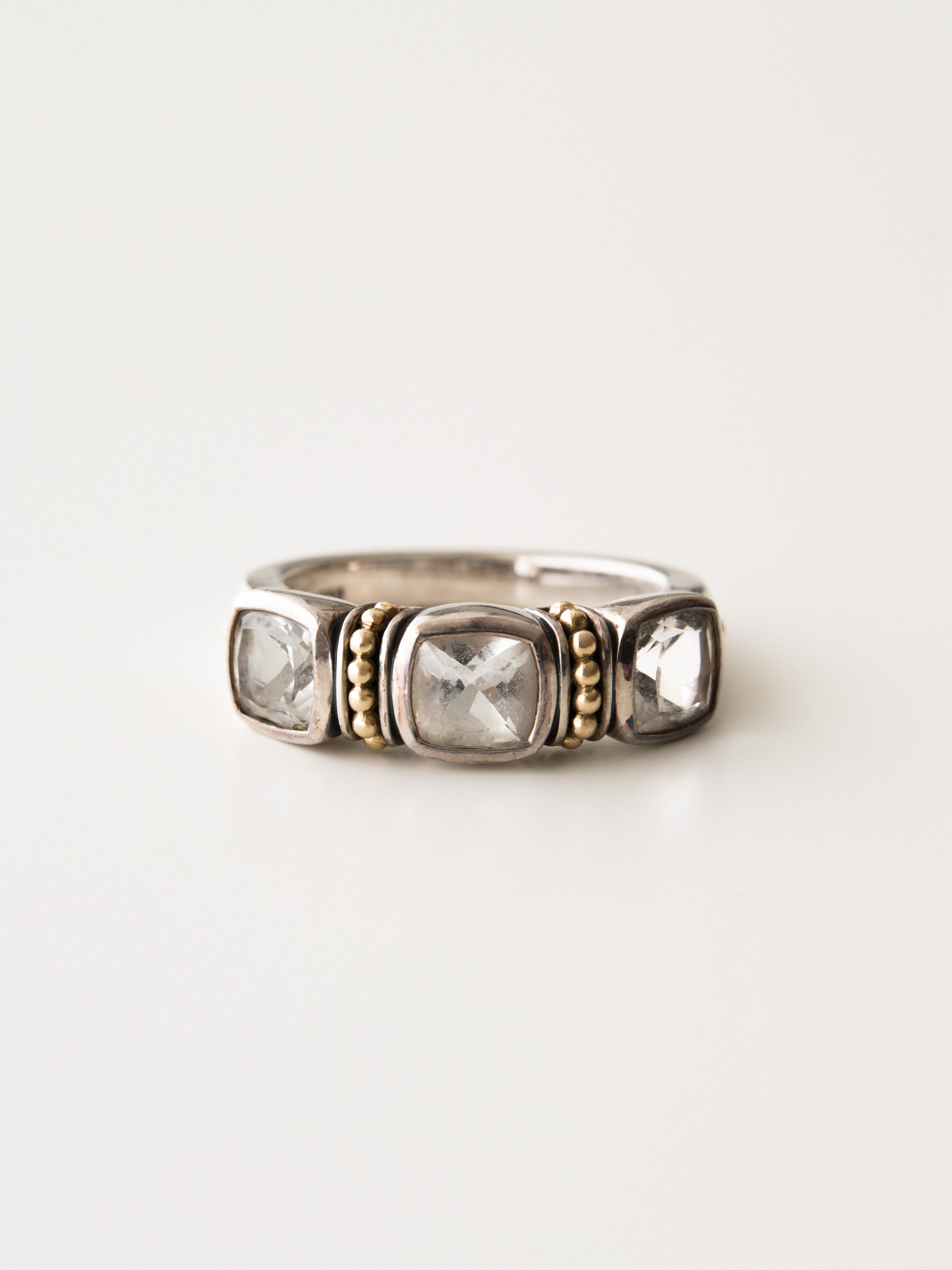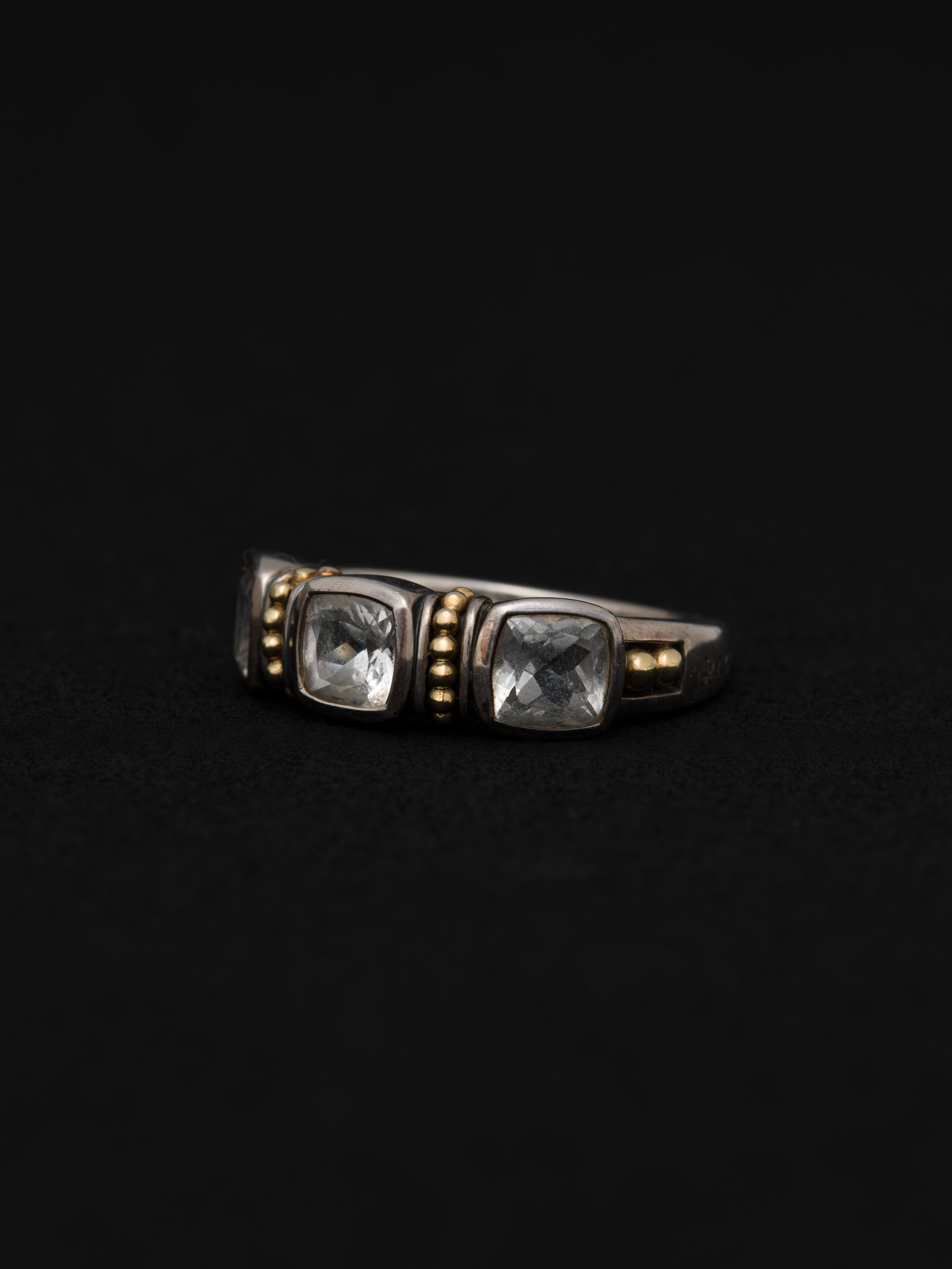 Lagos|ラゴス シルバーと18Kゴールド製のリング、3つのトパーズをセッティング。 1977年にSteven Lagosによってアメリカで創業。その後、1984年にブランドの代名詞であるCaviarコレクションを確立しました。イノベーションをブランドのテーマに掲げ、新しいテクノロジーや素材を積極的にジュエリーに取り入れています。 アメリカ製 シルバー925|18Kゴールド|トパーズ サイズ|JP 16 アイテムナンバー|R2369