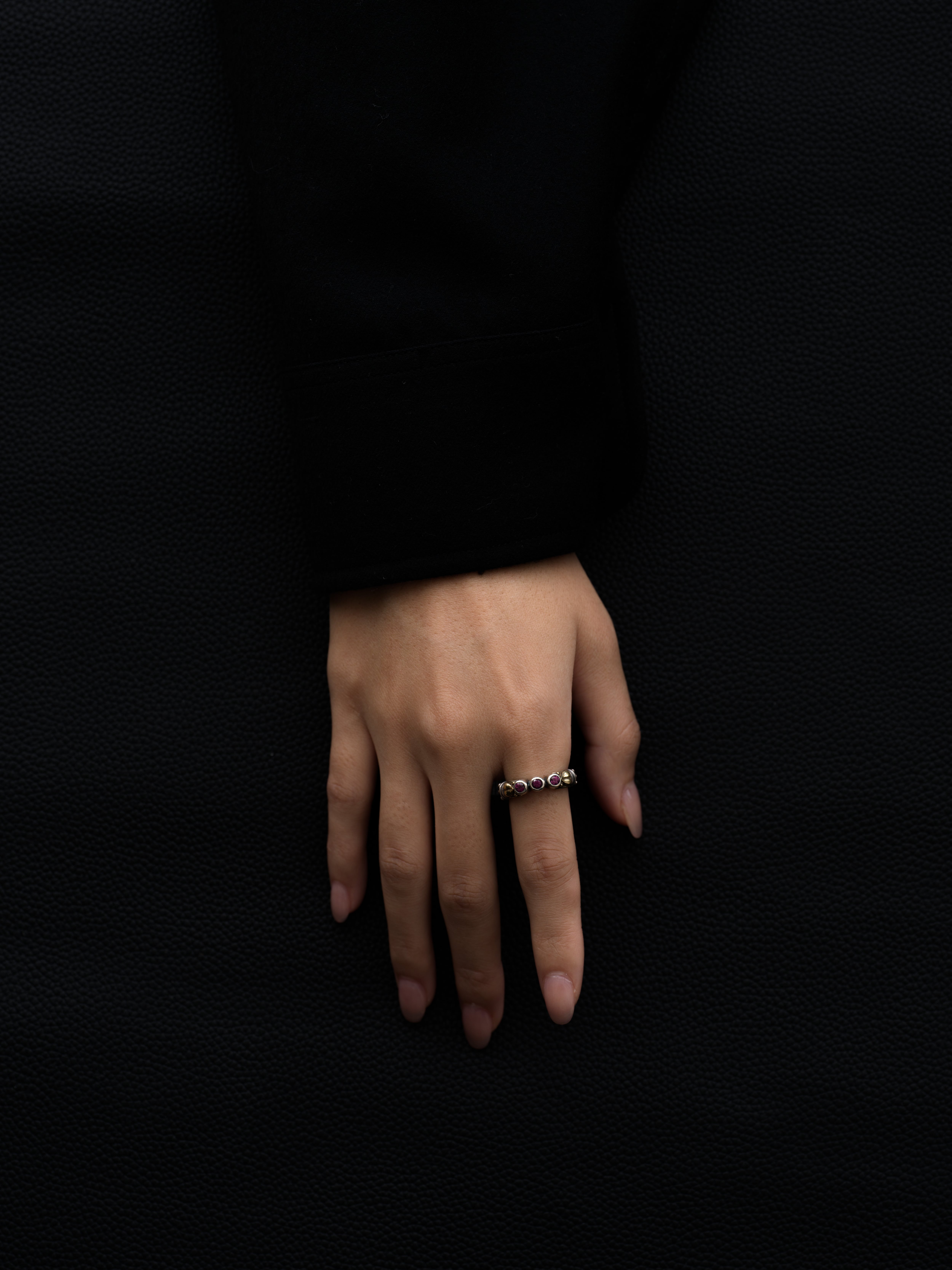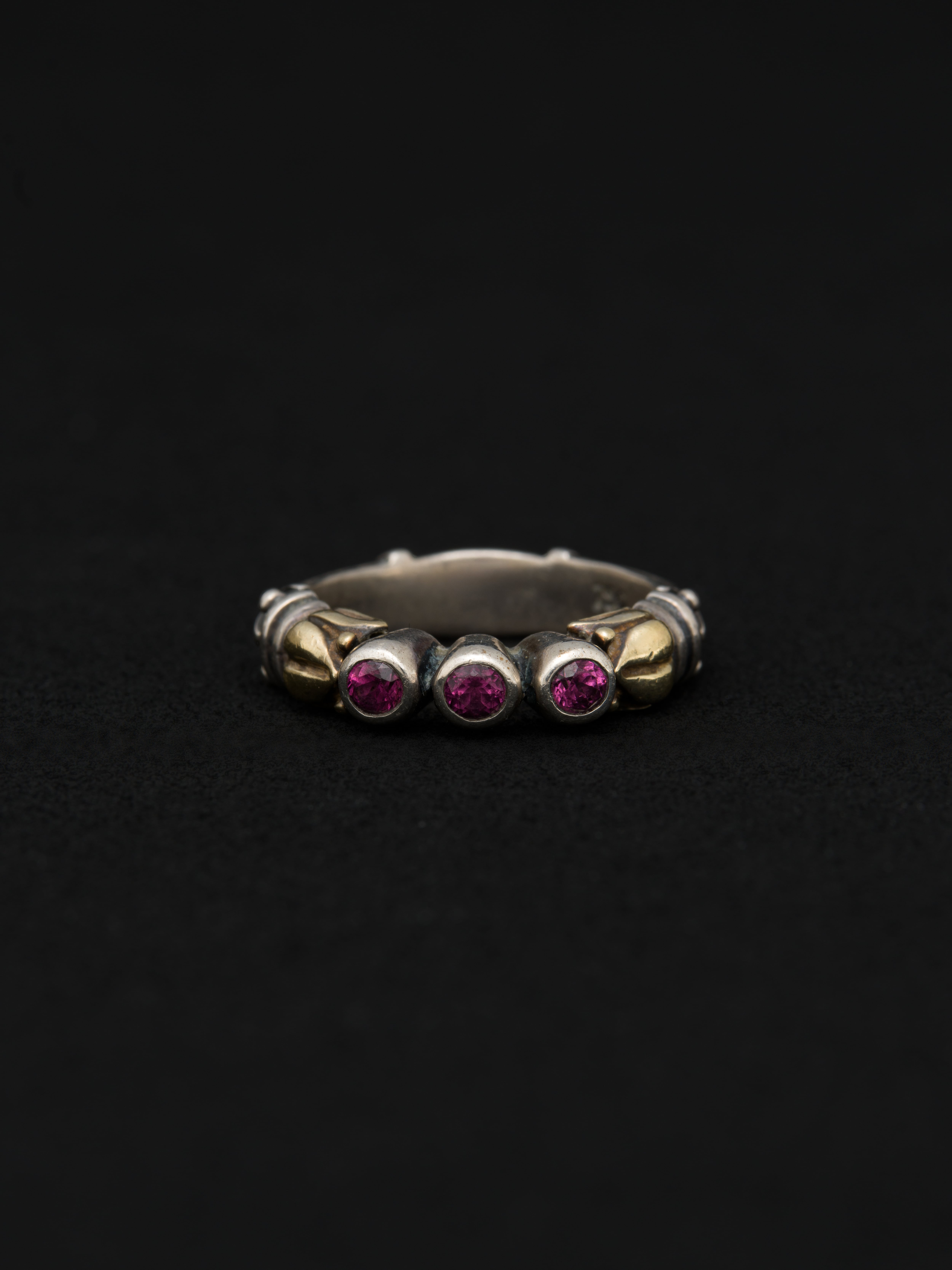 Lagos|ラゴス シルバーと18Kゴールド製のリング、3つのロードライトガーネットをセッティング。 1977年にSteven Lagosによってアメリカで創業。その後、1984年にブランドの代名詞であるCaviarコレクションを確立しました。イノベーションをブランドのテーマに掲げ、新しいテクノロジーや素材を積極的にジュエリーに取り入れています。 アメリカ製 シルバー925|18Kゴールド|ロードライトガーネット サイズ|JP 13.5 アイテムナンバー|R2368