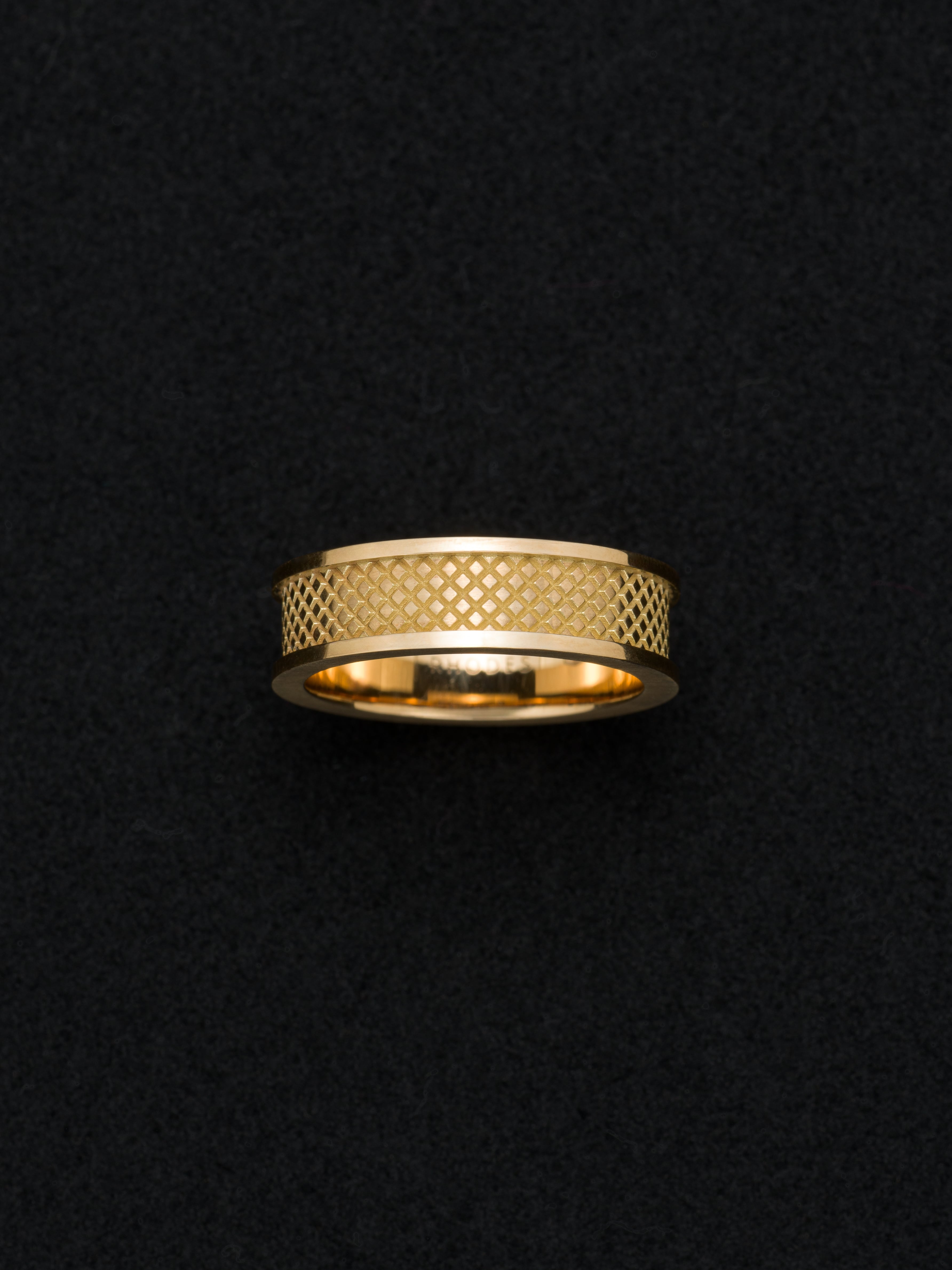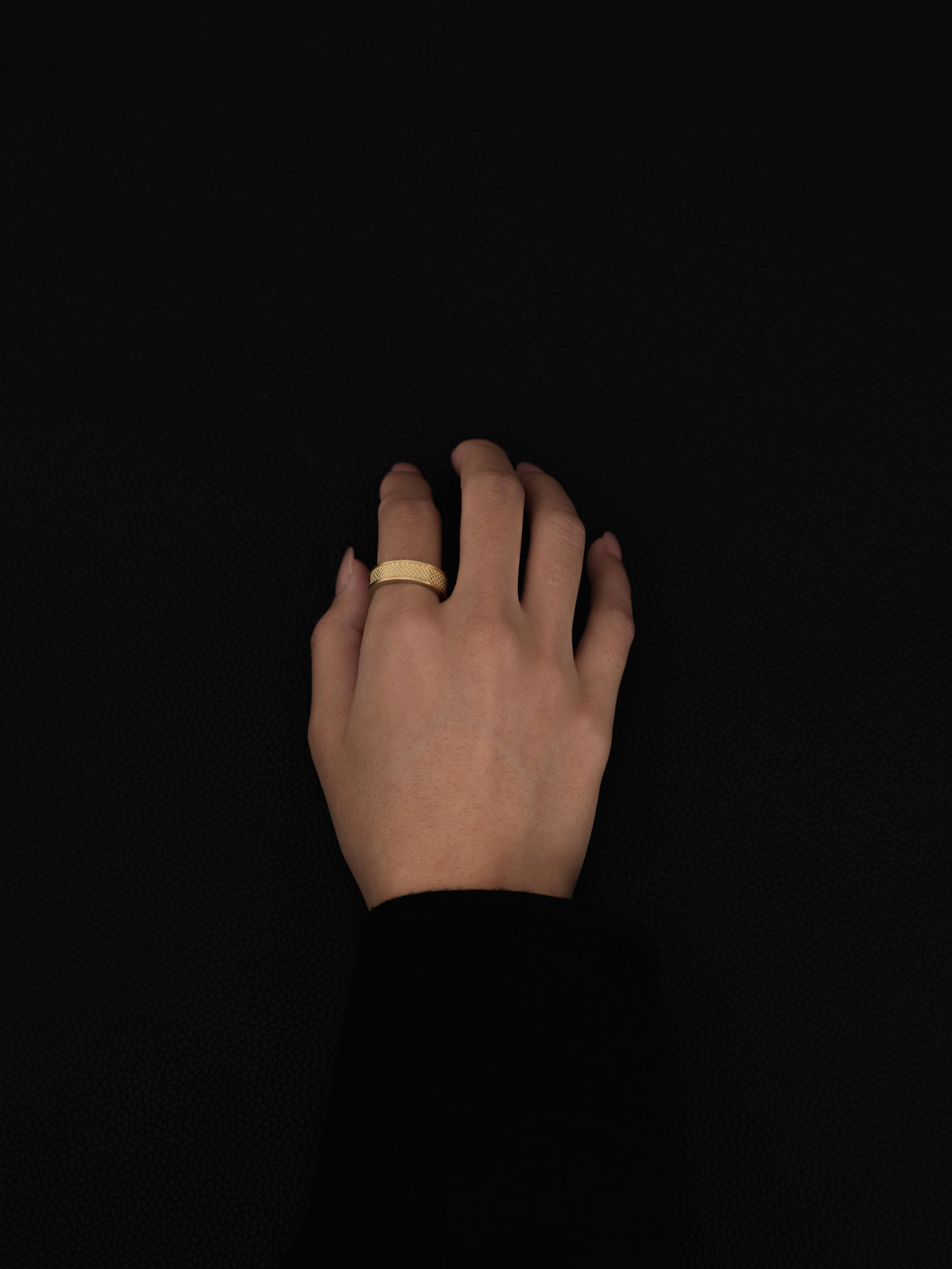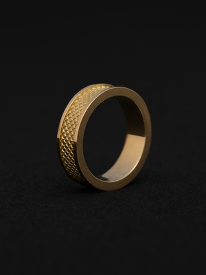 RHODES|ローズ 18Kゴールド製のバンドリング。オリジナルスタッズデザイン。 ローズは2021年にファビュラスサウンズのディレクター、吉田量によって設立したブランド。インスピレーションをキーワードに、多彩なデザインのジュエリーを展開。 日本製 18Kゴールド 幅|6mm アイテムナンバー|RHODES074