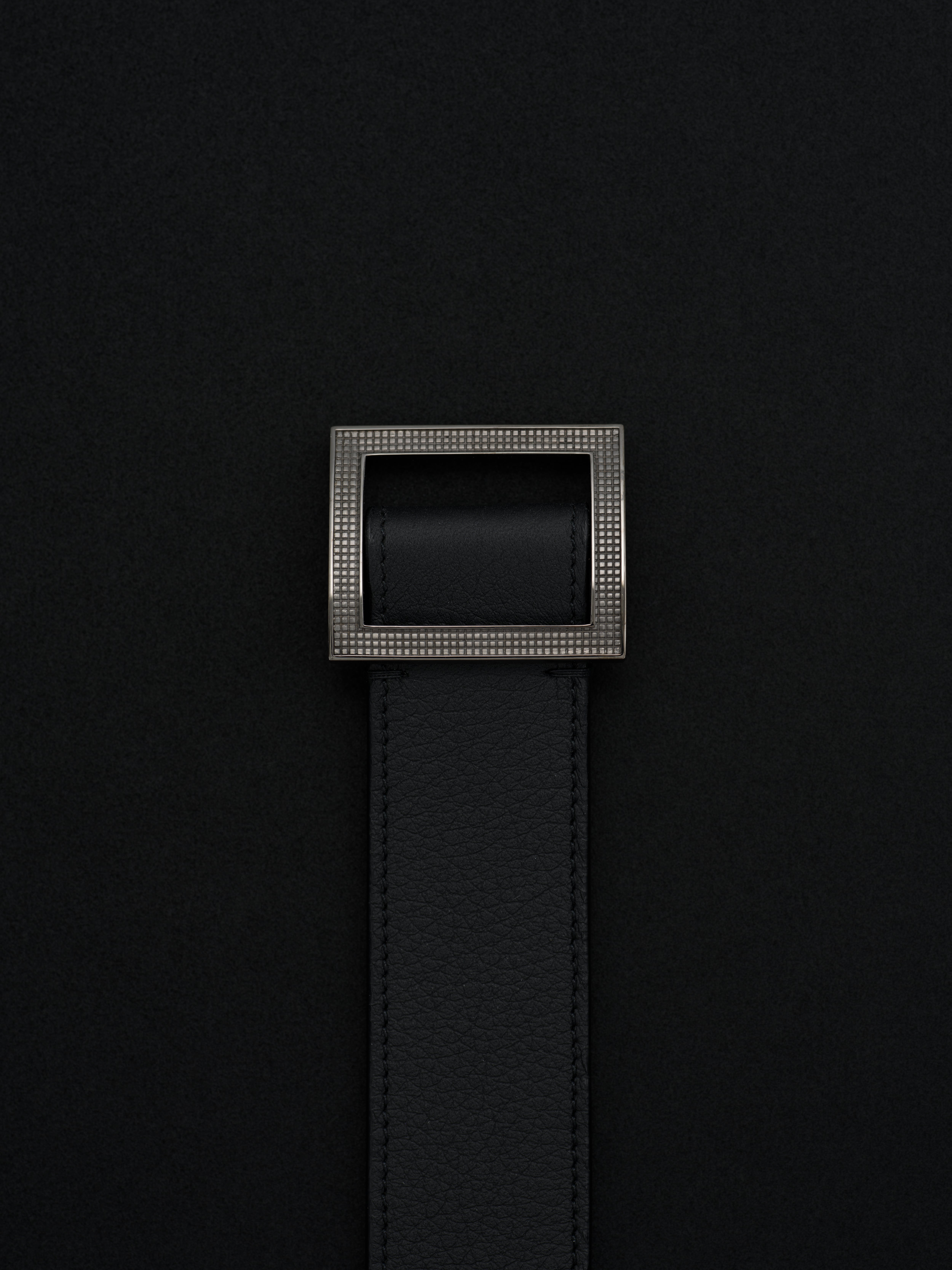 フランス産のグレインレザー製ベルト、シルバー製バックル、ブラックコーティング。