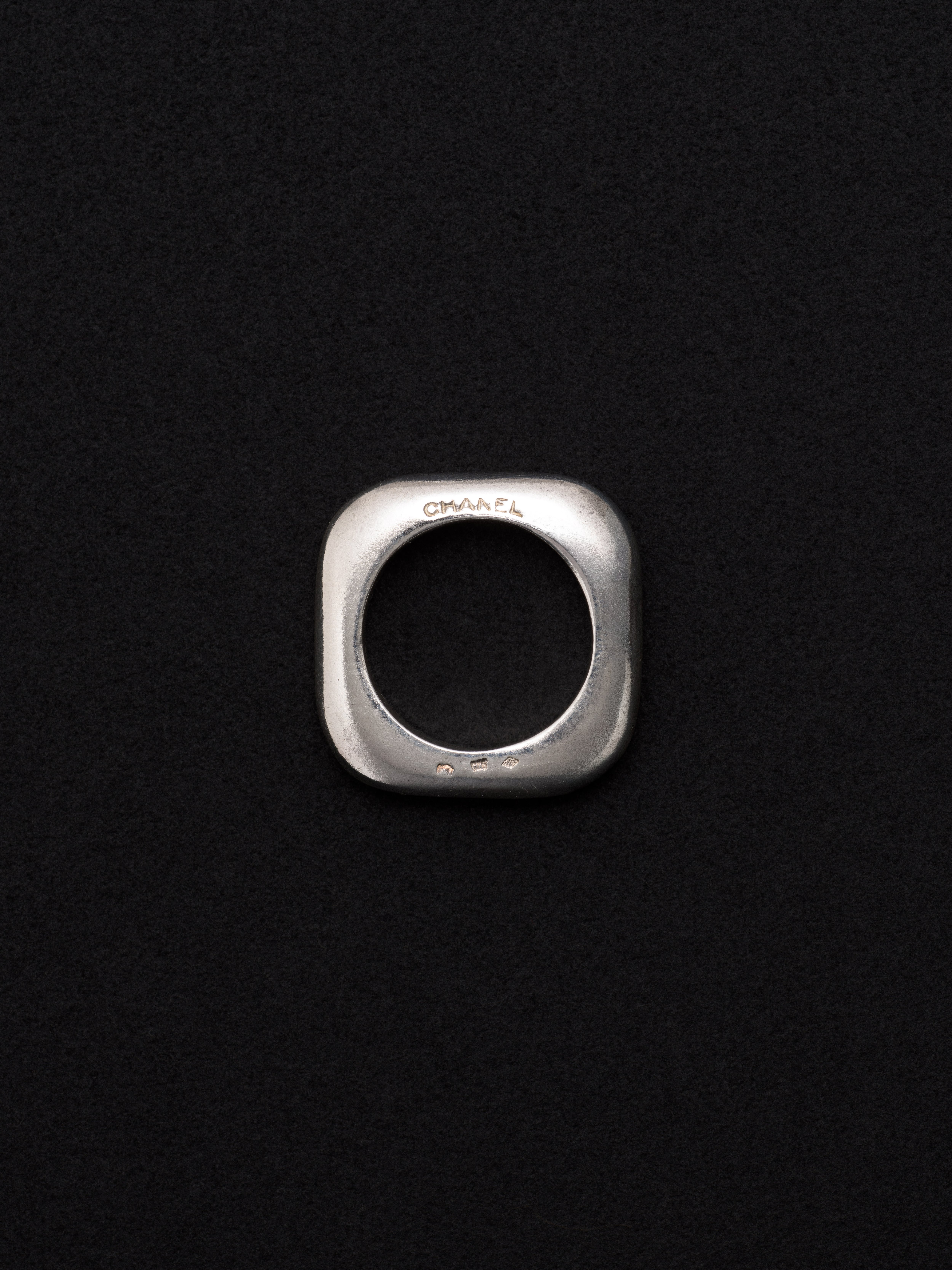 〈CHANEL〉 シャネルのアーカイブにおいて、希少な存在といえるソリッドシルバーのリング。 多くのコレクションで合金を用いたコスチュームジュエリーを展開してきた〈CHANEL〉の中で、925シルバーを素材にしたピースはごくわずかです。 ミニマルなスクエアフォルムが手元に静かな存在感を添え、ブランドの洗練された造形美をより純粋な素材で表現しています。 フランス製 シルバー925 サイズ|JP 13 アイテムナンバー|R2417