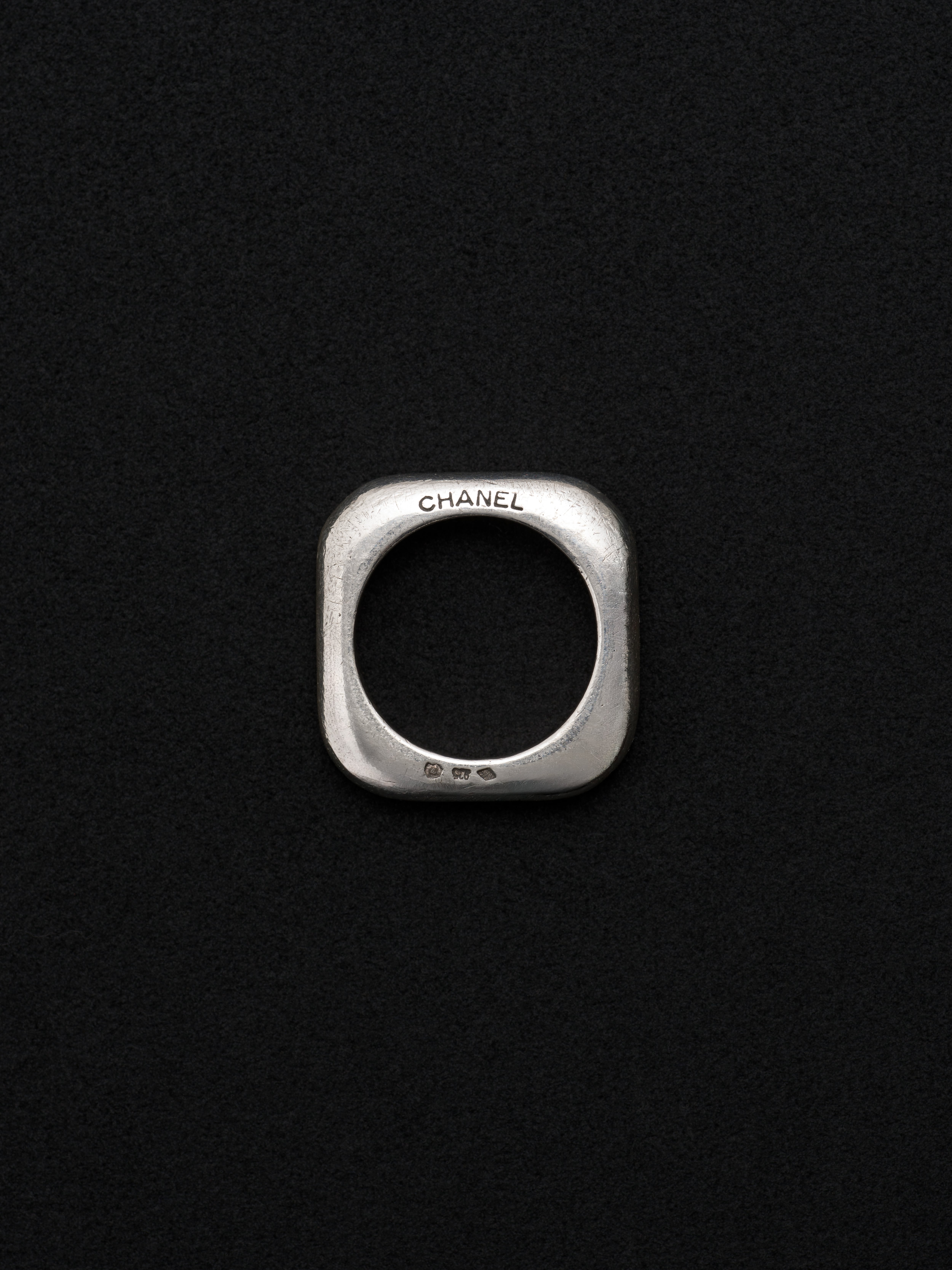 〈CHANEL〉 シャネルのアーカイブにおいて、希少な存在といえるソリッドシルバーのリング。 多くのコレクションで合金を用いたコスチュームジュエリーを展開してきた〈CHANEL〉の中で、925シルバーを素材にしたピースはごくわずかです。 ミニマルなスクエアフォルムが手元に静かな存在感を添え、ブランドの洗練された造形美をより純粋な素材で表現しています。 フランス製 シルバー925 サイズ|JP 15.5 アイテムナンバー|R2421