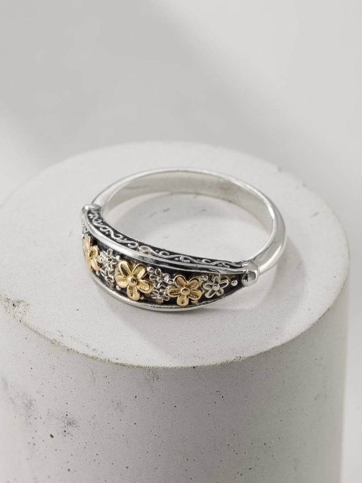 Gerochristo|ジェロクリスト シルバーと18Kゴールド製のリング、フラワーモチーフ。 ギリシアに拠点を置くジェロクリストは、古典芸術様式であるビザンチンに影響を受けた伝統的な装飾技術を用い、クラシックとモダンが調和する独自のデザインでジュエリーを創り上げています。 ギリシア製 シルバー925|18Kゴールド アイテムナンバー|GR137