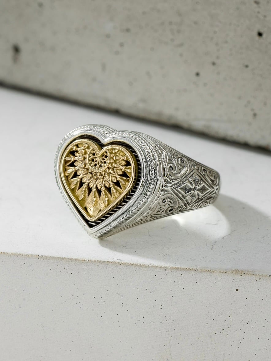 Gerochristo|ジェロクリスト シルバーと18Kゴールド製のリング。 ギリシアに拠点を置くジェロクリストは、古典芸術様式であるビザンチンに影響を受けた伝統的な装飾技術を用い、クラシックとモダンが調和する独自のデザインでジュエリーを創り上げています。 ギリシア製 シルバー925|18Kゴールド サイズ|JP 15 アイテムナンバー|GR138