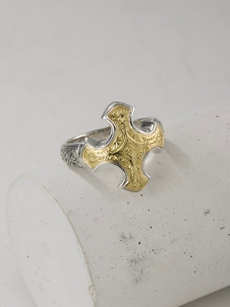 Gerochristo|ジェロクリスト シルバーと18Kゴールド製のリング。 ギリシアに拠点を置くジェロクリストは、古典芸術様式であるビザンチンに影響を受けた伝統的な装飾技術を用い、クラシックとモダンが調和する独自のデザインでジュエリーを創り上げています。 ギリシア製 シルバー925|18Kゴールド サイズ|JP 16 アイテムナンバー|GR124