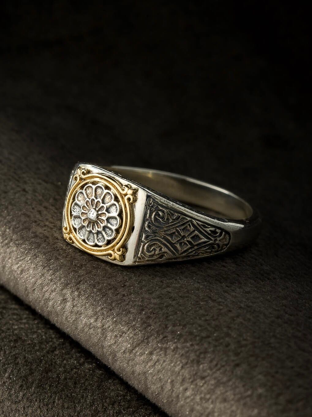 Gerochristo|ジェロクリスト シルバーと18Kゴールド製のリング。 ギリシアに拠点を置くジェロクリストは、古典芸術様式であるビザンチンに影響を受けた伝統的な装飾技術を用い、クラシックとモダンが調和する独自のデザインでジュエリーを創り上げています。 ギリシア製 シルバー925|18Kゴールド サイズ|JP 14.5 アイテムナンバー|GR128