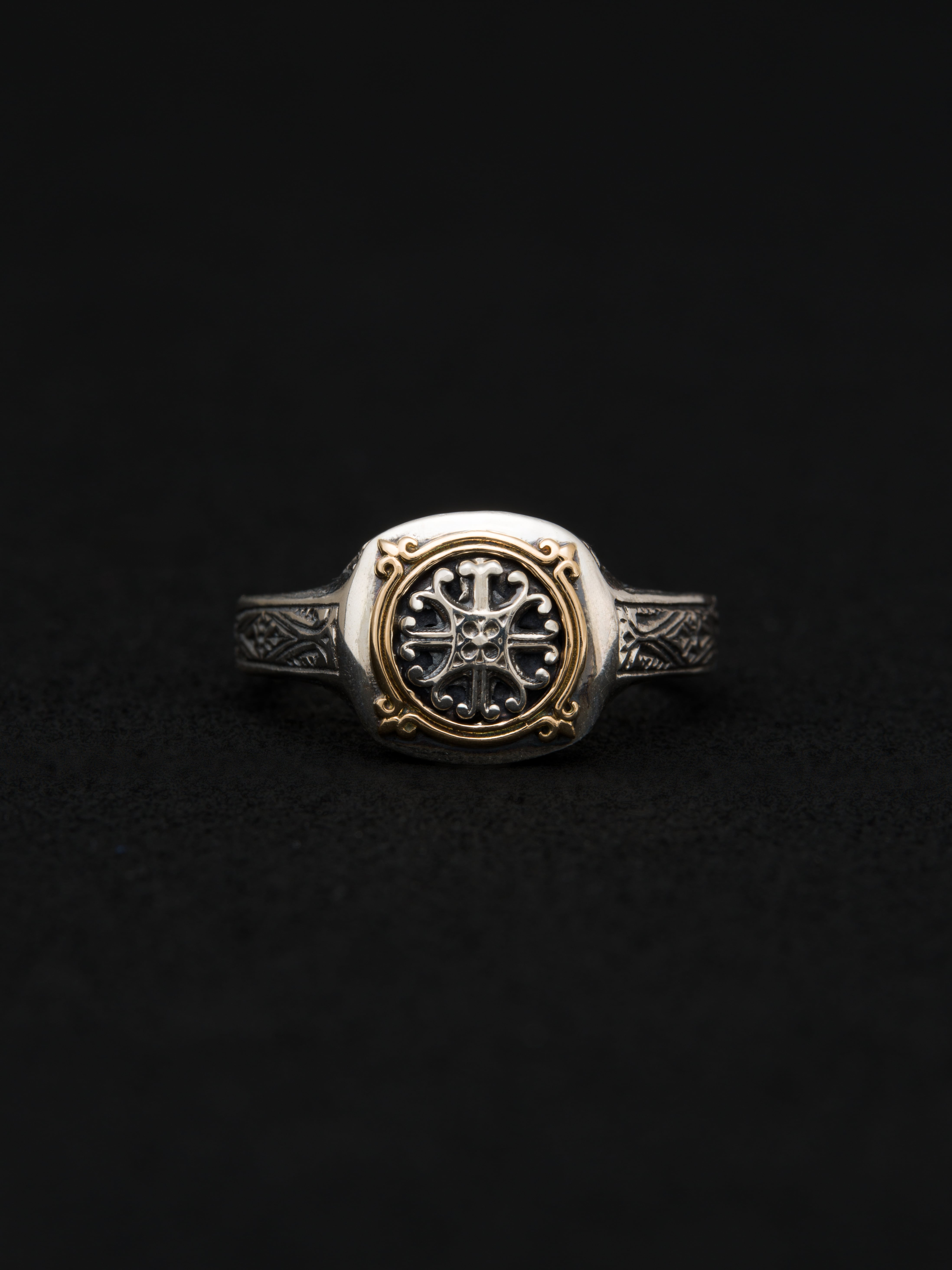 Gerochristo|ジェロクリスト シルバーと18Kゴールド製のリング。 ギリシアに拠点を置くジェロクリストは、古典芸術様式であるビザンチンに影響を受けた伝統的な装飾技術を用い、クラシックとモダンが調和する独自のデザインでジュエリーを創り上げています。 ギリシア製 シルバー925|18Kゴールド サイズ|JP 16 アイテムナンバー|GR129