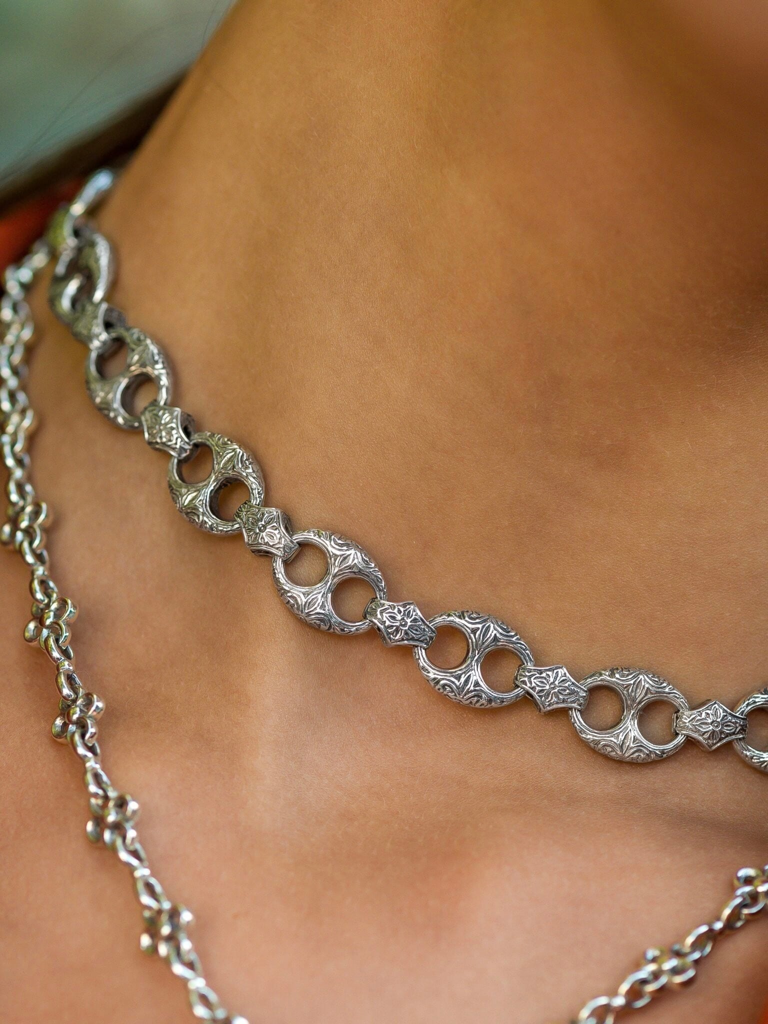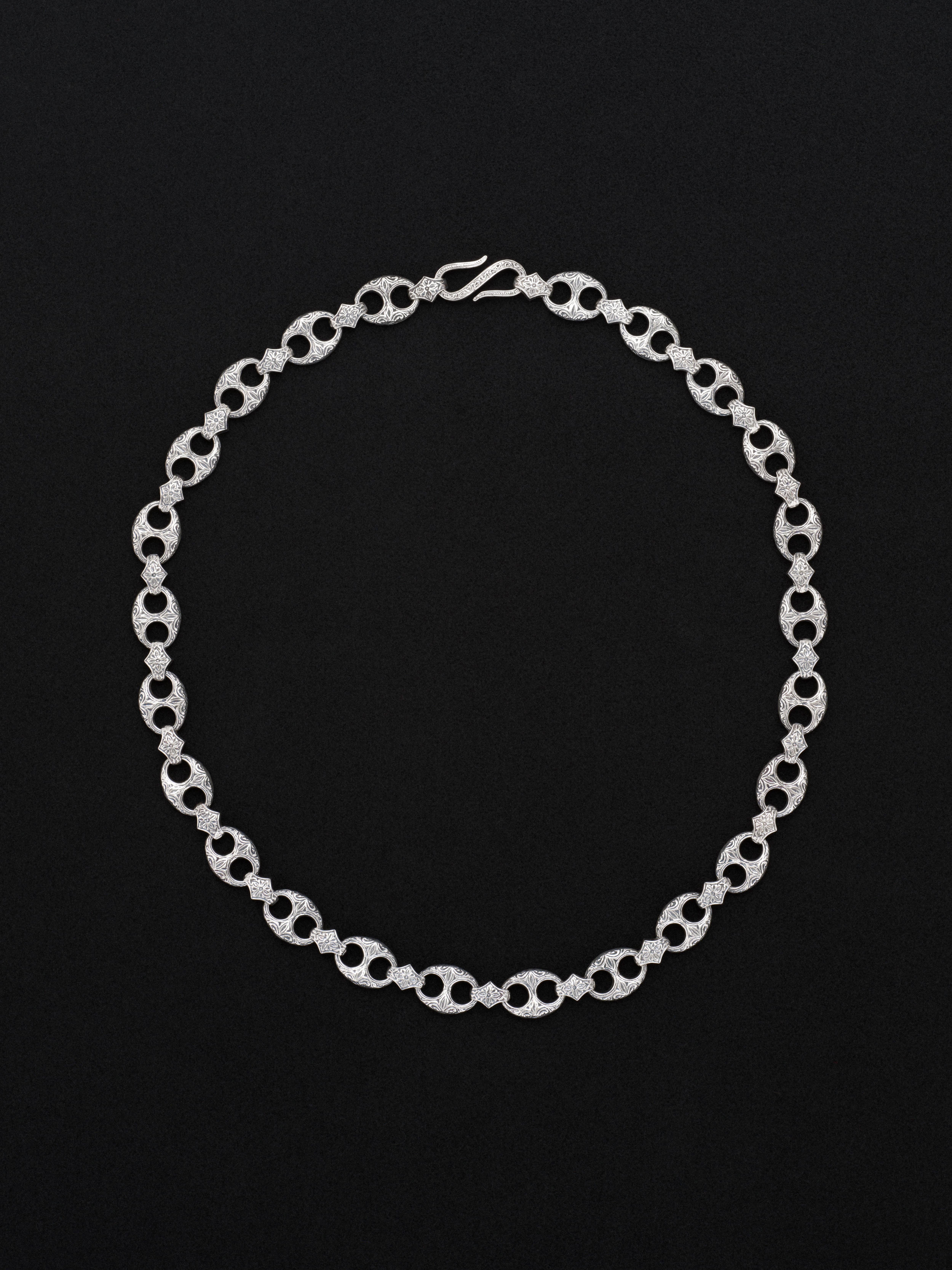 Gerochristo|ジェロクリスト シルバー製のネックレス。 ギリシアに拠点を置くジェロクリストは、古典芸術様式であるビザンチンに影響を受けた伝統的な装飾技術を用い、クラシックとモダンが調和する独自のデザインでジュエリーを創り上げています。 ギリシア製 シルバー925 全長 : 50cm|幅 : 1.1cm アイテムナンバー|GN013
