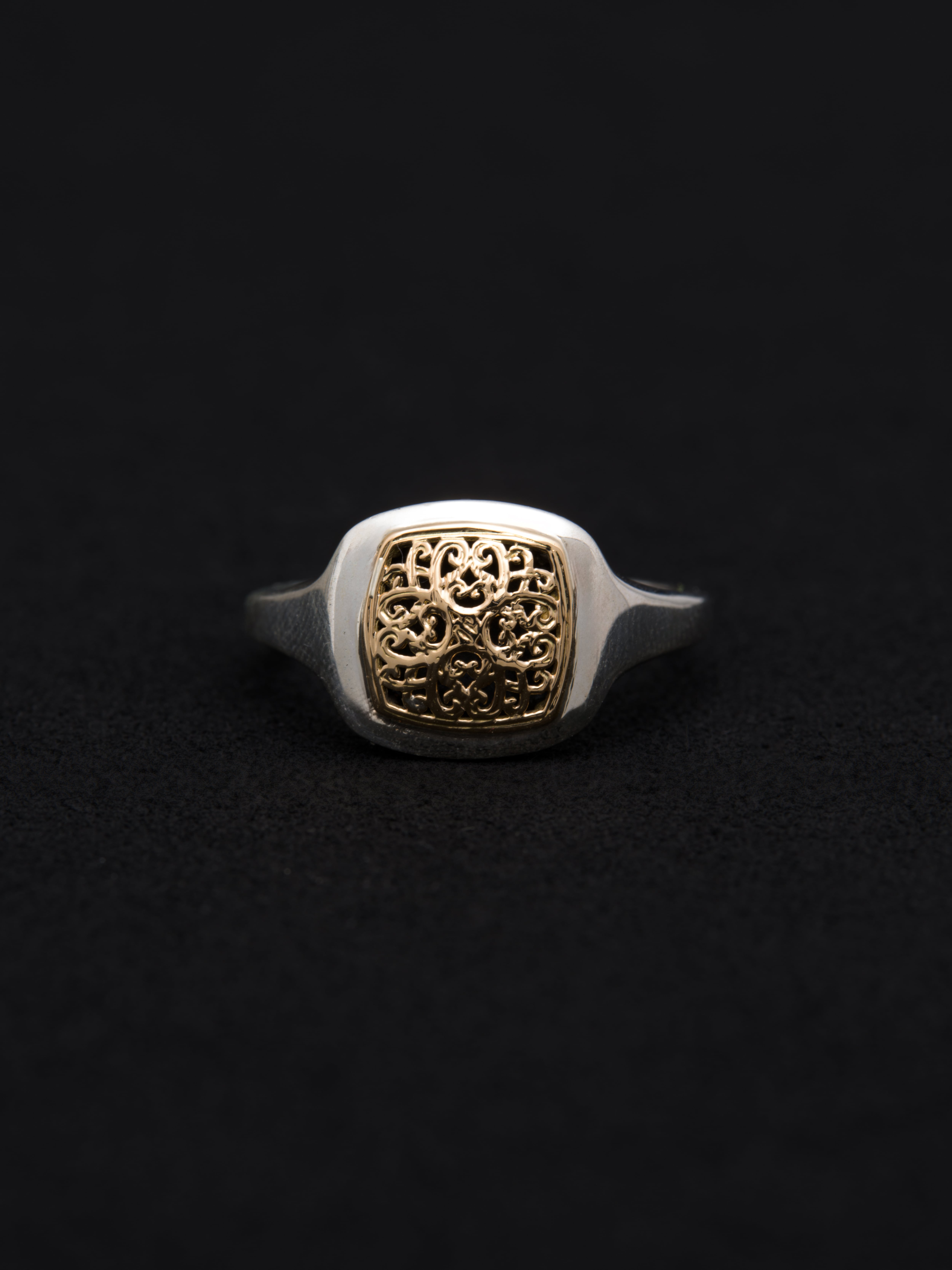 Gerochristo|ジェロクリスト シルバーと18Kゴールド製のリング。 ギリシアに拠点を置くジェロクリストは、古典芸術様式であるビザンチンに影響を受けた伝統的な装飾技術を用い、クラシックとモダンが調和する独自のデザインでジュエリーを創り上げています。 ギリシア製 シルバー925|18Kゴールド サイズ|JP 18 アイテムナンバー|GR151