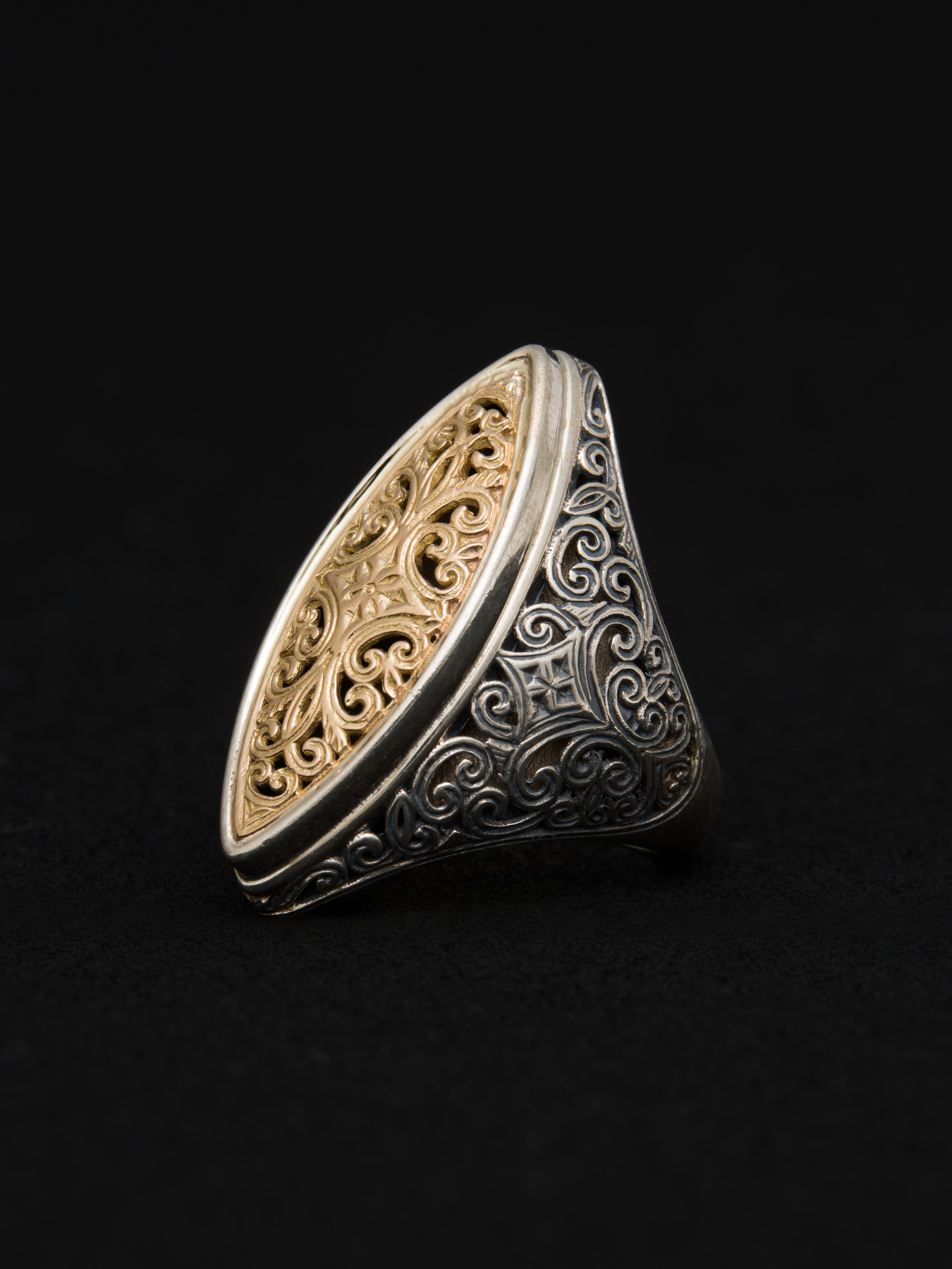 Gerochristo|ジェロクリスト シルバーと18Kゴールド製のリング。 ギリシアに拠点を置くジェロクリストは、古典芸術様式であるビザンチンに影響を受けた伝統的な装飾技術を用い、クラシックとモダンが調和する独自のデザインでジュエリーを創り上げています。 ギリシア製 シルバー925|18Kゴールド アイテムナンバー|GR016