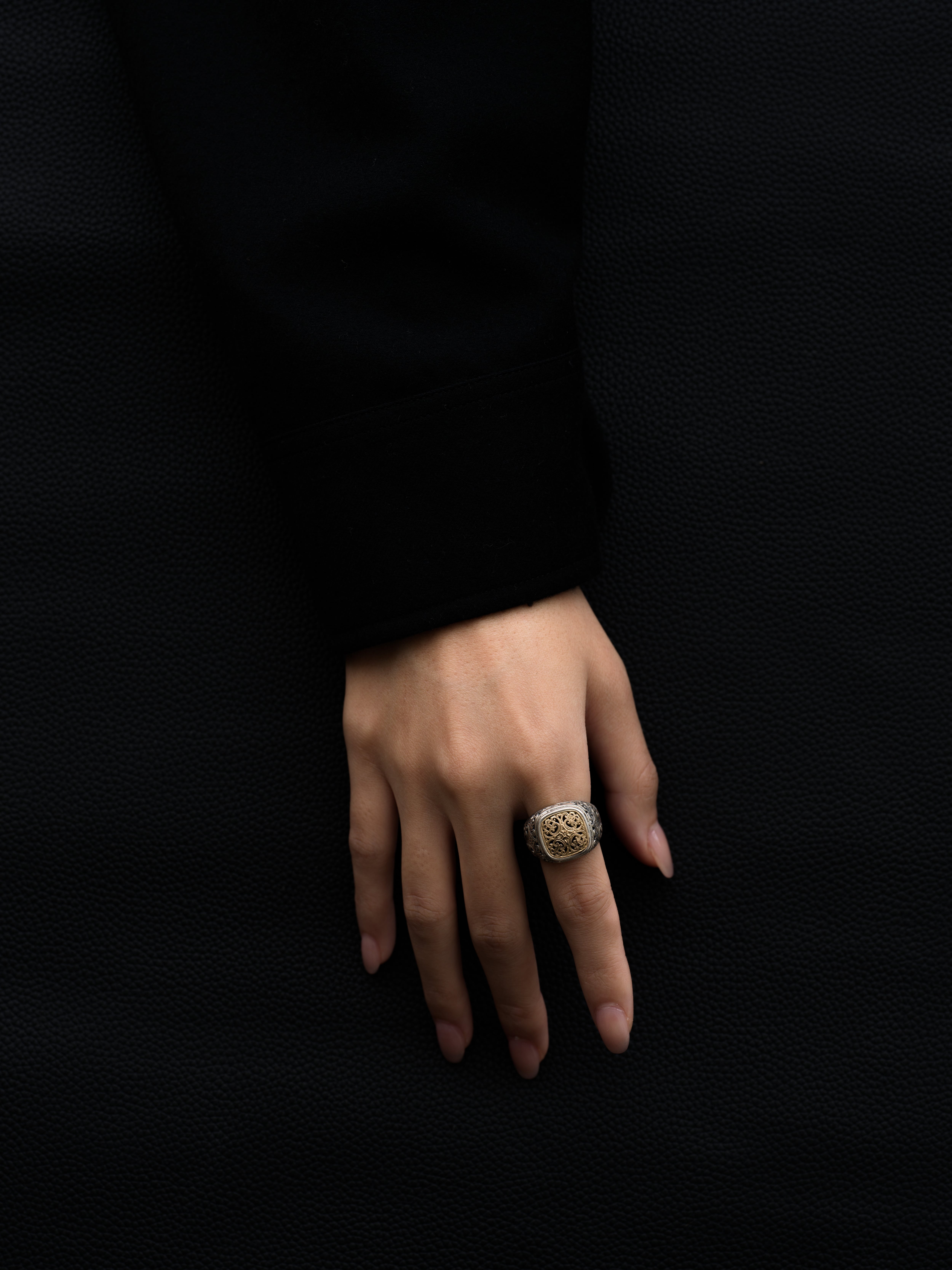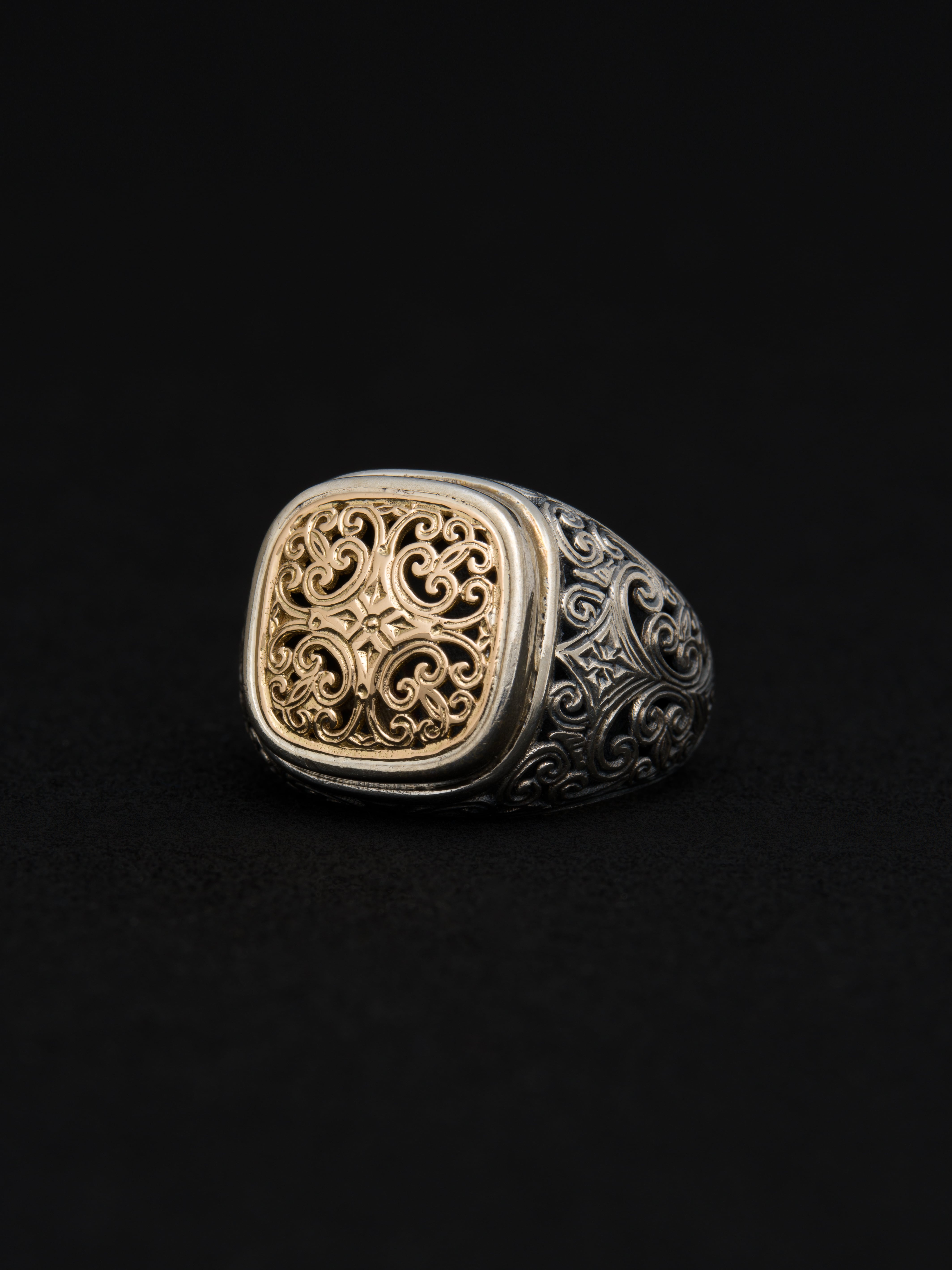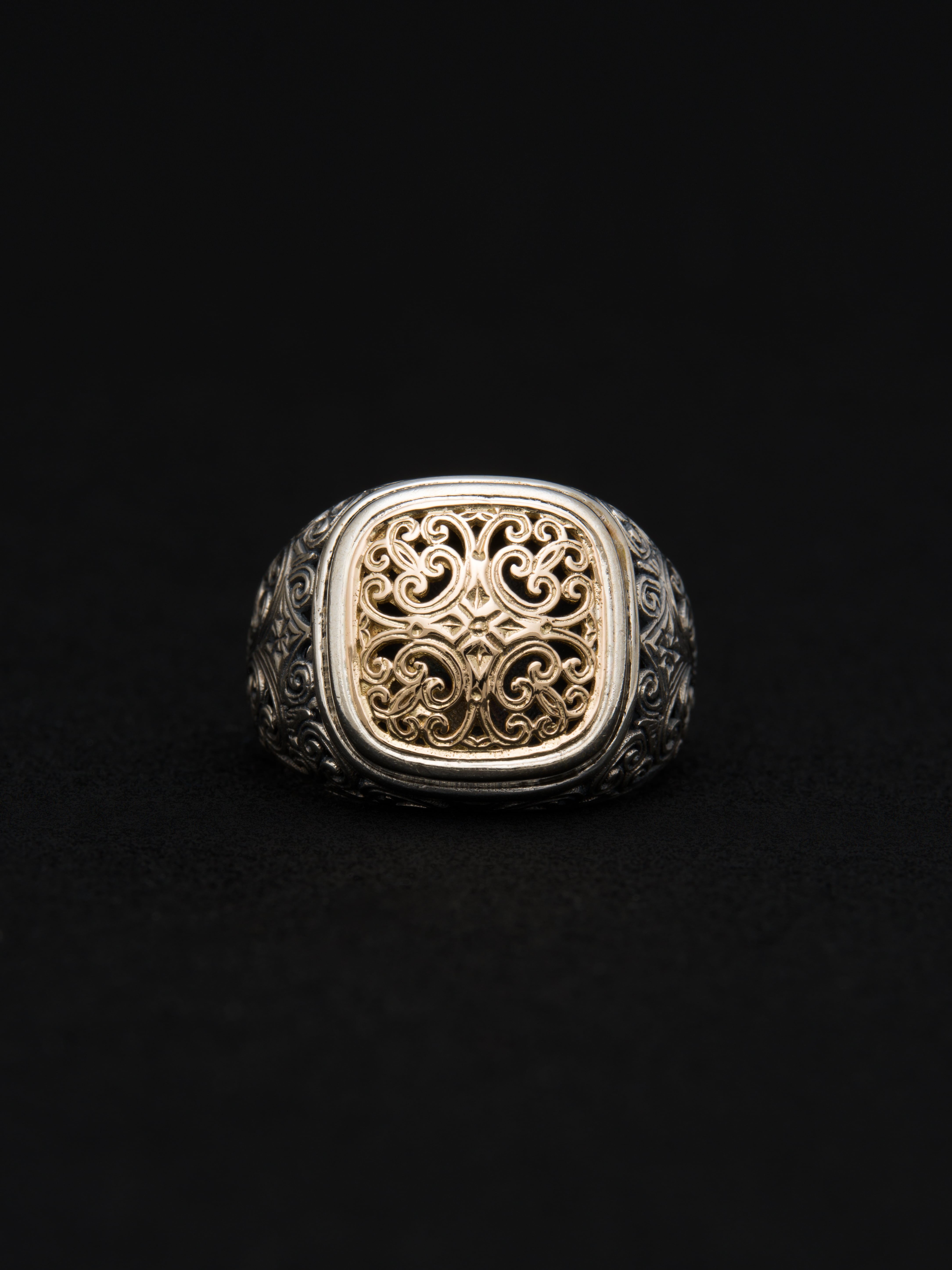Gerochristo|ジェロクリスト シルバーと18Kゴールド製のリング。 ギリシアに拠点を置くジェロクリストは、古典芸術様式であるビザンチンに影響を受けた伝統的な装飾技術を用い、クラシックとモダンが調和する独自のデザインでジュエリーを創り上げています。 ギリシア製 シルバー925|18Kゴールド アイテムナンバー|GR018