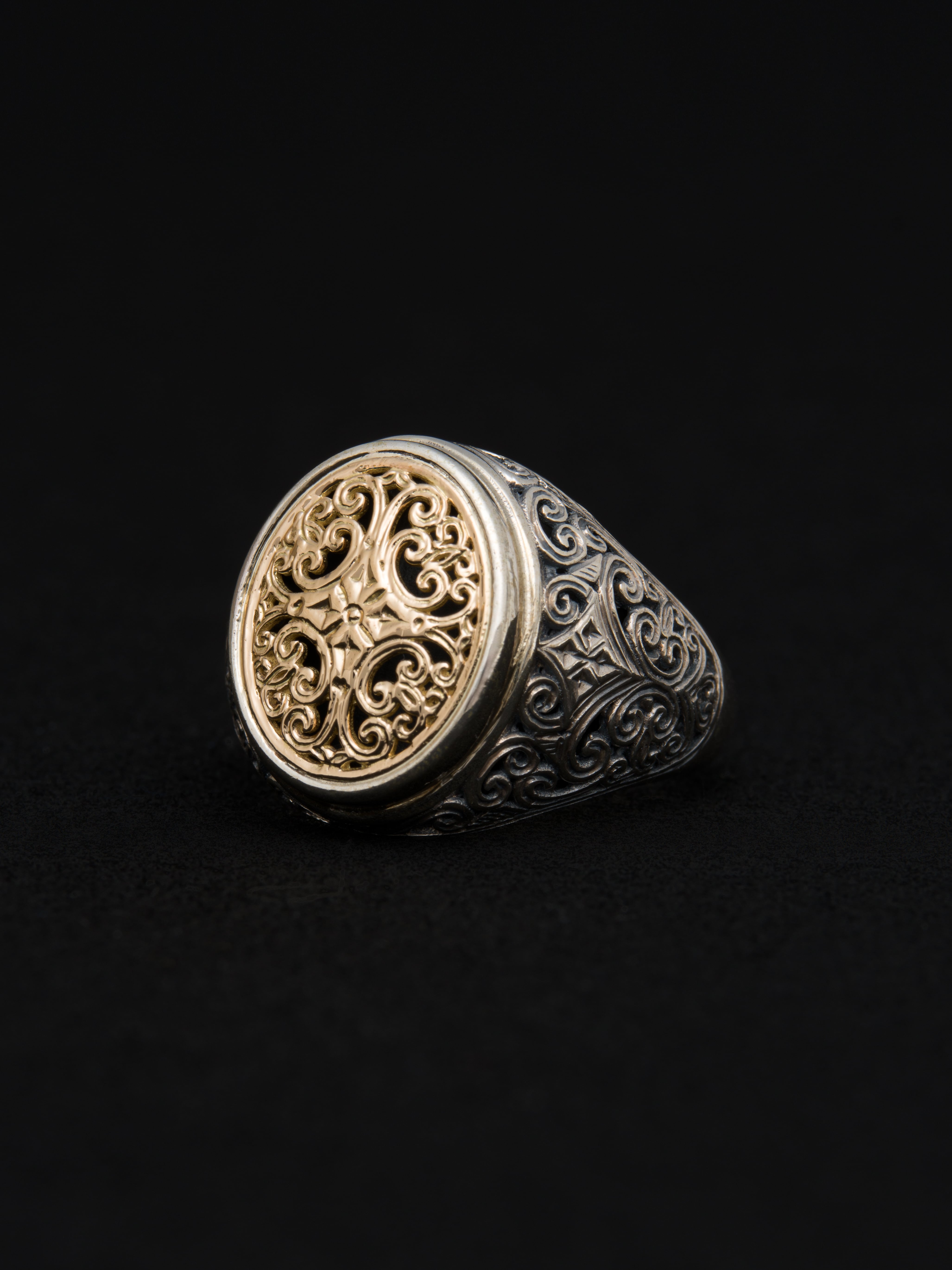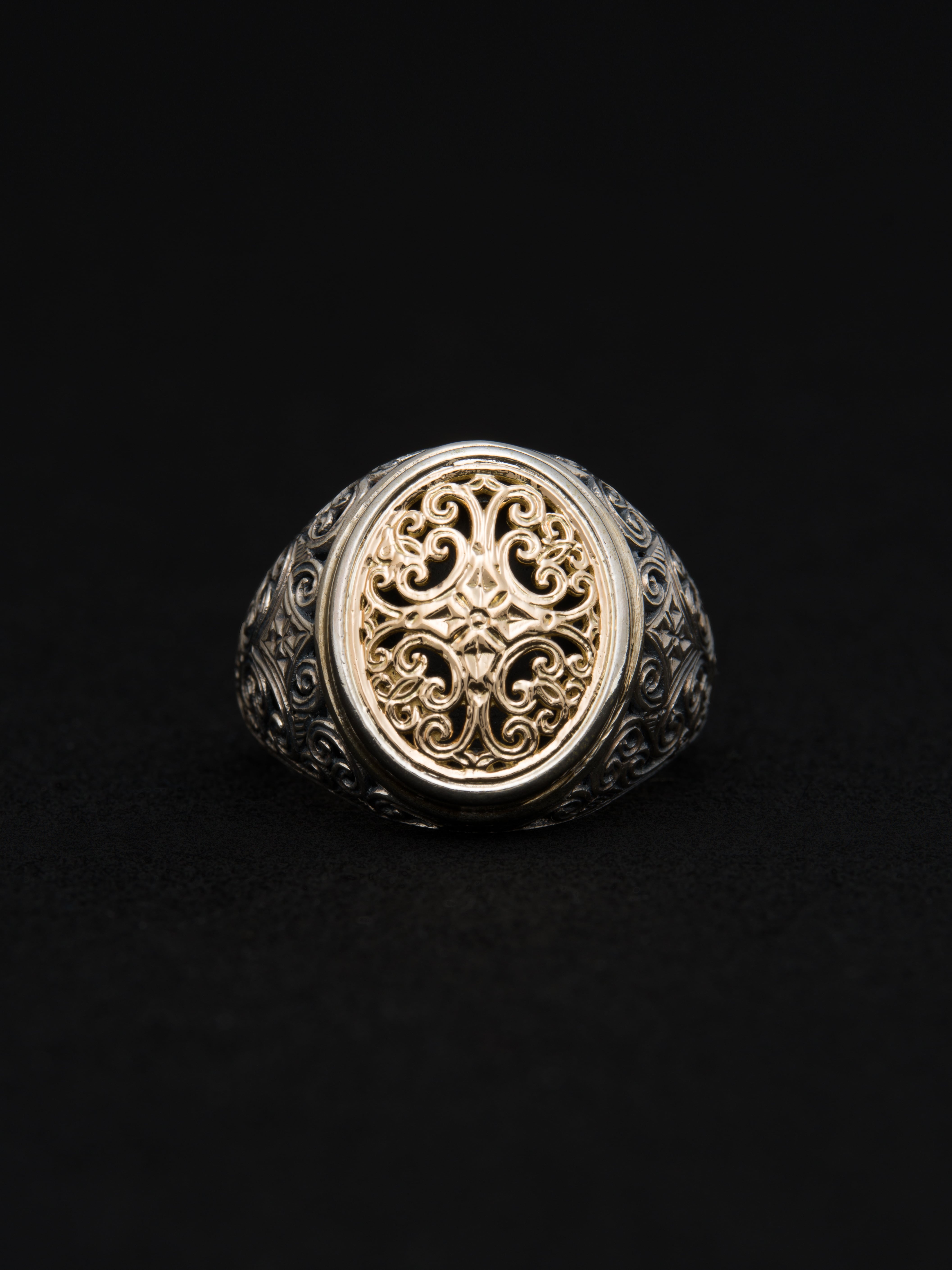 Gerochristo|ジェロクリスト シルバーと18Kゴールド製のリング。 ギリシアに拠点を置くジェロクリストは、古典芸術様式であるビザンチンに影響を受けた伝統的な装飾技術を用い、クラシックとモダンが調和する独自のデザインでジュエリーを創り上げています。 ギリシア製 シルバー925|18Kゴールド アイテムナンバー|GR019