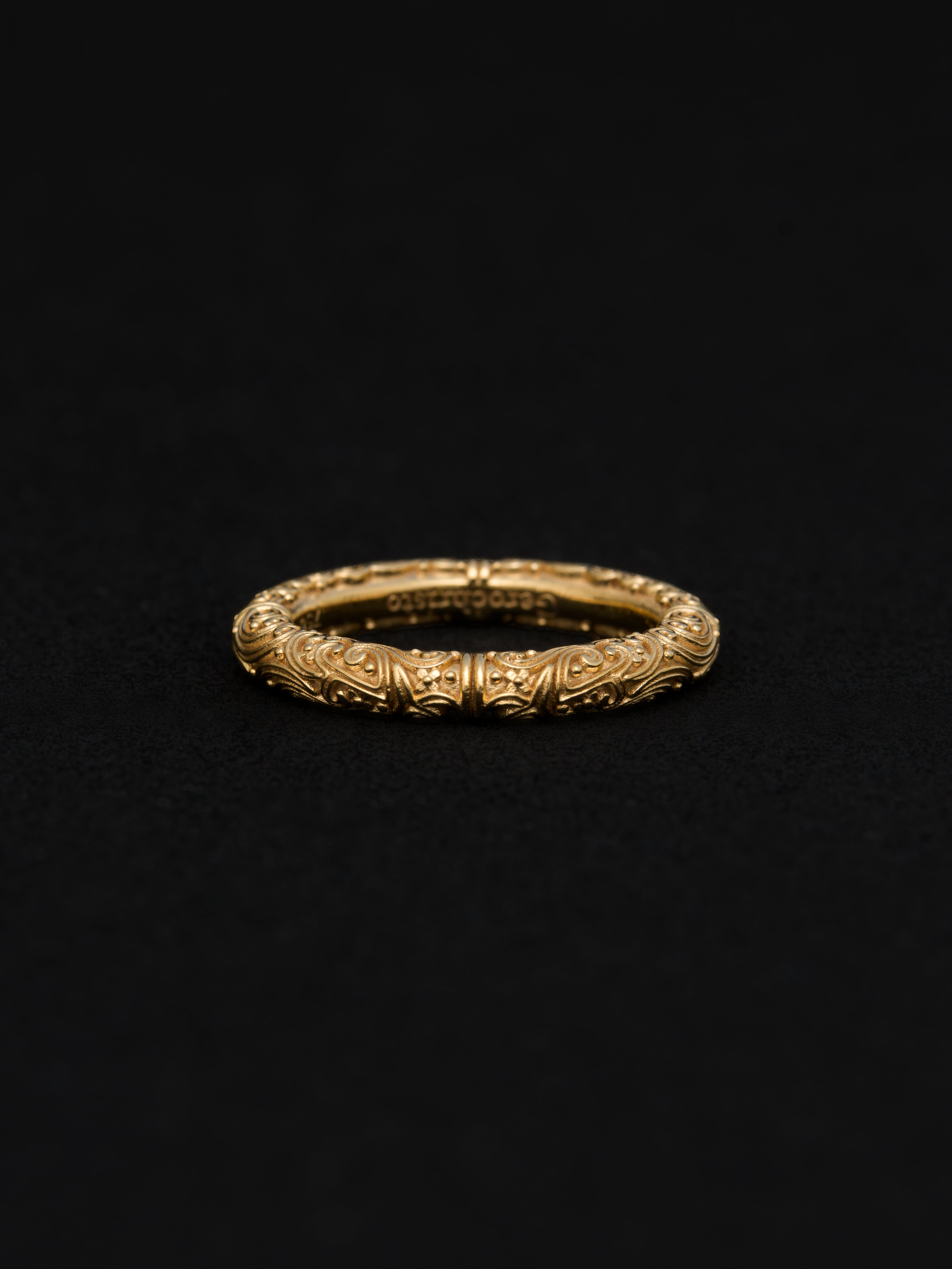 Gerochristo|ジェロクリスト 18Kゴールド製のバンドリング。 ギリシアに拠点を置くジェロクリストは、古典芸術様式であるビザンチンに影響を受けた伝統的な装飾技術を用い、クラシックとモダンが調和する独自のデザインでジュエリーを創り上げています。 ギリシア製 18Kゴールド 幅|3mm アイテムナンバー|GR025