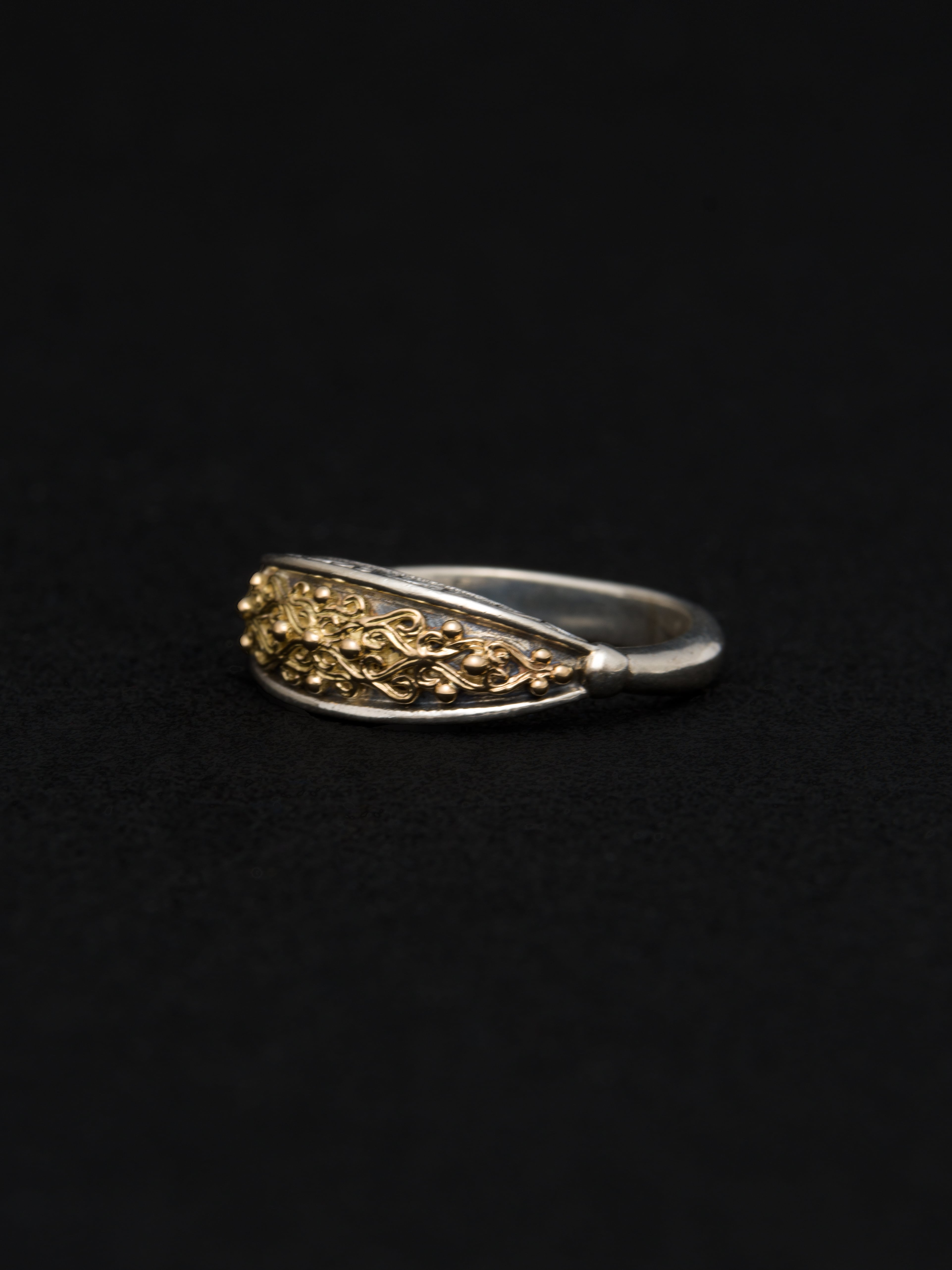Gerochristo|ジェロクリスト シルバーと18Kゴールド製のリング。 ギリシアに拠点を置くジェロクリストは、古典芸術様式であるビザンチンに影響を受けた伝統的な装飾技術を用い、クラシックとモダンが調和する独自のデザインでジュエリーを創り上げています。 ギリシア製 シルバー925|18Kゴールド アイテムナンバー|GR028