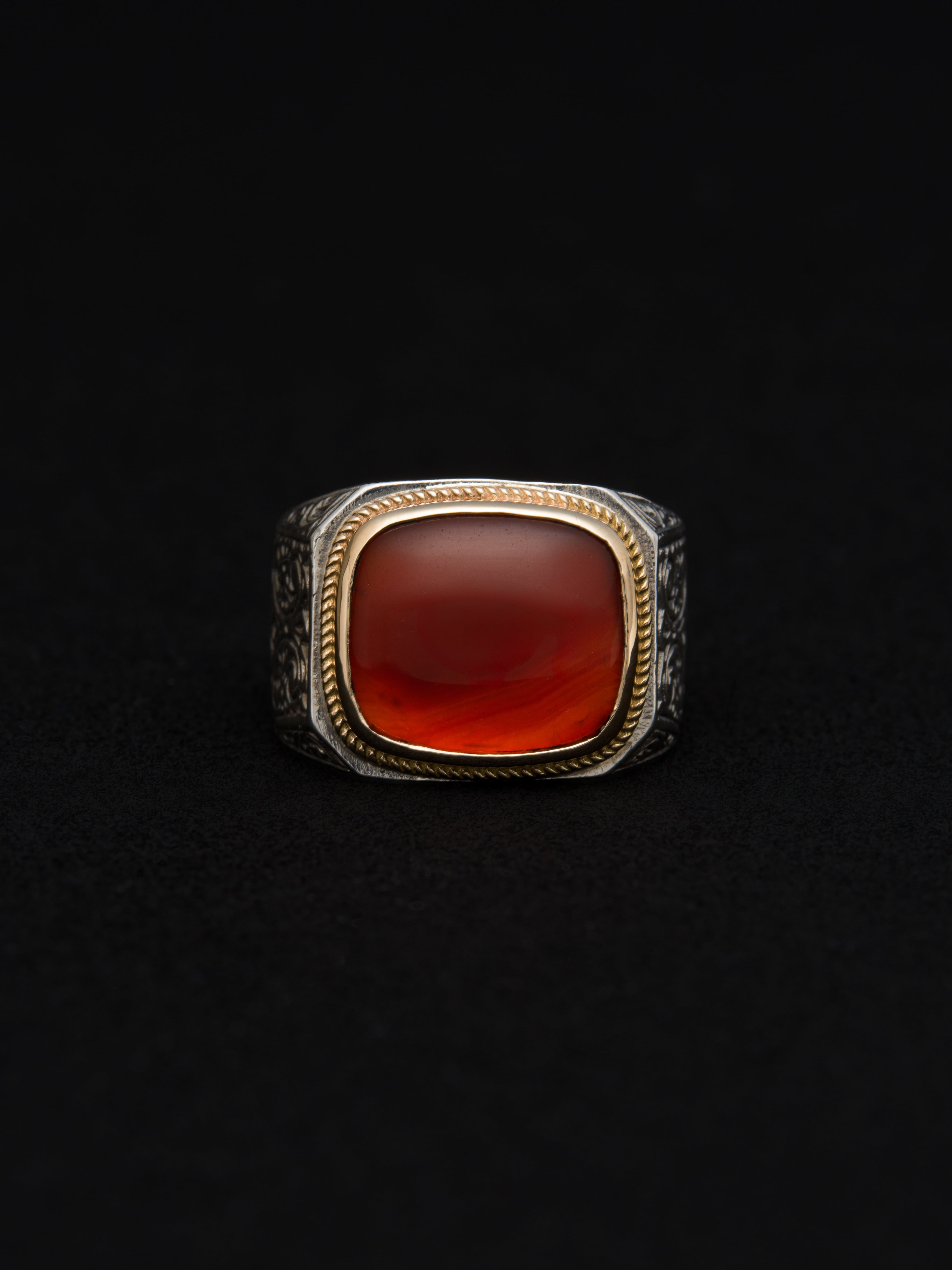 Gerochristo|ジェロクリスト シルバーと18Kゴールド製のリング、中央にカーネリアン。 ギリシアに拠点を置くジェロクリストは、古典芸術様式であるビザンチンに影響を受けた伝統的な装飾技術を用い、クラシックとモダンが調和する独自のデザインでジュエリーを創り上げています。 ギリシア製 シルバー925|18Kゴールド|カーネリアン サイズ|JP 22.5 アイテムナンバー|GR030