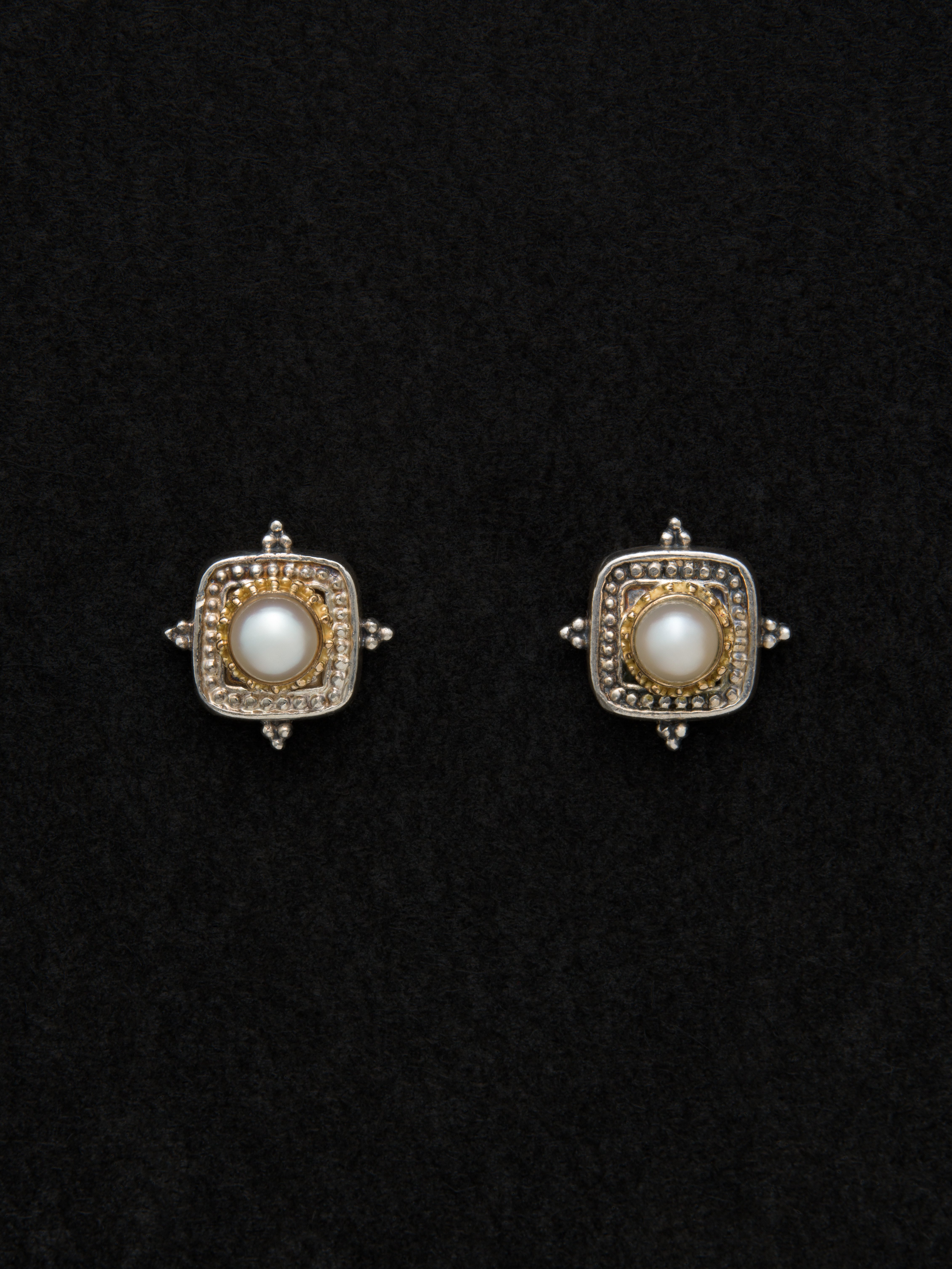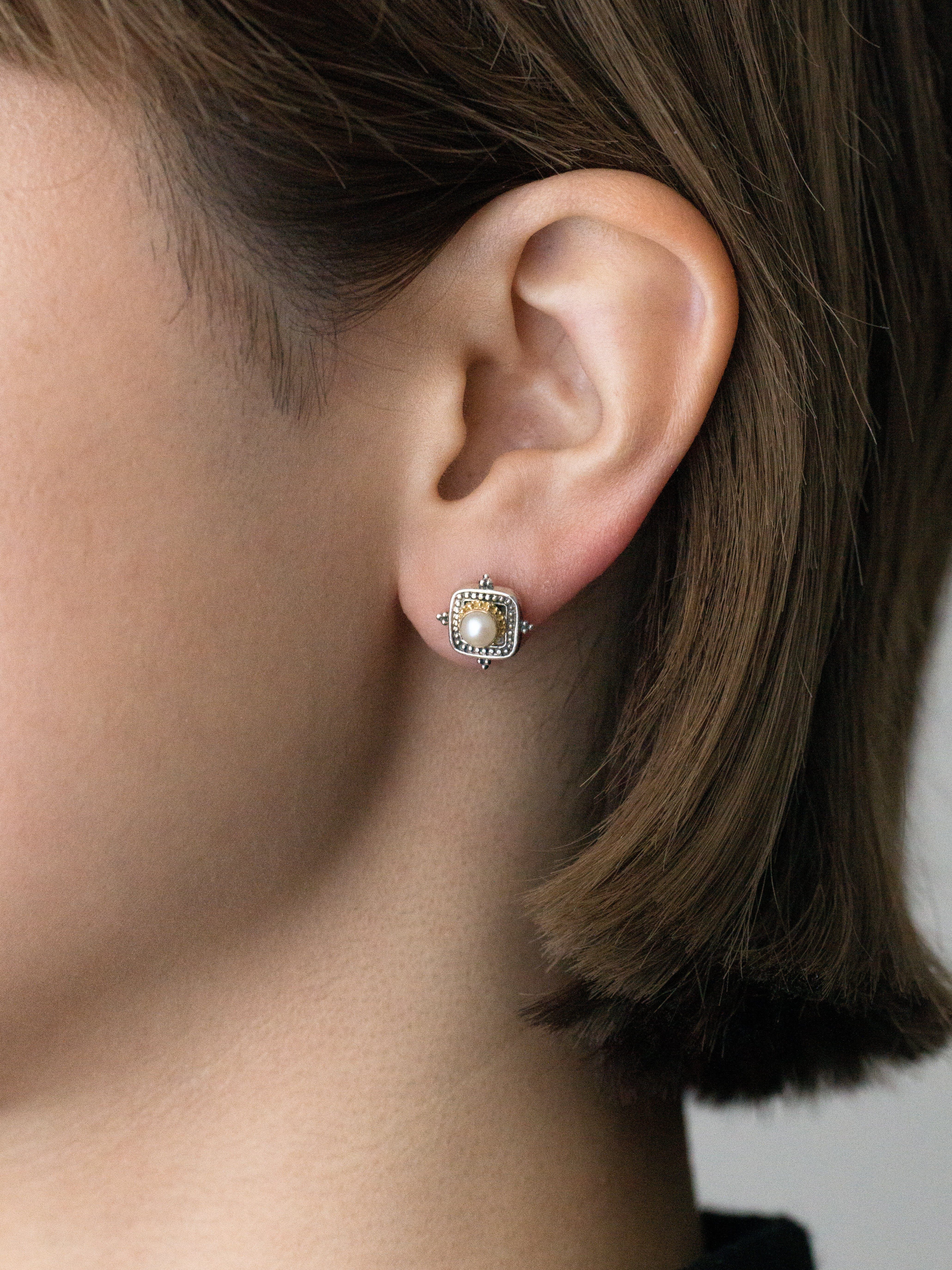 Gerochristo|ジェロクリスト シルバーと18Kゴールド製のピアス、中央にパール。 ギリシアに拠点を置くジェロクリストは、古典芸術様式であるビザンチンに影響を受けた伝統的な装飾技術を用い、クラシックとモダンが調和する独自のデザインでジュエリーを創り上げています。 ギリシア製 シルバー925|18Kゴールド|パール 1.2cm × 1.2cm アイテムナンバー|GA004 ペア(両耳)販売