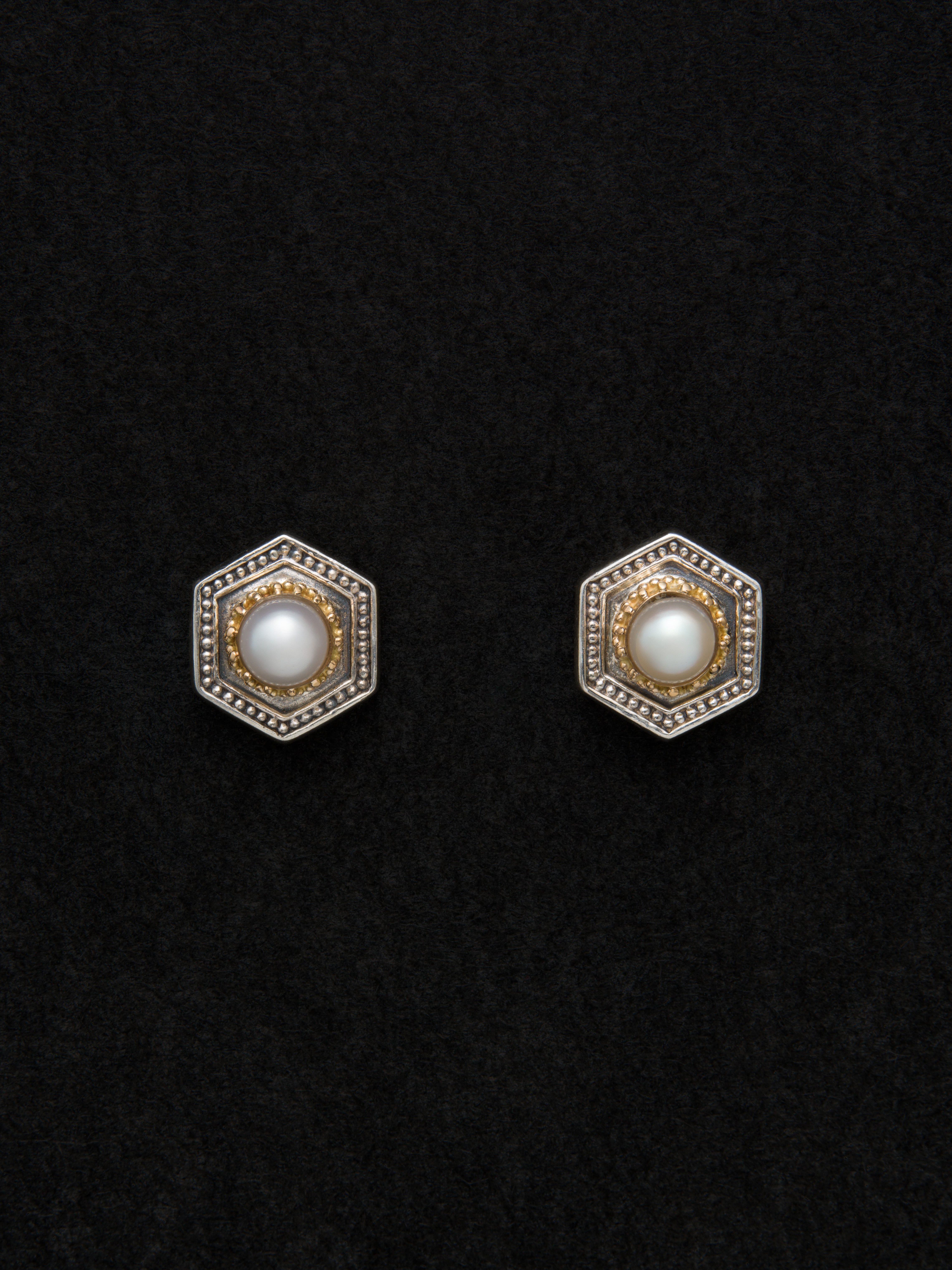 Gerochristo|ジェロクリスト シルバーと18Kゴールド製のピアス、中央にパール。 ギリシアに拠点を置くジェロクリストは、古典芸術様式であるビザンチンに影響を受けた伝統的な装飾技術を用い、クラシックとモダンが調和する独自のデザインでジュエリーを創り上げています。 ギリシア製 シルバー925|18Kゴールド|パール 1cm × 1cm アイテムナンバー|GA006 ペア(両耳)販売