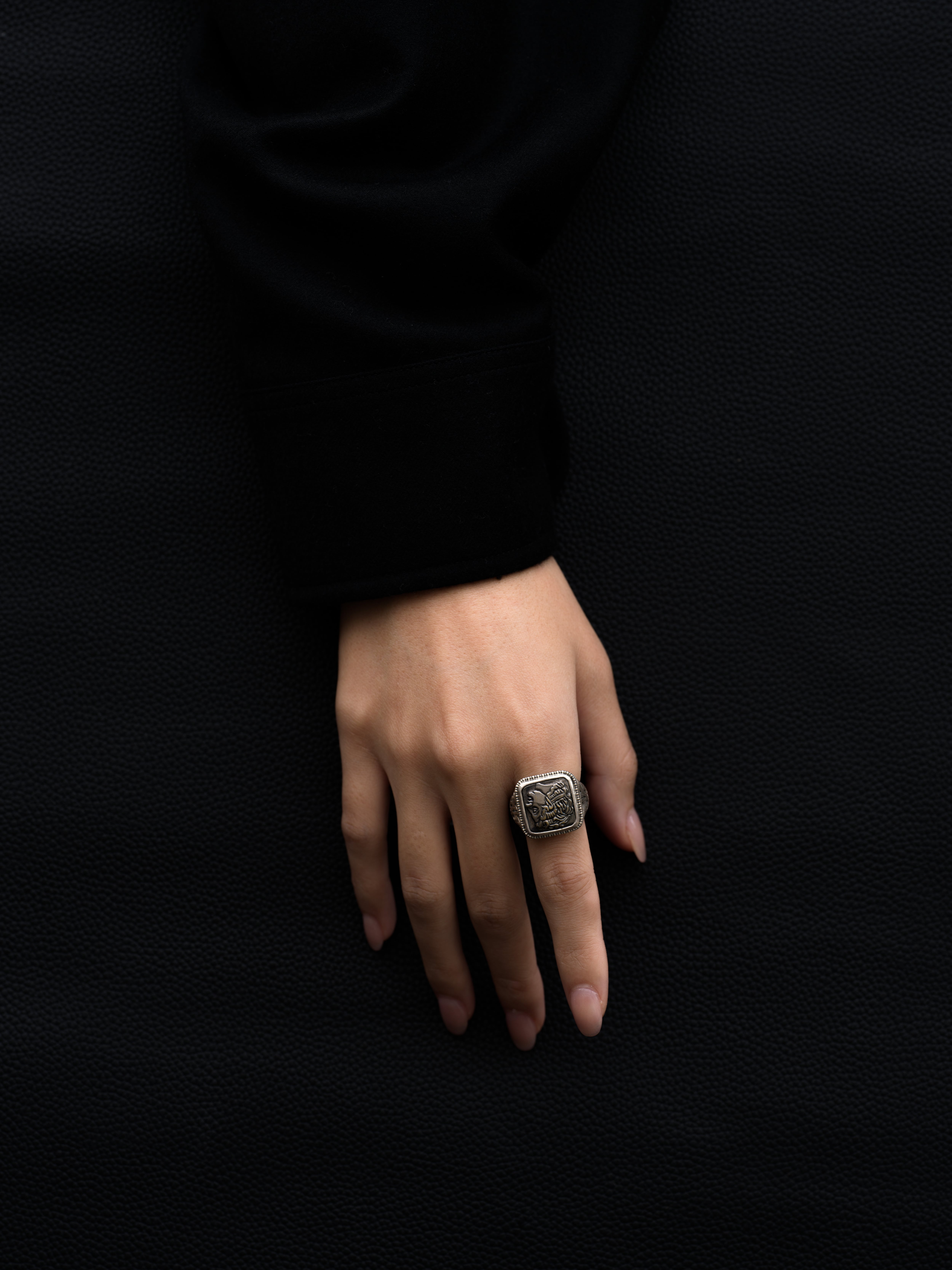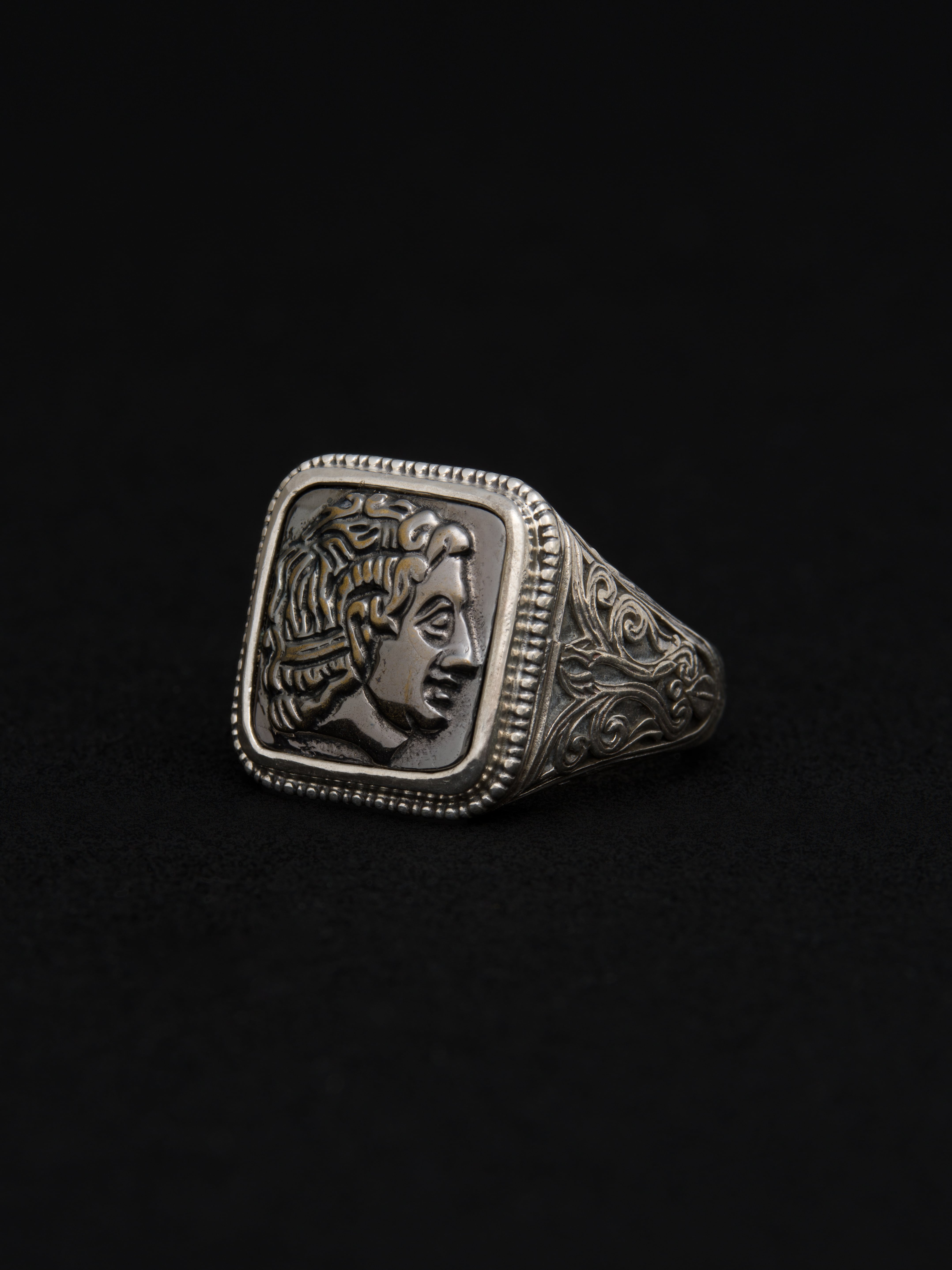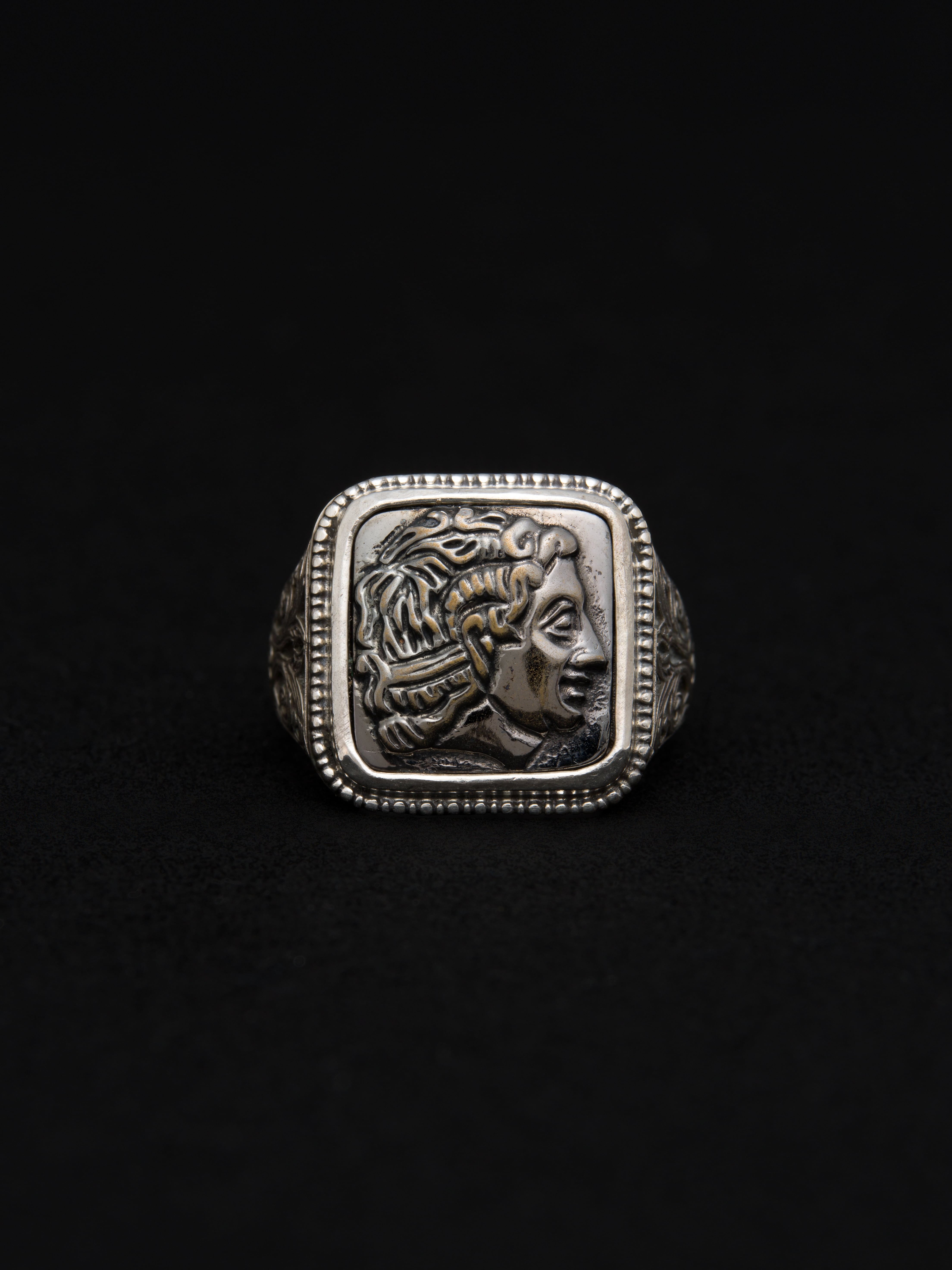 Gerochristo|ジェロクリスト シルバーとブロンズ製のリング、中央にアレキサンドロス3世の彫刻。 ギリシアに拠点を置くジェロクリストは、古典芸術様式であるビザンチンに影響を受けた伝統的な装飾技術を用い、クラシックとモダンが調和する独自のデザインでジュエリーを創り上げています。 ギリシア製 シルバー925|ブロンズ アイテムナンバー|GR052