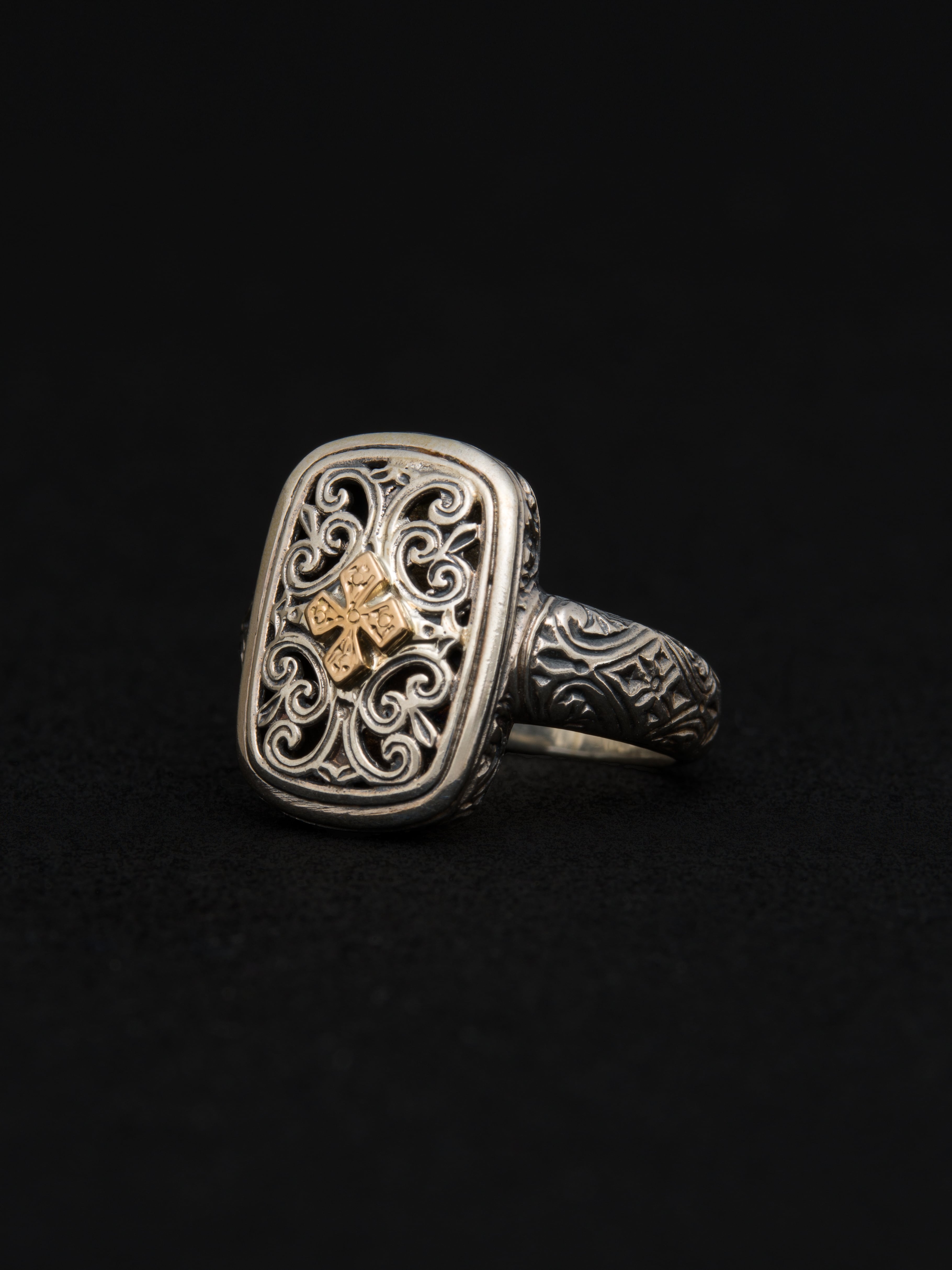 Gerochristo|ジェロクリスト シルバーと18Kゴールド製のリング。 ギリシアに拠点を置くジェロクリストは、古典芸術様式であるビザンチンに影響を受けた伝統的な装飾技術を用い、クラシックとモダンが調和する独自のデザインでジュエリーを創り上げています。 ギリシア製 シルバー925|18Kゴールド アイテムナンバー|GR046