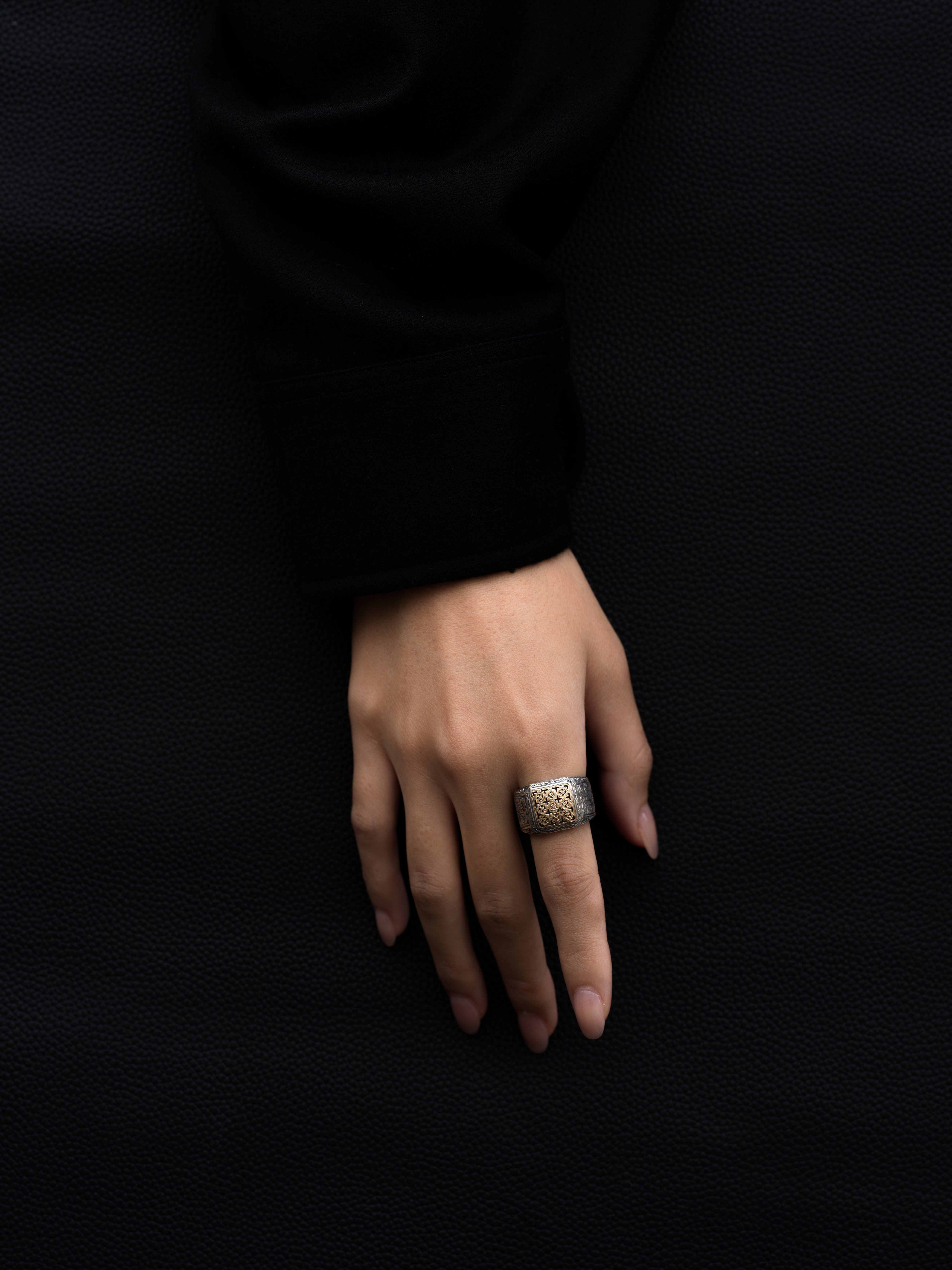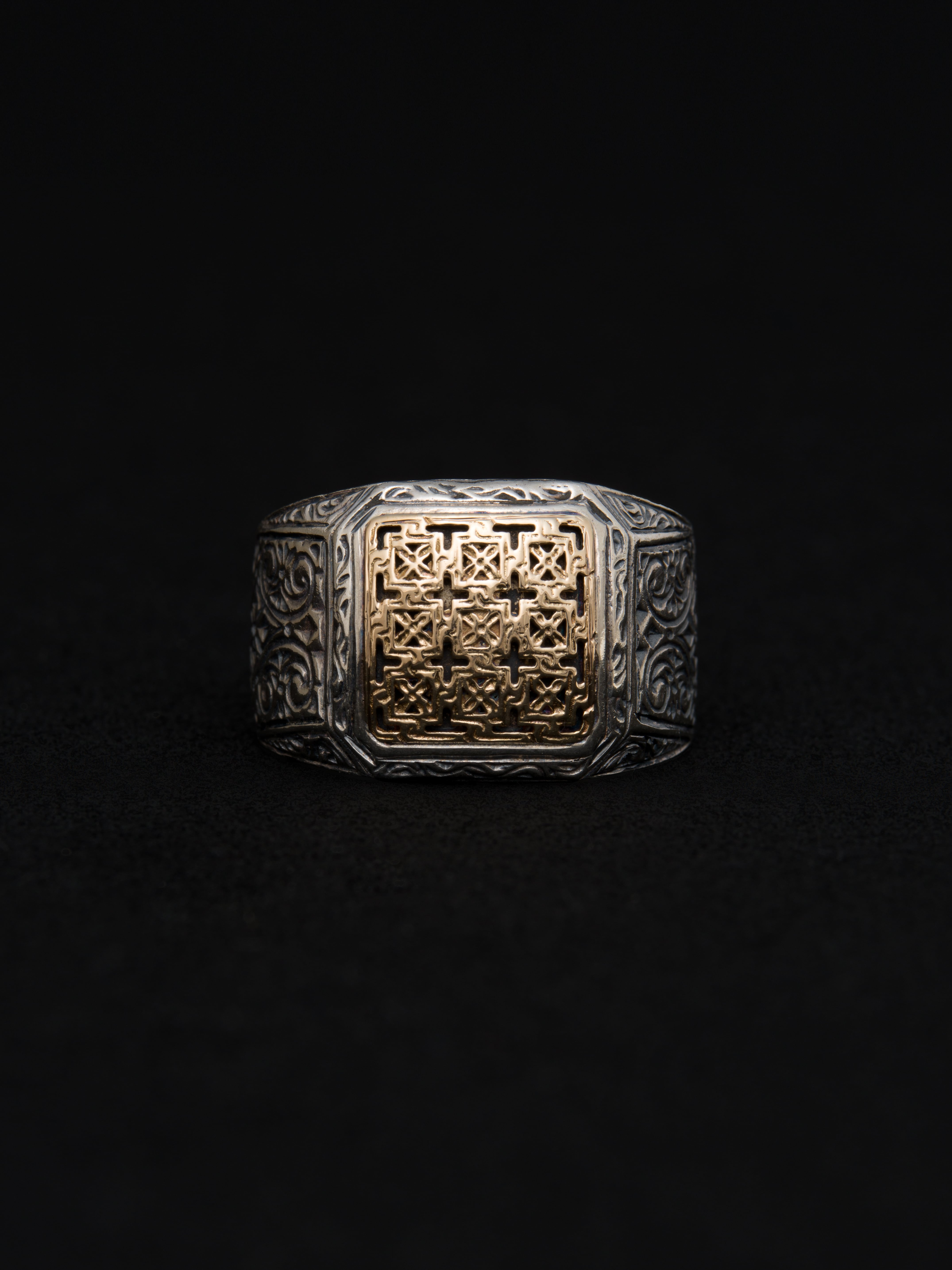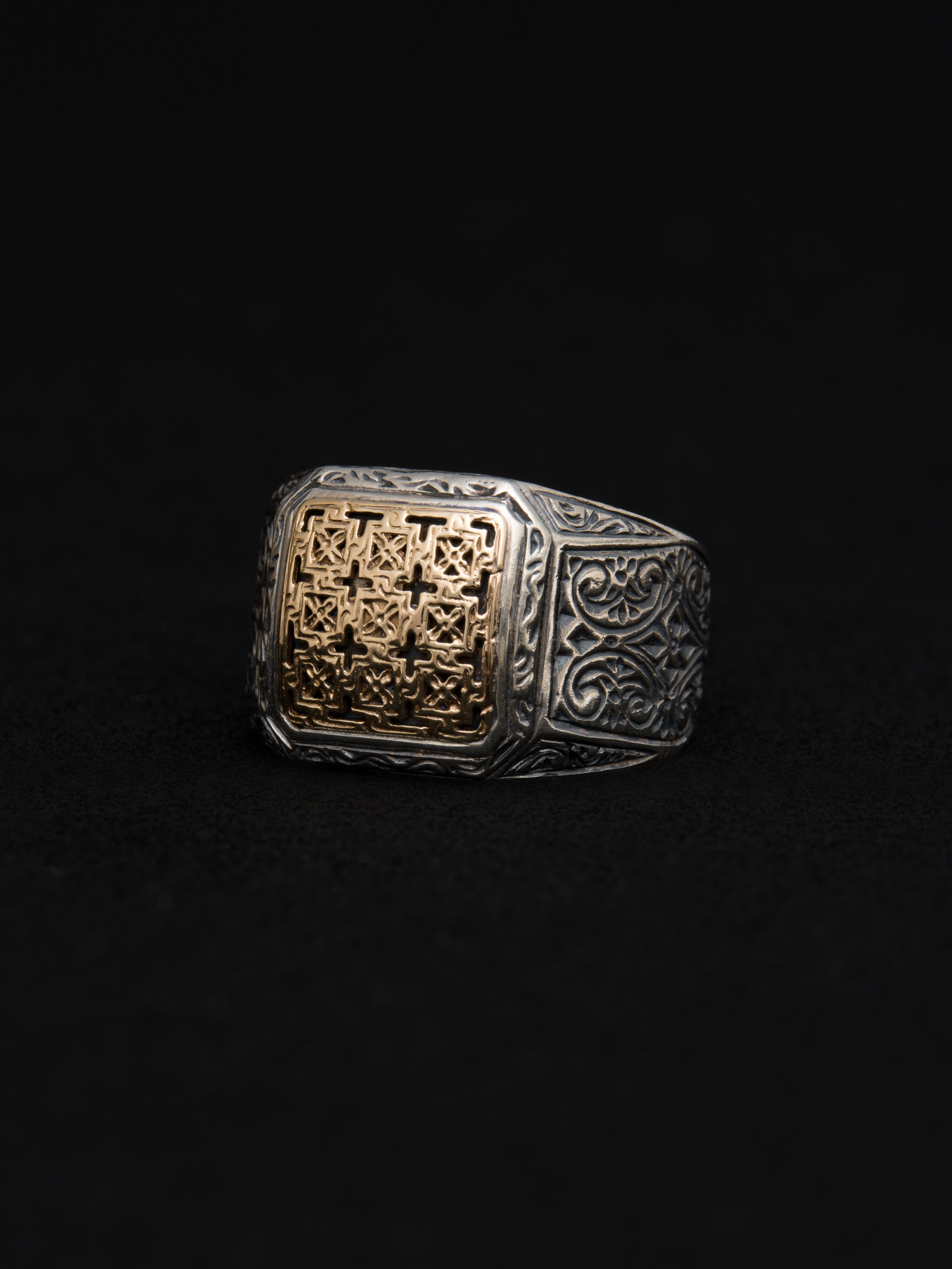 Gerochristo|ジェロクリスト シルバーと18Kゴールド製のリング。 ギリシアに拠点を置くジェロクリストは、古典芸術様式であるビザンチンに影響を受けた伝統的な装飾技術を用い、クラシックとモダンが調和する独自のデザインでジュエリーを創り上げています。 ギリシア製 シルバー925|18Kゴールド アイテムナンバー|GR057