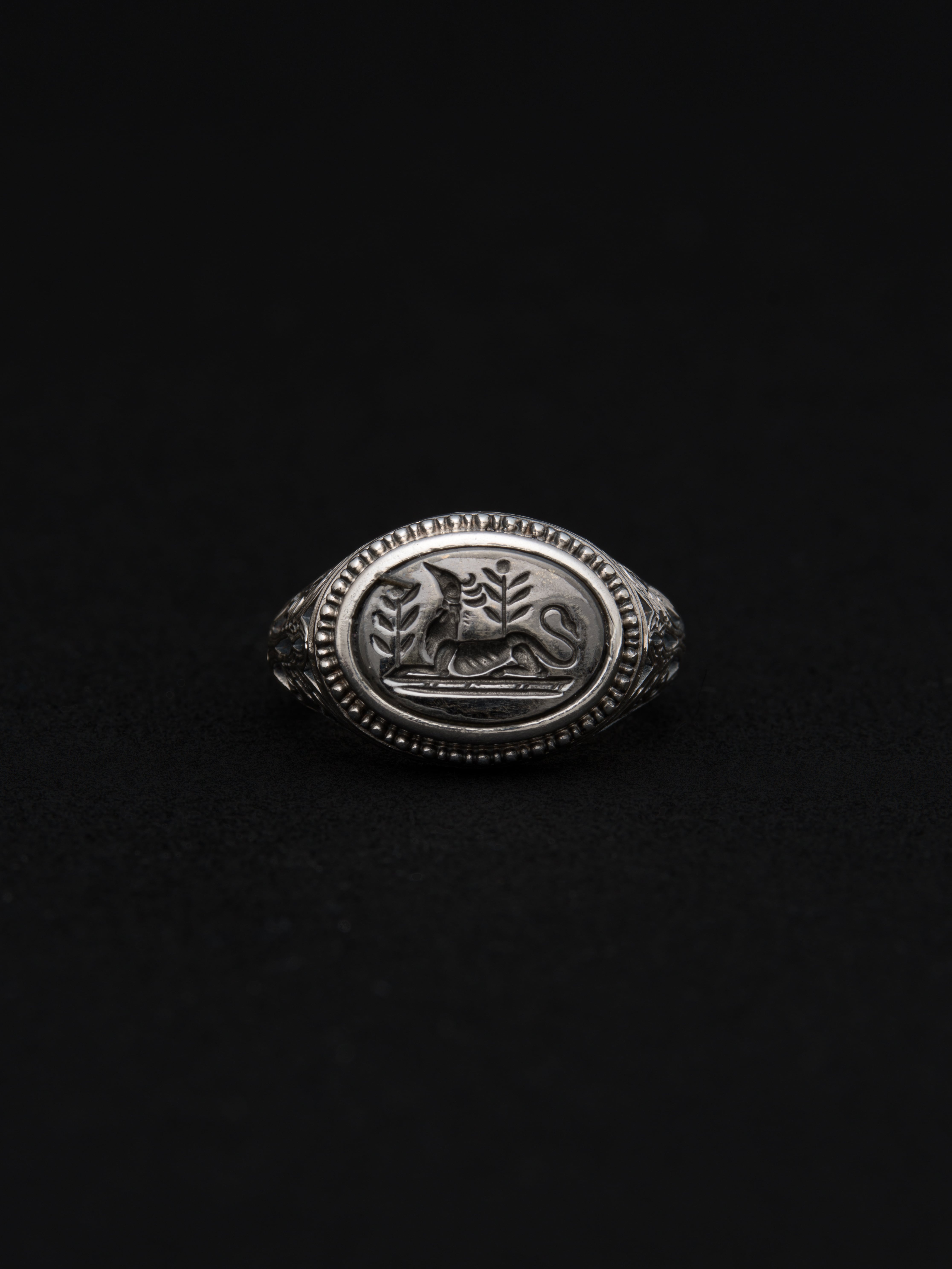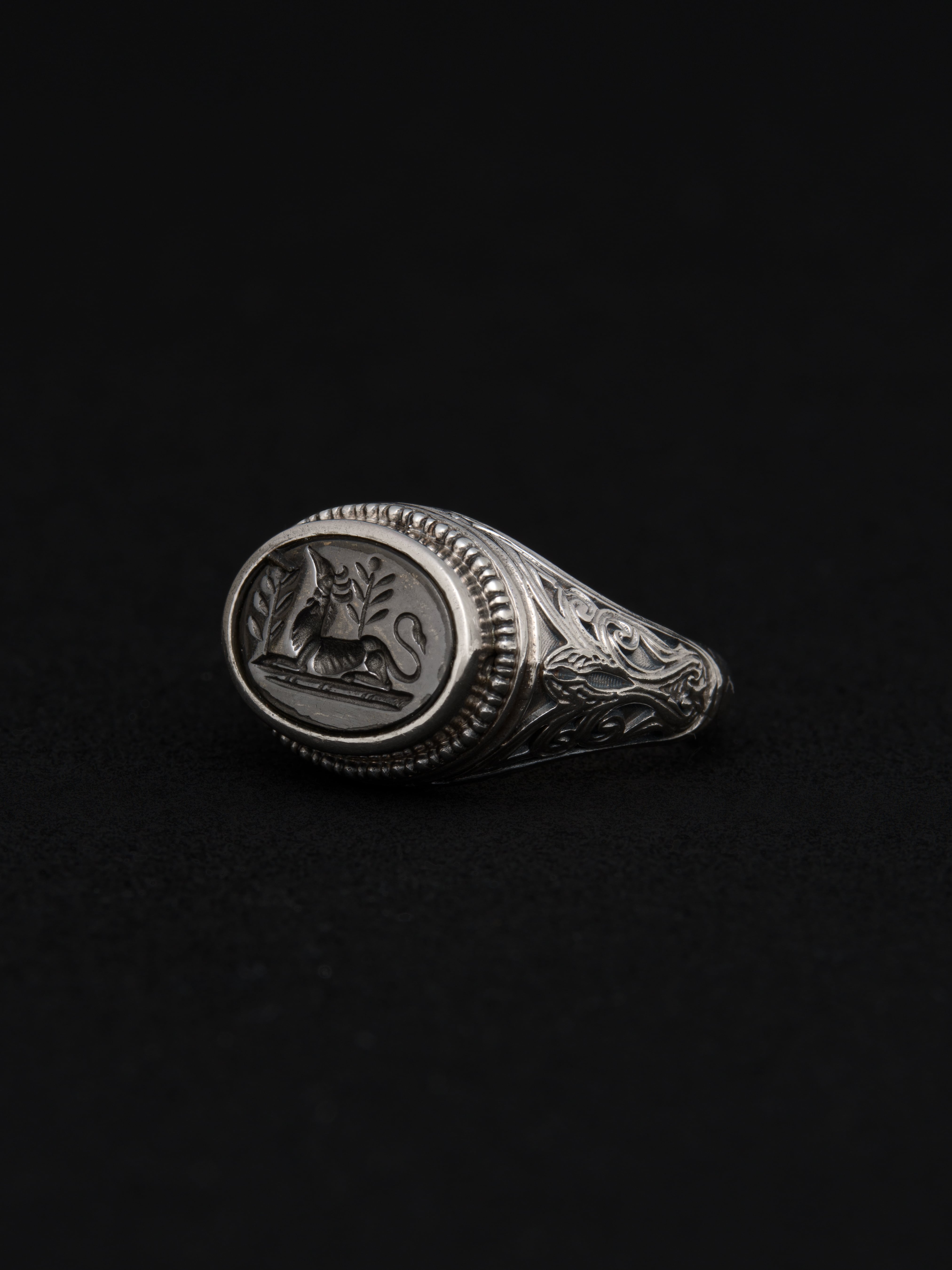 Gerochristo|ジェロクリスト シルバーとブロンズ製のリング、中央にグリフィンの彫刻。 ギリシアに拠点を置くジェロクリストは、古典芸術様式であるビザンチンに影響を受けた伝統的な装飾技術を用い、クラシックとモダンが調和する独自のデザインでジュエリーを創り上げています。 ギリシア製 シルバー925|ブロンズ アイテムナンバー|GR058