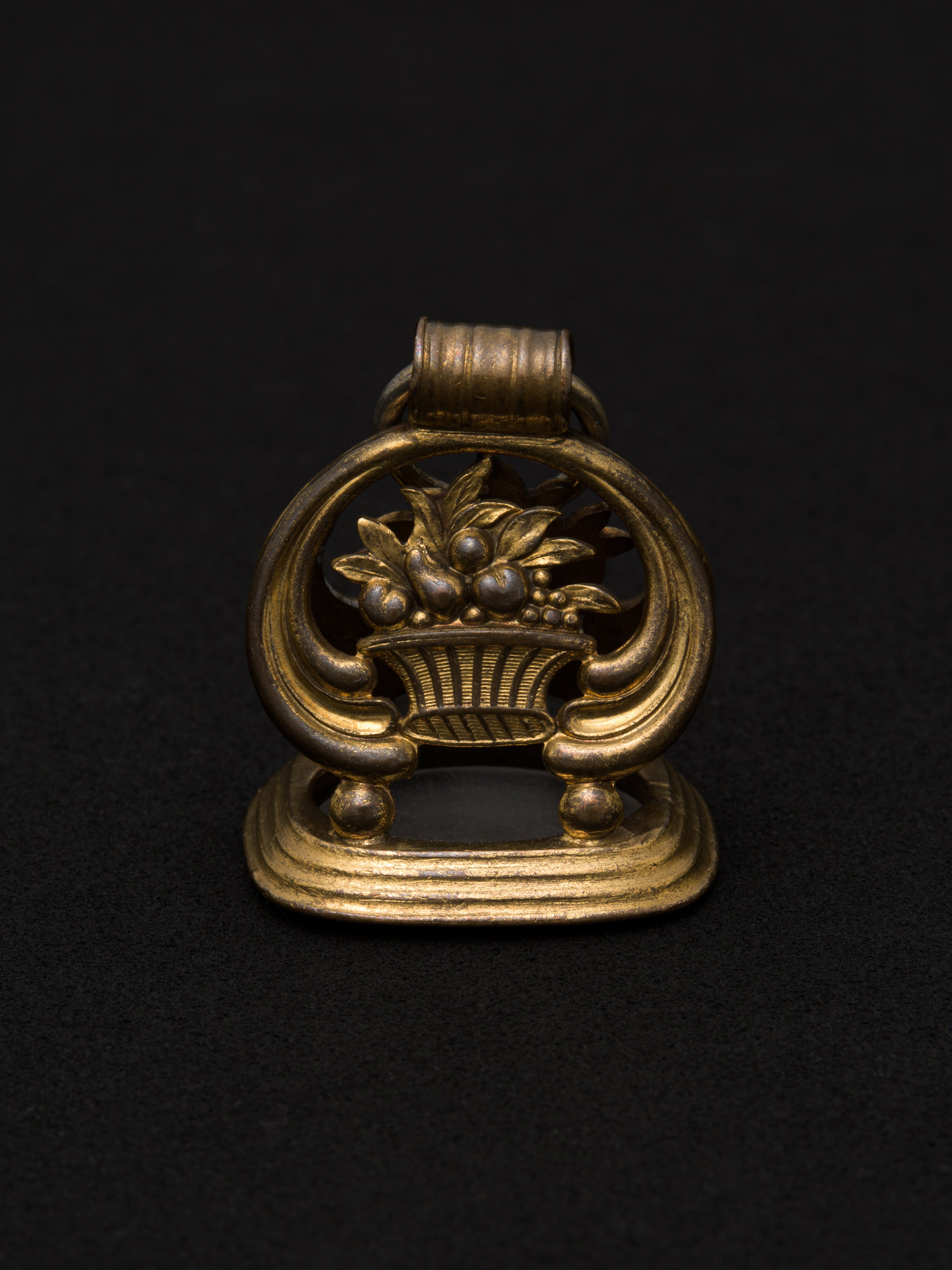イギリスのヴィクトリア時代(1837年 ~ 1901年)に作られたと推測されるインタリオシール(印章)。当時の貴族階級の人々は、手紙に蝋印を押す際に身分がわかるようそれぞれ違う彫刻の印章を使用しました。ヴィクトリアン様式の特徴である動植物などのモチーフや、細やかな装飾が施されたデザインです。お好みのネックレスを通すことでペンダントとして使用することができます。 イギリス製 真鍮 4.3cm × 2.8cm アイテムナンバー|N119