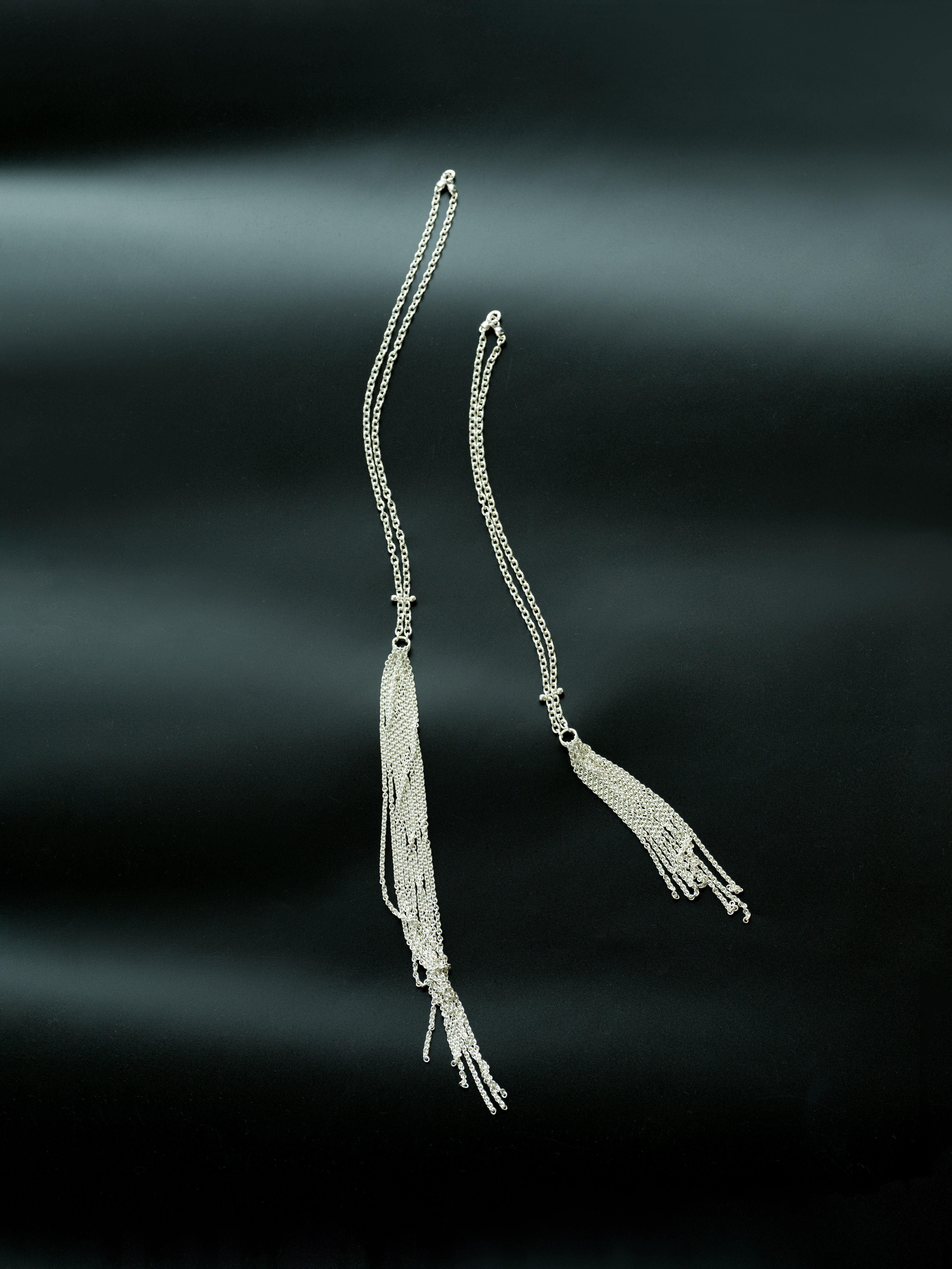 RHODES|ローズ シルバー製のタッセルネックレス。 ローズは2021年にファビュラスサウンズのディレクター、吉田量によって設立したブランド。インスピレーションをキーワードに、多彩なデザインのジュエリーを展開。 日本製 シルバー925 全長 : 67cm|ネックレス : 63cm アイテムナンバー|RHODES006-L