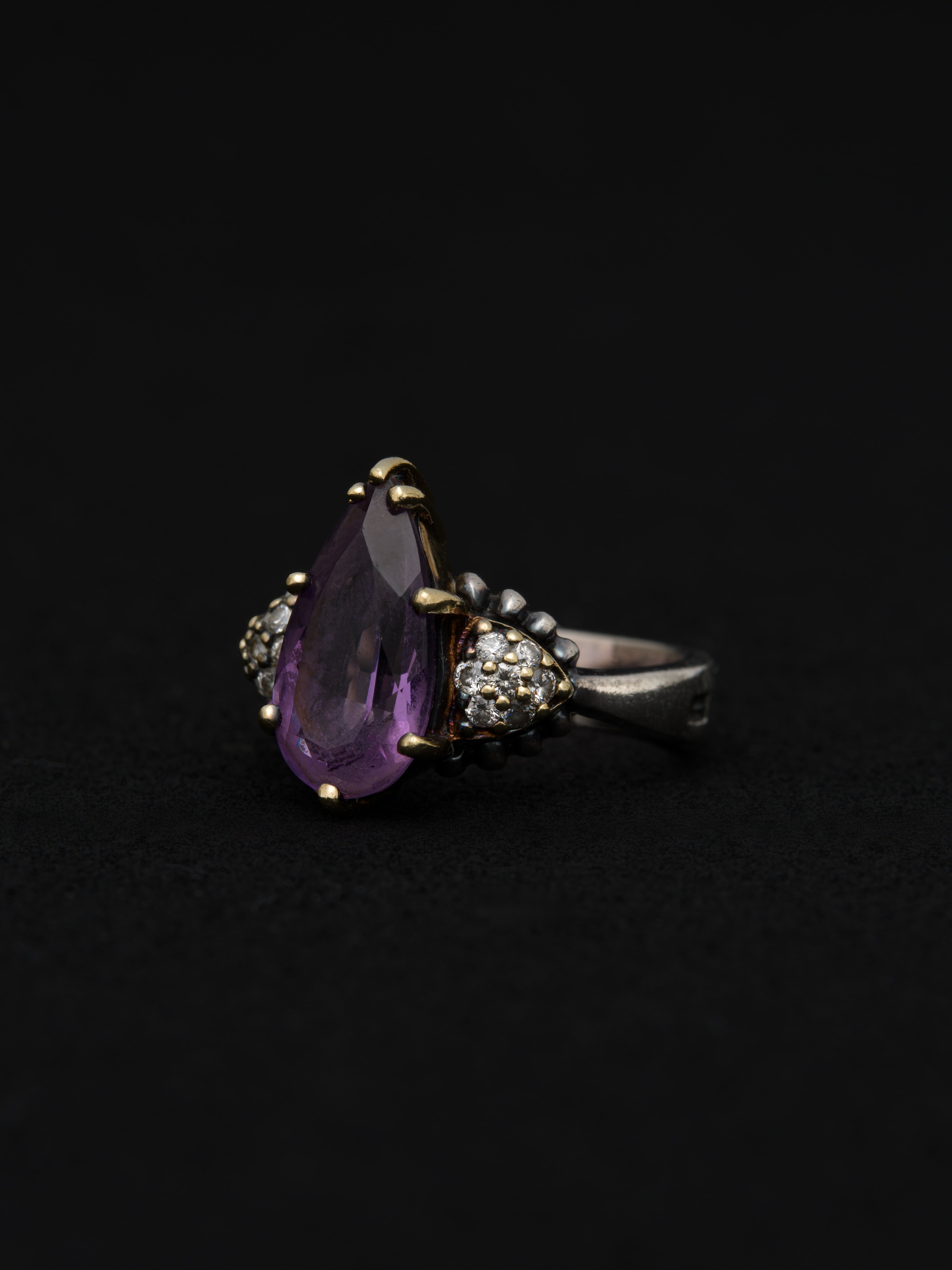 Lagos|ラゴス シルバーと18Kゴールド製のリング、中央にアメジスト、パヴェダイヤモンド。 1977年にSteven Lagosによってアメリカで創業。その後、1984年にブランドの代名詞であるCaviarコレクションを確立しました。イノベーションをブランドのテーマに掲げ、新しいテクノロジーや素材を積極的にジュエリーに取り入れています。 アメリカ製 シルバー925|18Kゴールド|アメジスト|ダイヤモンド サイズ|JP 14 アイテムナンバー|R1079