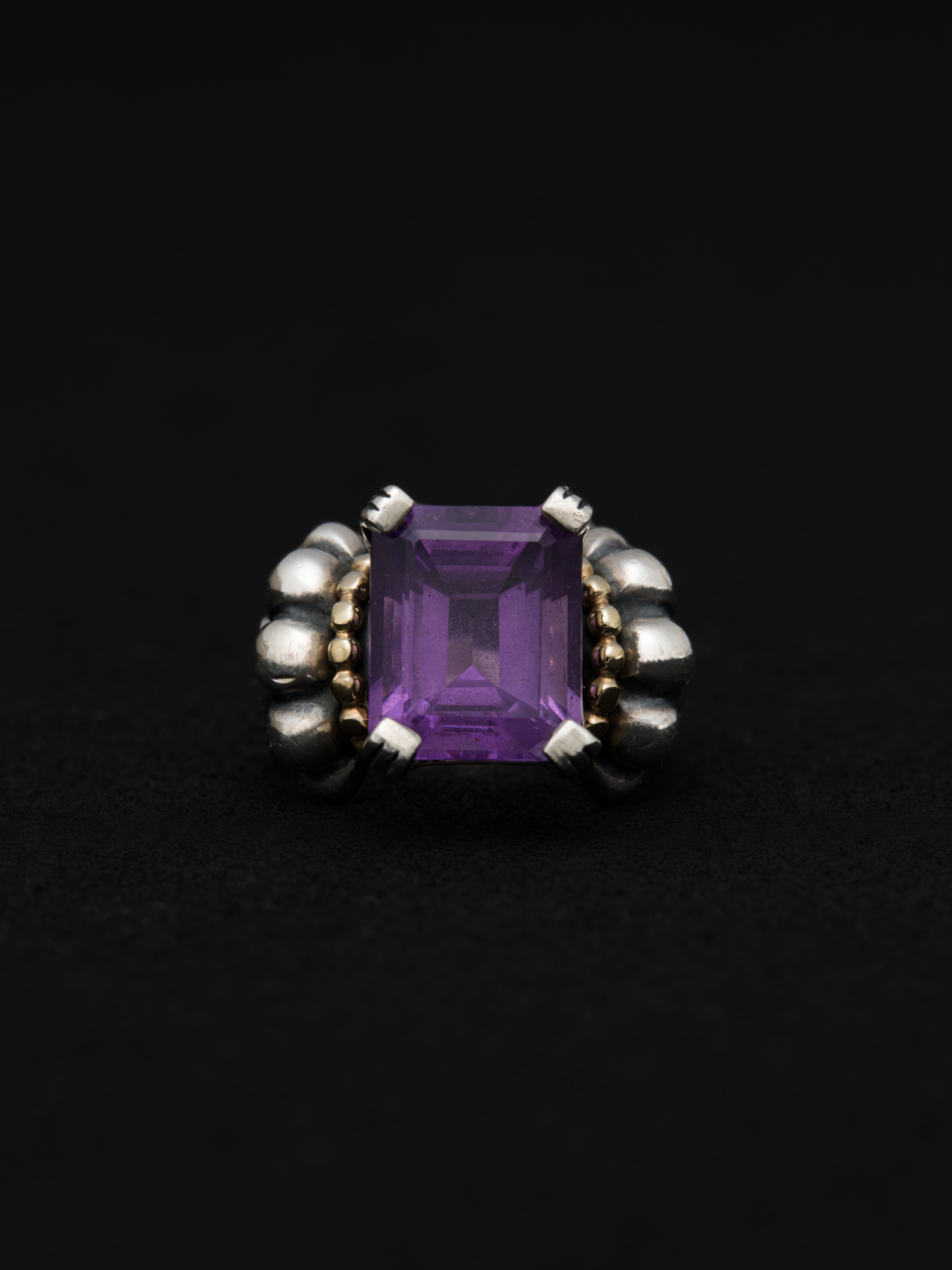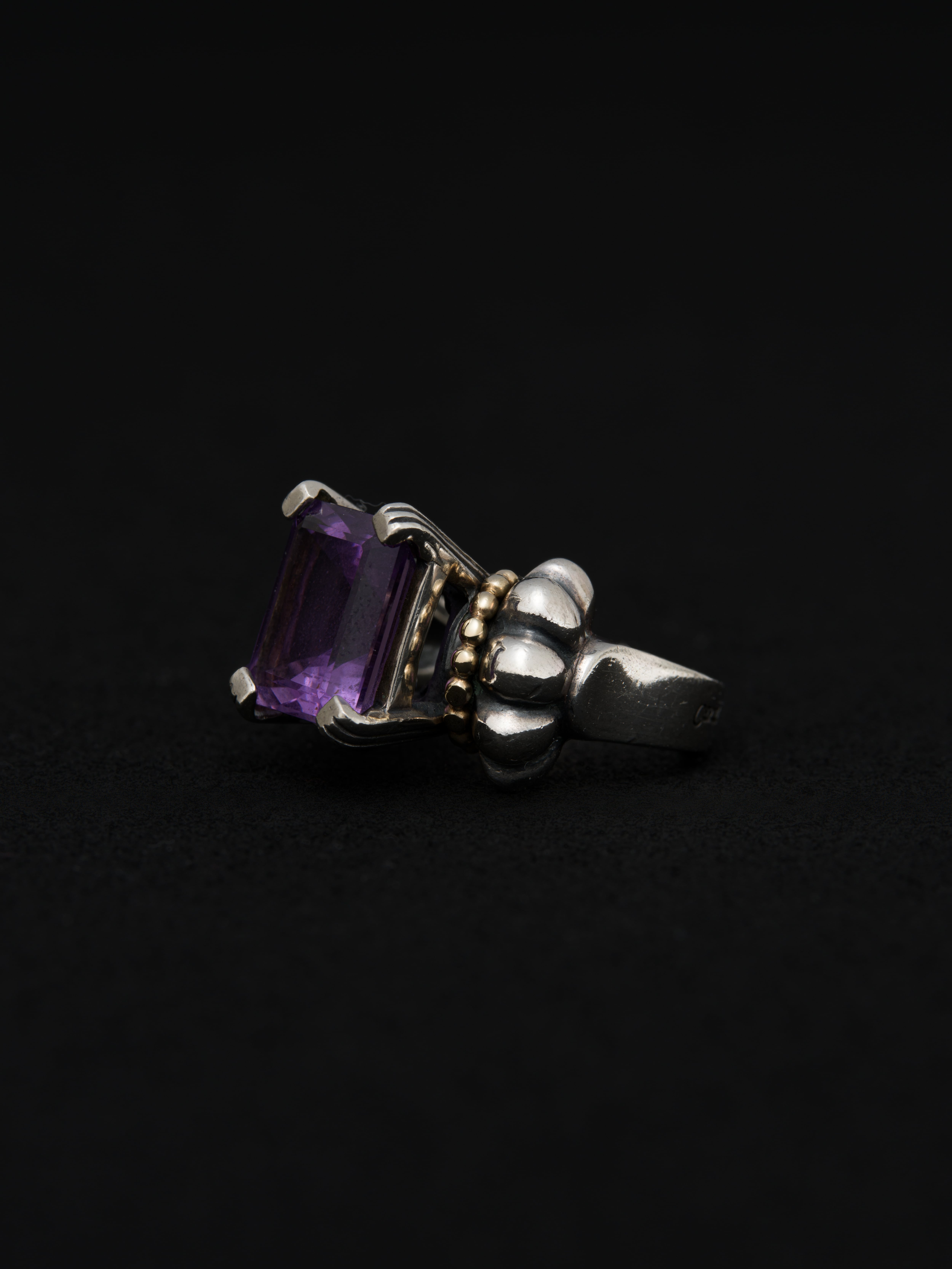Lagos|ラゴス シルバーと18Kゴールド製のリング、トップにアメジストをセッティング。 1977年にSteven Lagosによってアメリカで創業。その後、1984年にブランドの代名詞であるCaviarコレクションを確立しました。イノベーションをブランドのテーマに掲げ、新しいテクノロジーや素材を積極的にジュエリーに取り入れています。 アメリカ製 シルバー925|18Kゴールド|アメジスト サイズ|JP 11 アイテムナンバー|R1100