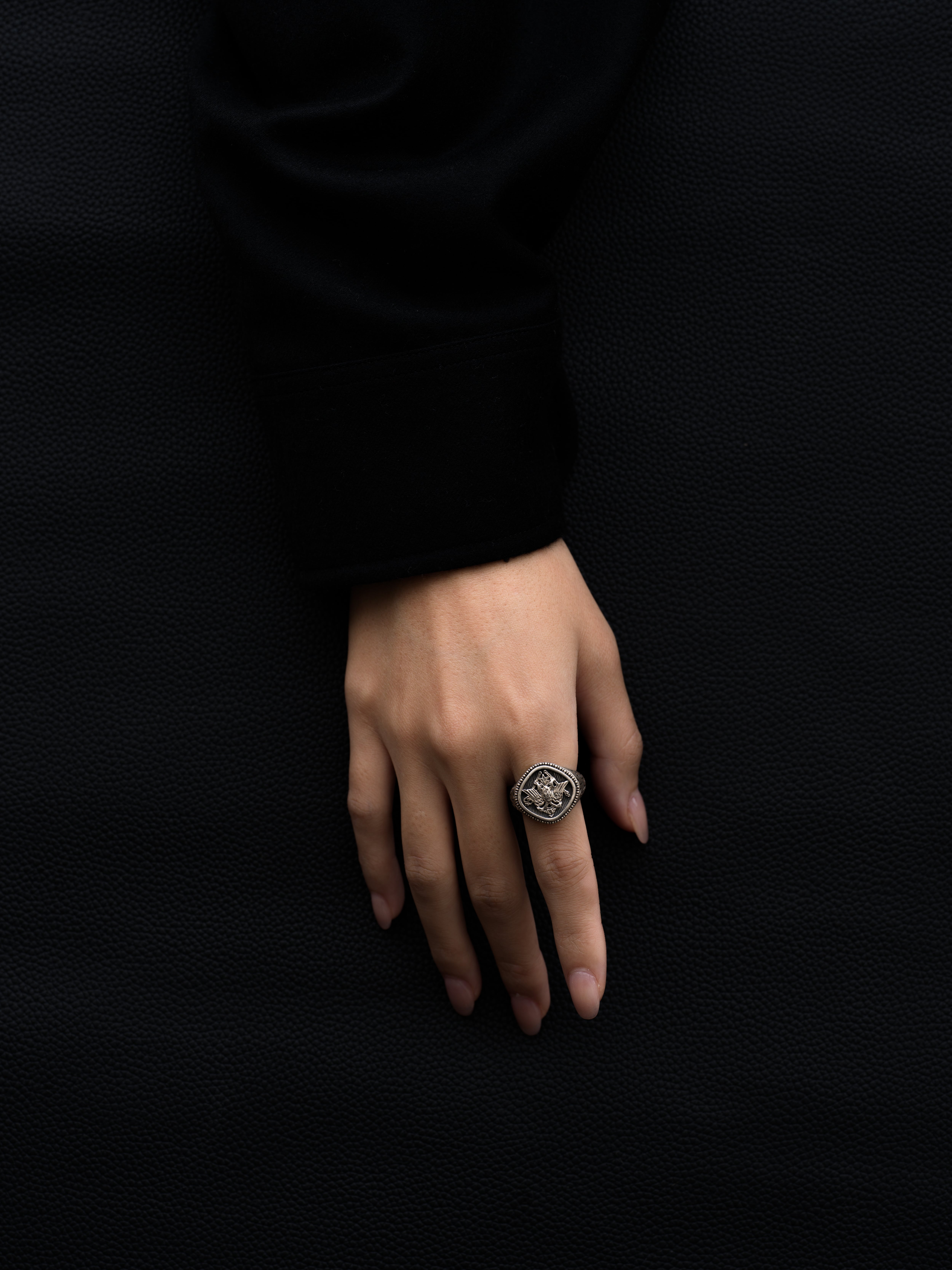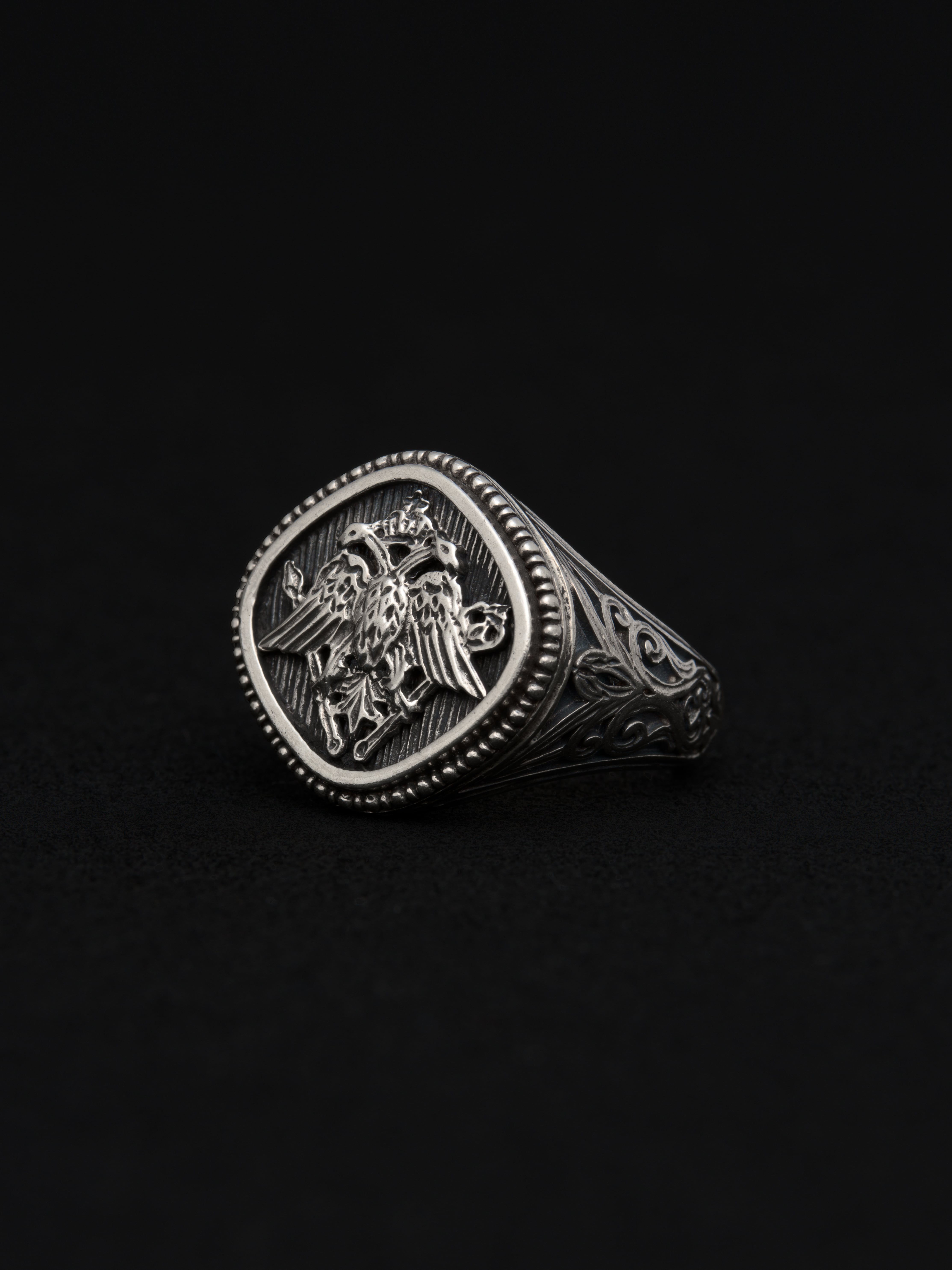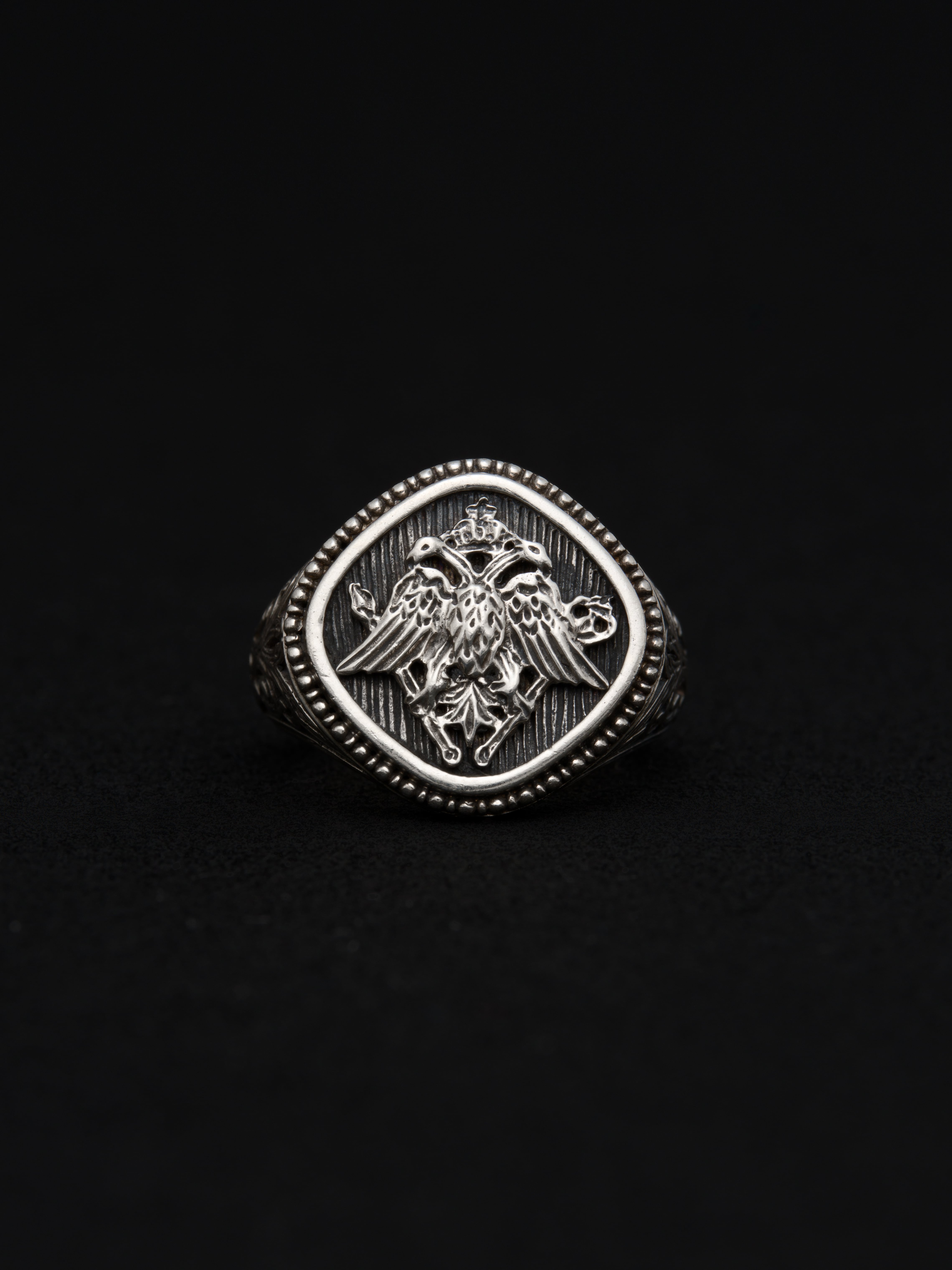 Gerochristo|ジェロクリスト シルバー製のリング、中央に双頭鷲の紋章。双頭の鷲はギリシアでは古代東ローマ帝国を表す紋章とされています。 ギリシアに拠点を置くジェロクリストは、古典芸術様式であるビザンチンに影響を受けた伝統的な装飾技術を用い、クラシックとモダンが調和する独自のデザインでジュエリーを創り上げています。 ギリシア製 シルバー925 アイテムナンバー|GR066 価格|¥42,900