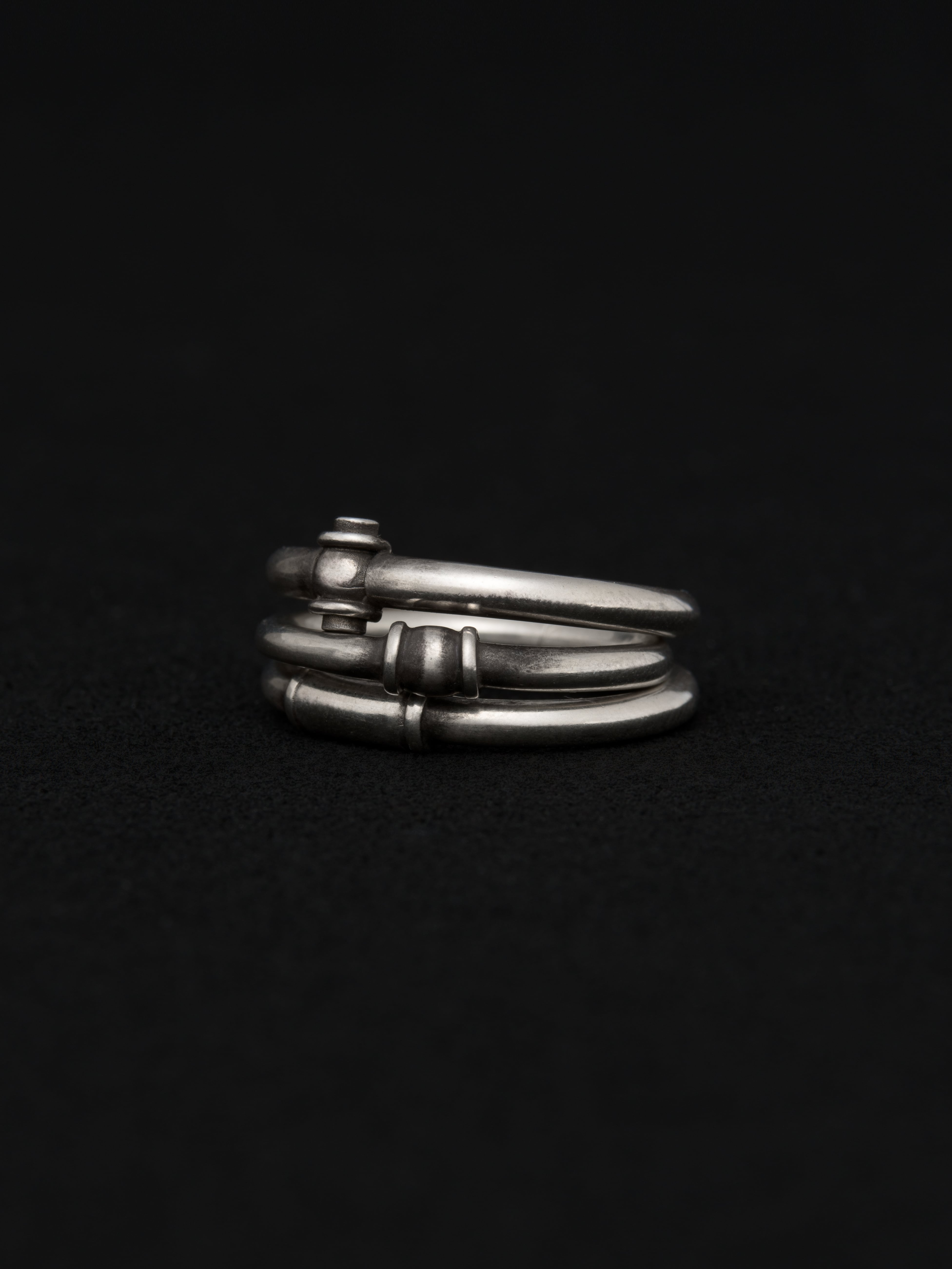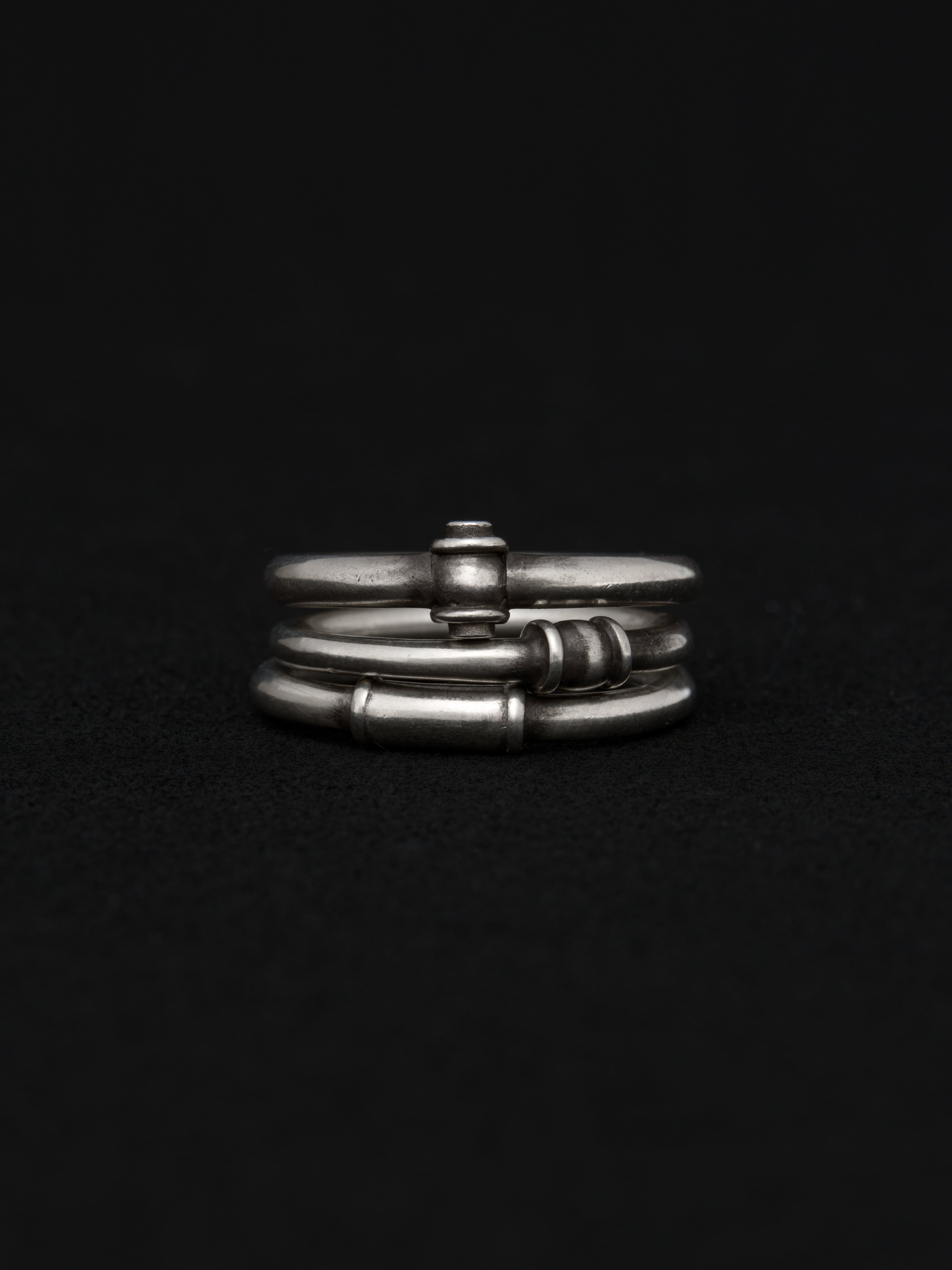 Werkstatt:München|ワークスタットミュンヘン 3種類のデザインがセットになったシルバー製のリング。 1996年にドイツのKlaus Lohmeyerが設立したジュエリーブランド。音楽や哲学からインスピレーションを受けたデザインが特徴で、金属の自然な質感や槌目を生かした作品は全て自社工房で手作業で作られています。 ドイツ製 シルバー925 サイズ|JP 11 アイテムナンバー|M1187