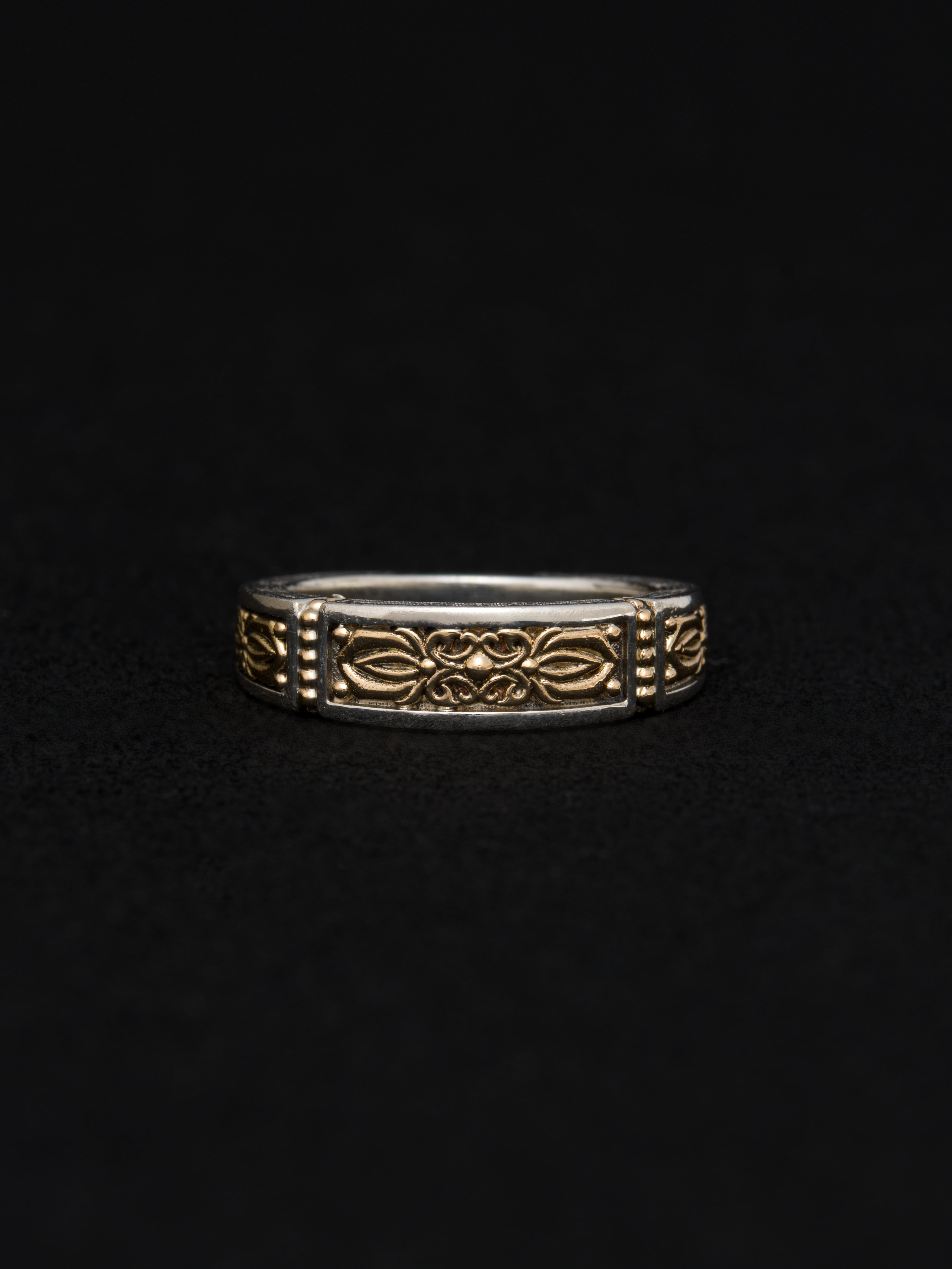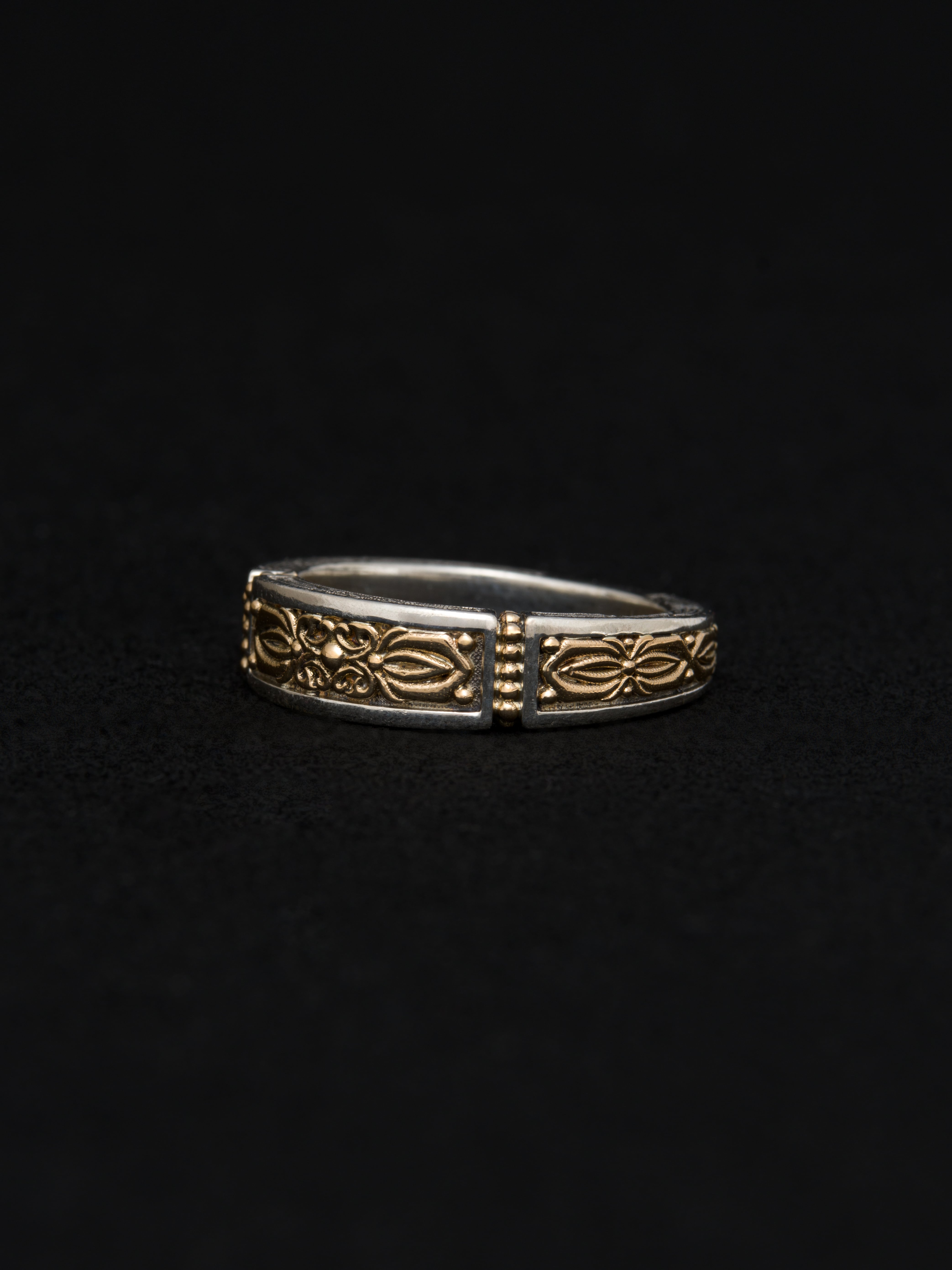 Gerochristo|ジェロクリスト シルバーと18Kゴールド製のリング。 ギリシアに拠点を置くジェロクリストは、古典芸術様式であるビザンチンに影響を受けた伝統的な装飾技術を用い、クラシックとモダンが調和する独自のデザインでジュエリーを創り上げています。 ギリシア製 シルバー925|18Kゴールド アイテムナンバー|GR069