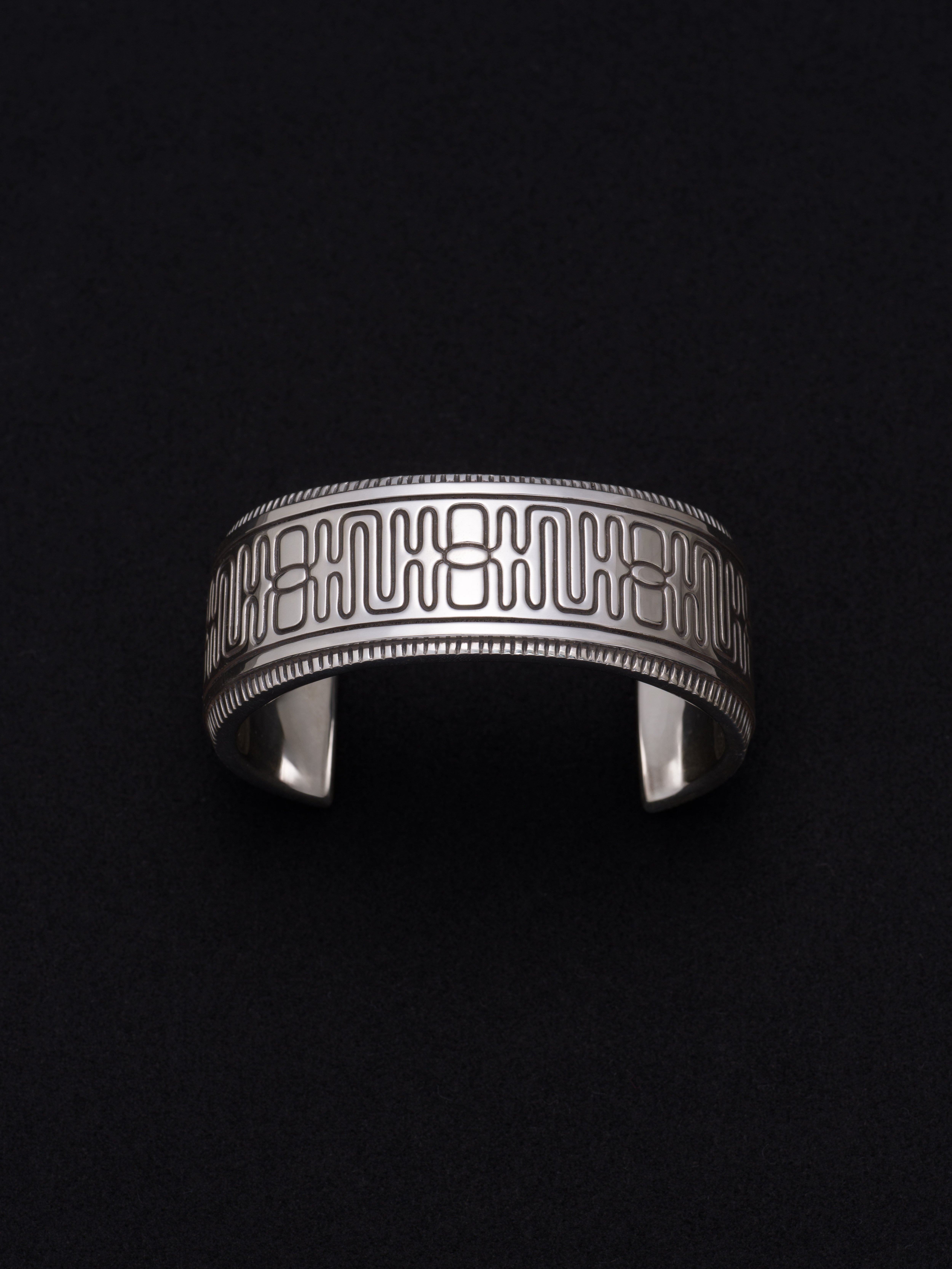 RHODES|ローズ シルバー製のワイドバングル。 ローズは2021年にファビュラスサウンズのディレクター、吉田量によって設立したブランド。インスピレーションをキーワードに、多彩なデザインのジュエリーを展開。 日本製 シルバー925 内周 : 16.5cm|幅 : 2.5cm アイテムナンバー|RHODES026