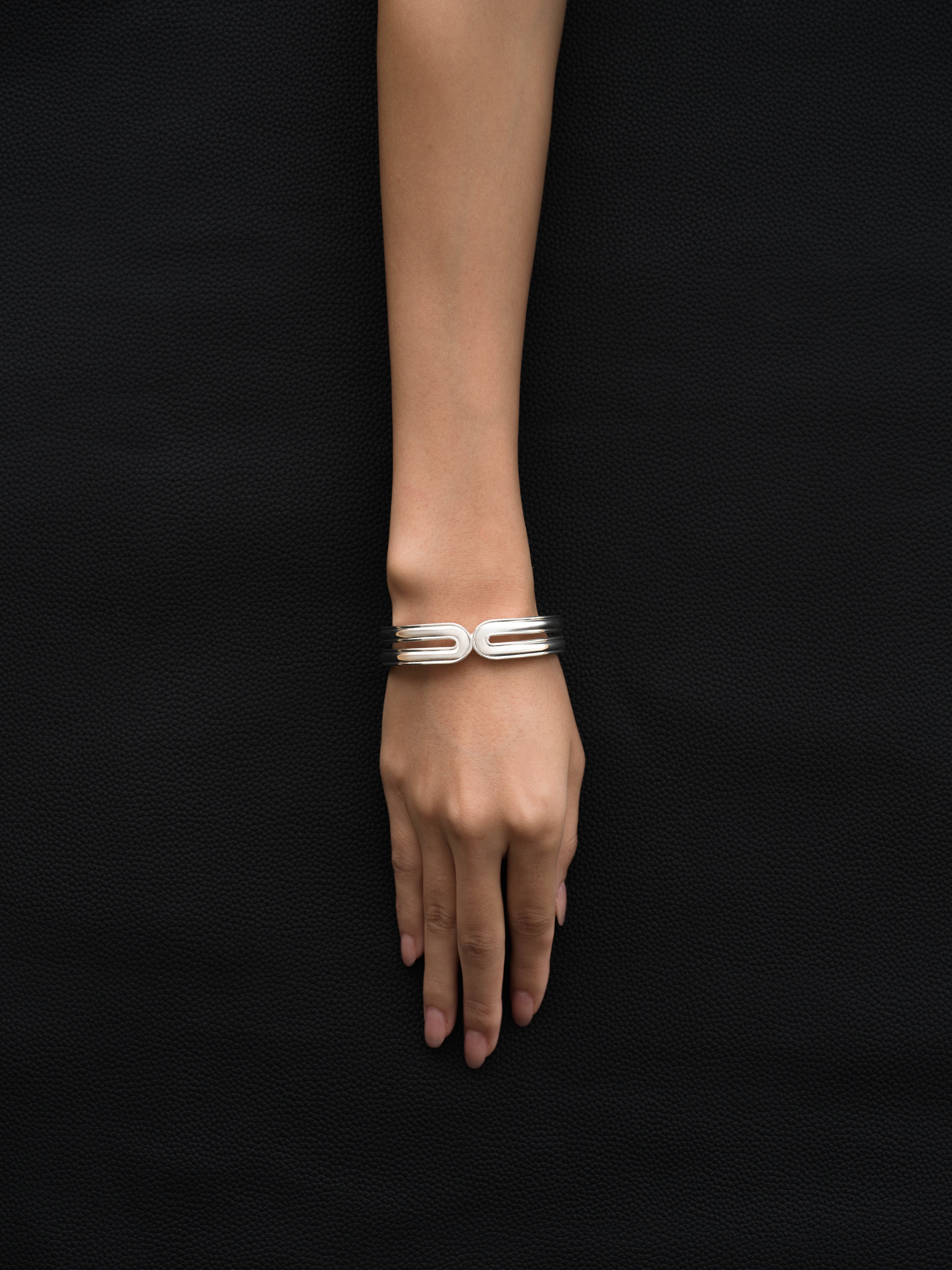RHODES|ローズ シルバー製のバングル。 ローズは2021年にファビュラスサウンズのディレクター、吉田量によって設立したブランド。インスピレーションをキーワードに、多彩なデザインのジュエリーを展開。 日本製 シルバー925 内周 : 16.5cm|幅 : 1.4cm アイテムナンバー|MC015