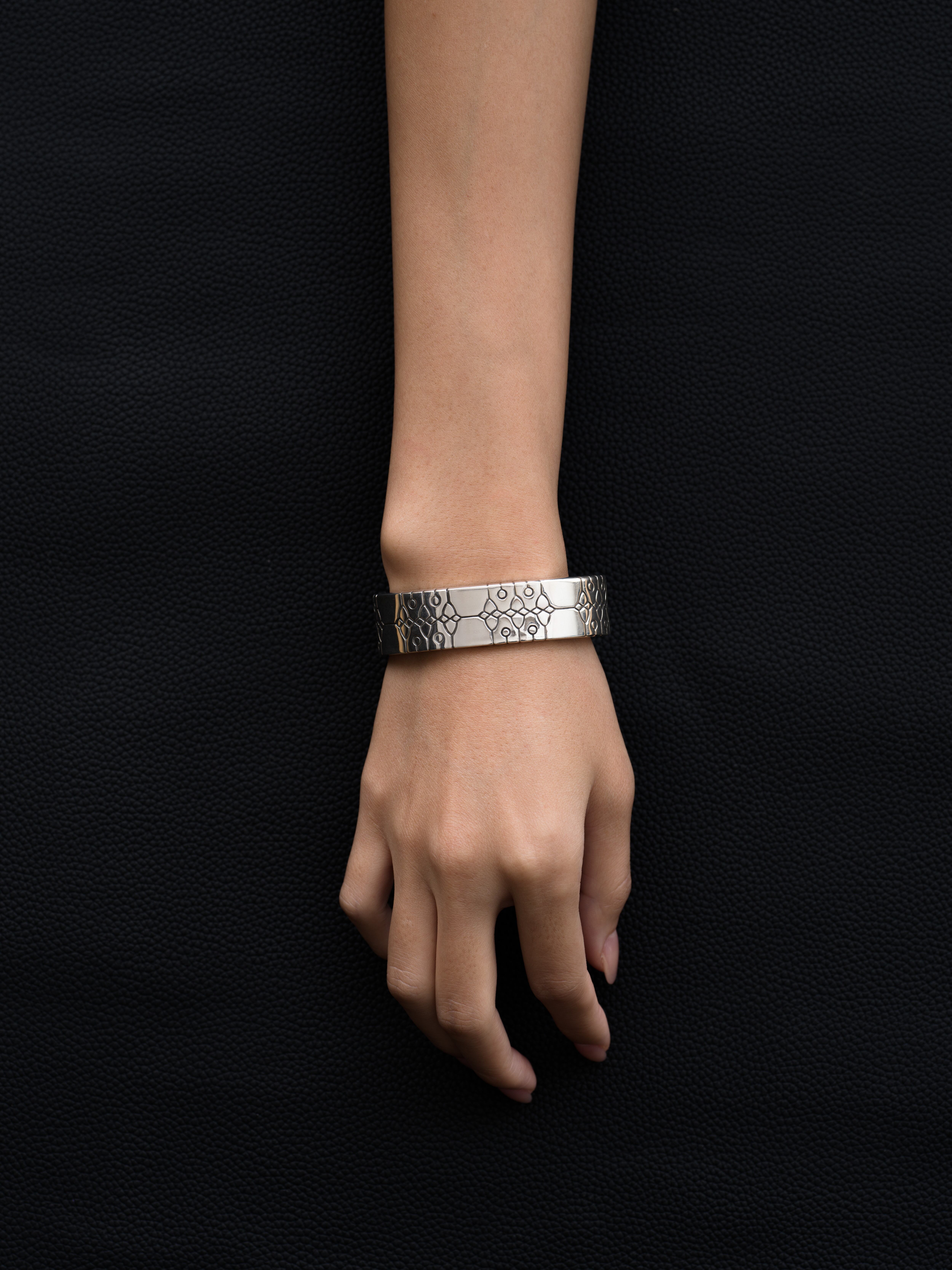 RHODES|ローズ シルバー製のバングル。 ローズは2021年にファビュラスサウンズのディレクター、吉田量によって設立したブランド。インスピレーションをキーワードに、多彩なデザインのジュエリーを展開。 日本製 シルバー925 内周 : 17cm|幅 : 1.7cm アイテムナンバー|RHODES031