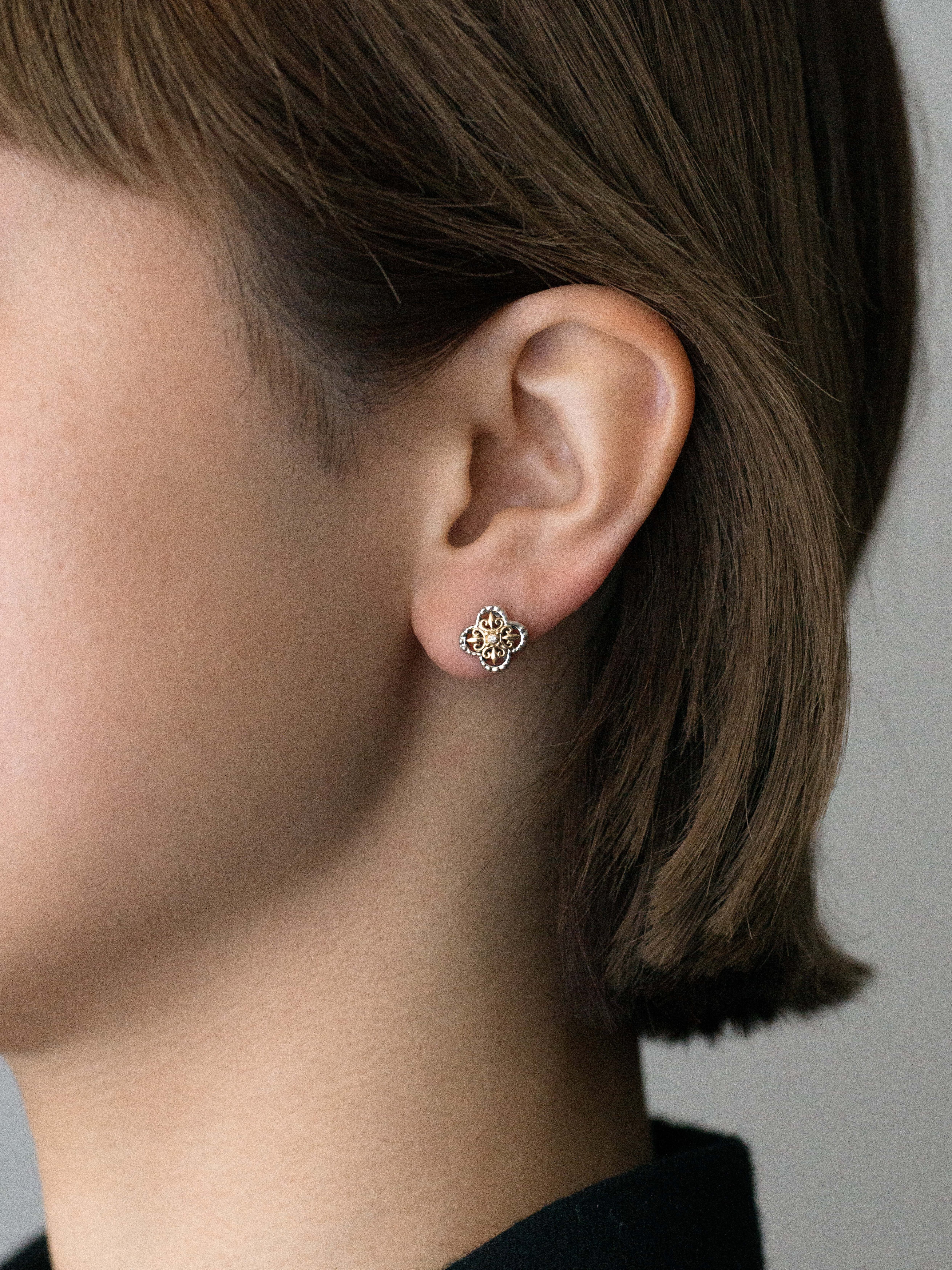 Gerochristo|ジェロクリスト シルバーと18Kゴールド製のピアス、中央にメレダイヤモンド。 ギリシアに拠点を置くジェロクリストは、古典芸術様式であるビザンチンに影響を受けた伝統的な装飾技術を用い、クラシックとモダンが調和する独自のデザインでジュエリーを創り上げています。 ギリシア製 シルバー925|18Kゴールド|ダイヤモンド 1cm × 1cm アイテムナンバー|GA016 ペア(両耳)販売