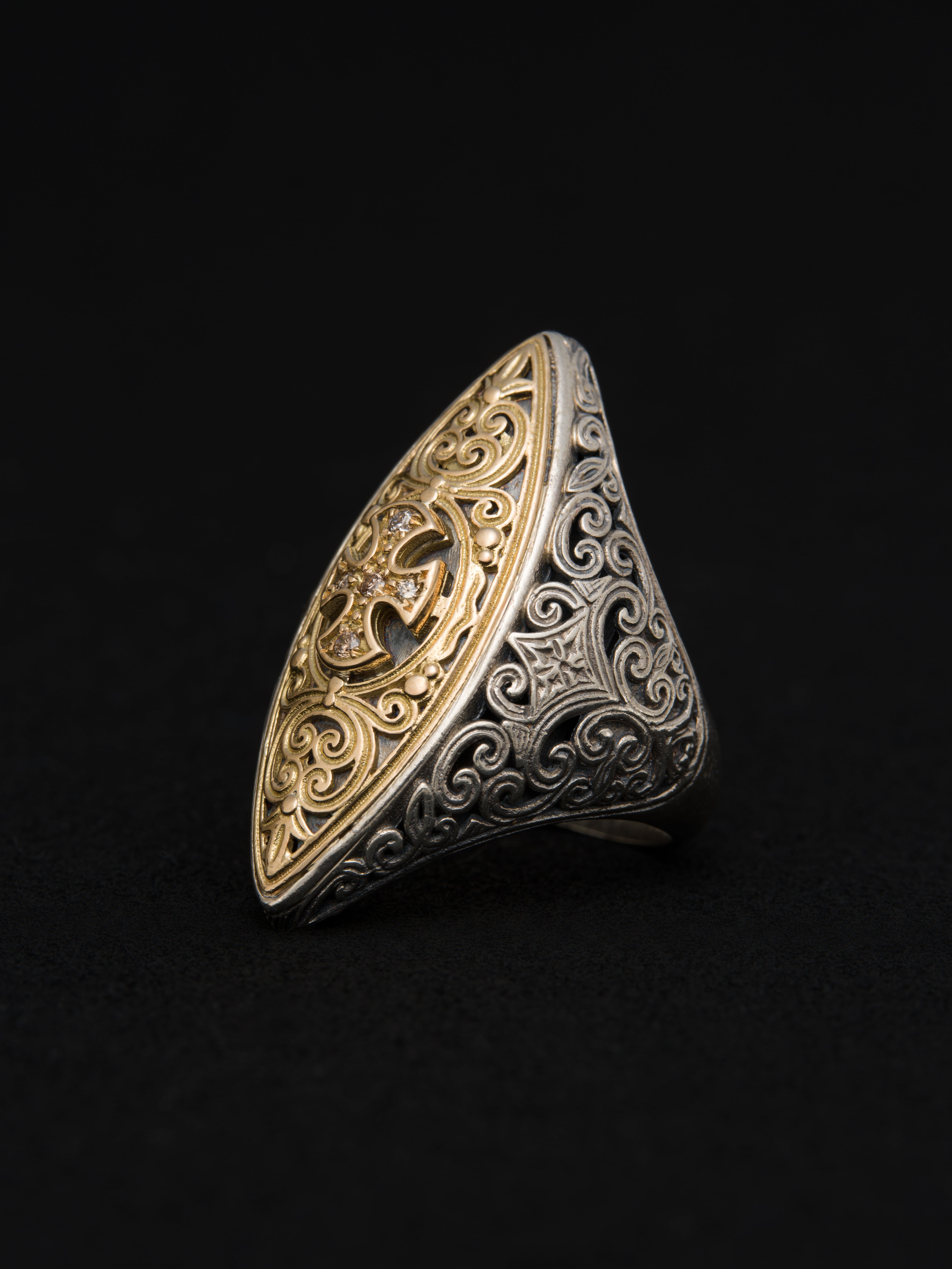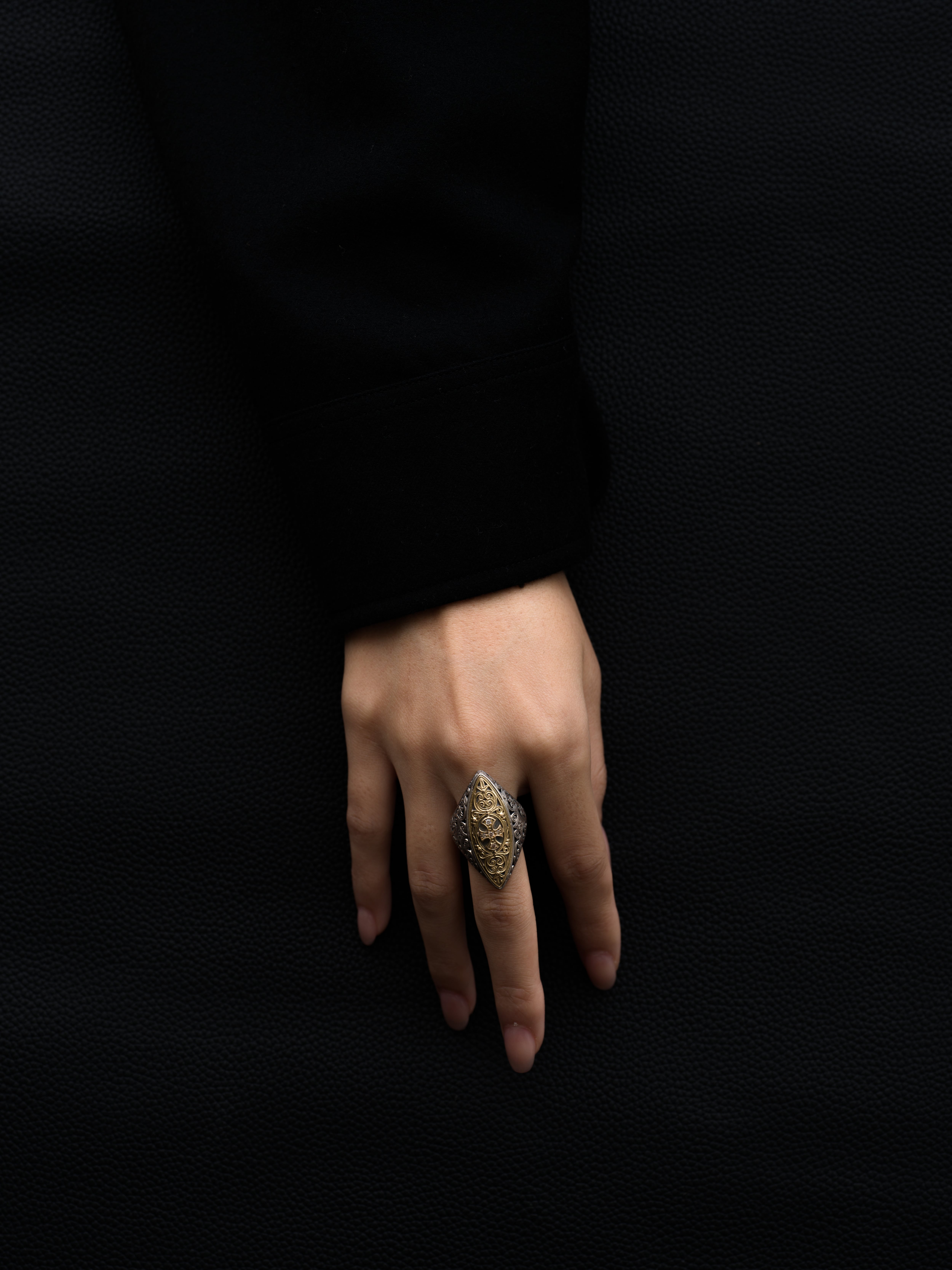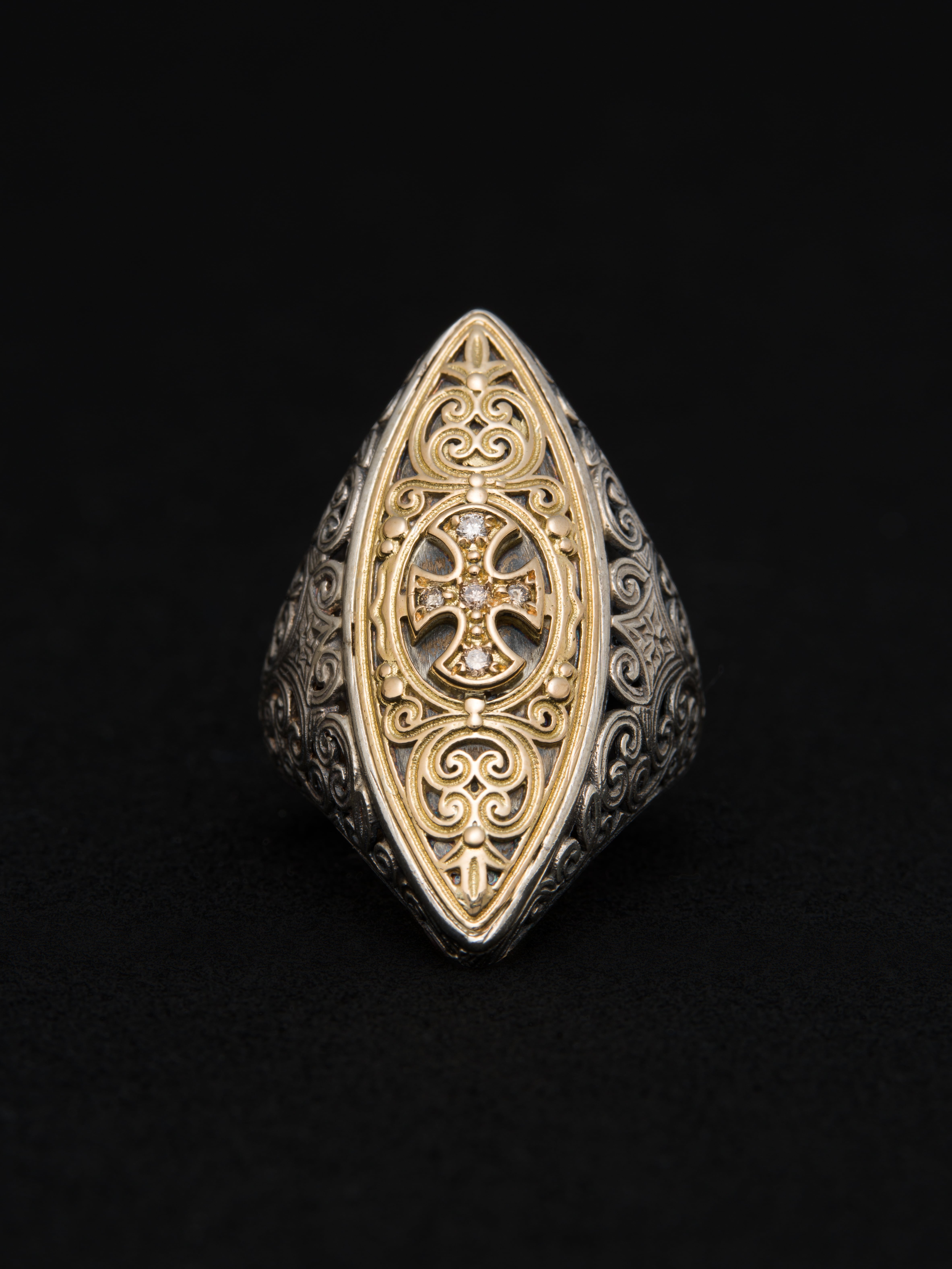 Gerochristo|ジェロクリスト シルバーと18Kゴールド製のリング、中央のクロスモチーフにメレダイヤモンド。 ギリシアに拠点を置くジェロクリストは、古典芸術様式であるビザンチンに影響を受けた伝統的な装飾技術を用い、クラシックとモダンが調和する独自のデザインでジュエリーを創り上げています。 ギリシア製 シルバー925|18Kゴールド|ダイヤモンド サイズ|JP 17.5 アイテムナンバー|GR078