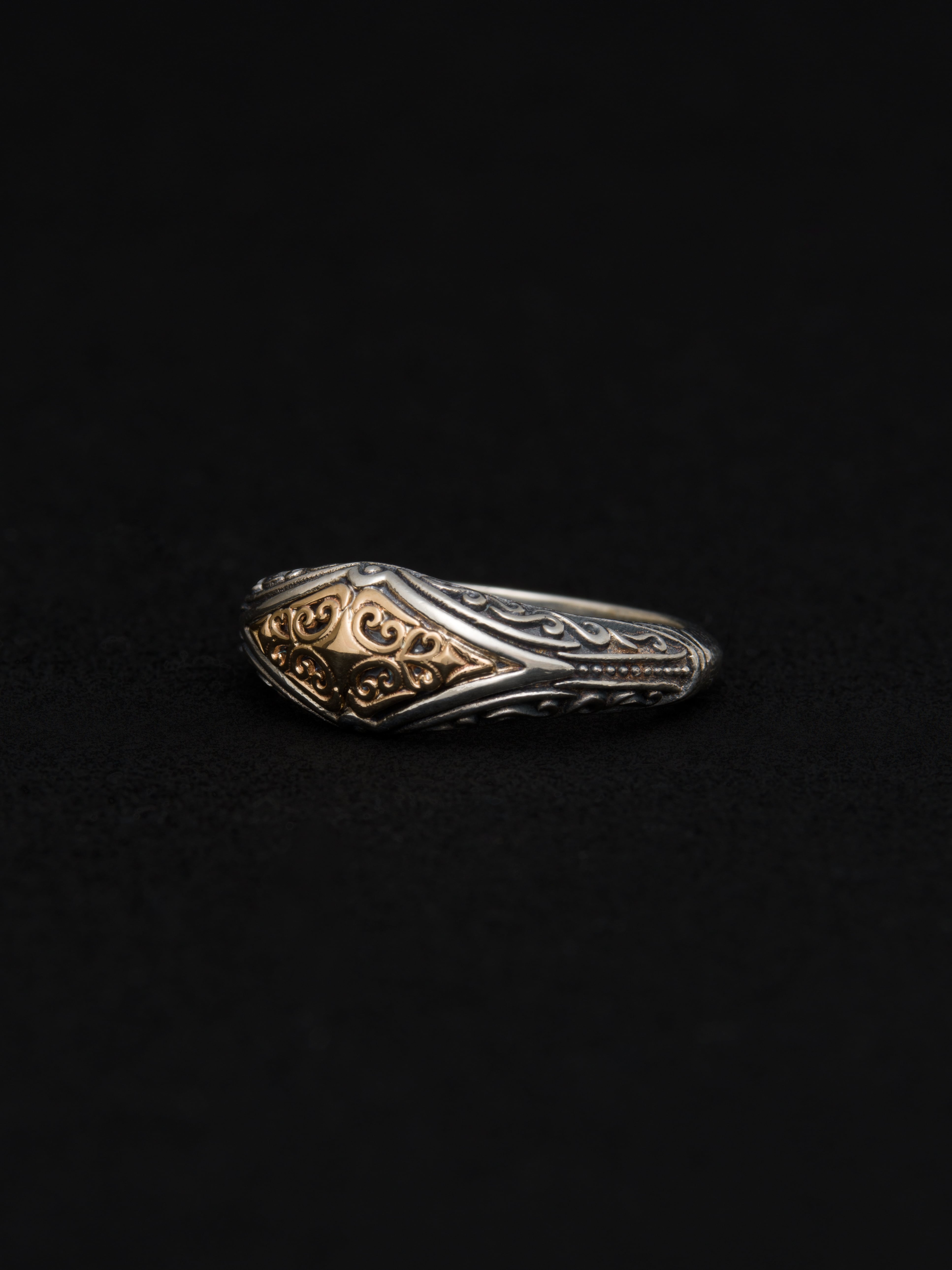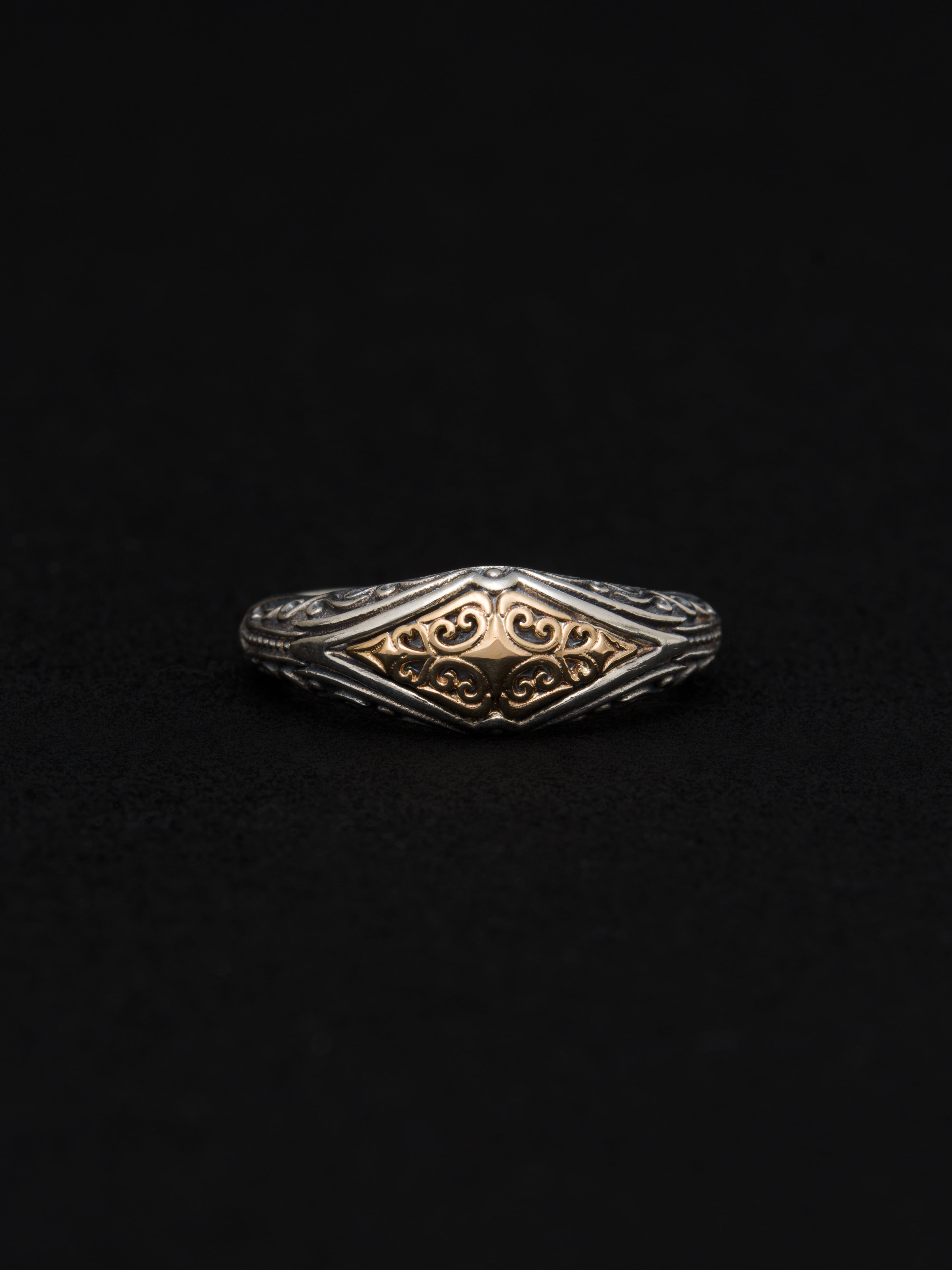 Gerochristo|ジェロクリスト シルバーと18Kゴールド製のリング。 ギリシアに拠点を置くジェロクリストは、古典芸術様式であるビザンチンに影響を受けた伝統的な装飾技術を用い、クラシックとモダンが調和する独自のデザインでジュエリーを創り上げています。 ギリシア製 シルバー925|18Kゴールド サイズ|JP 16.5 アイテムナンバー|GR084