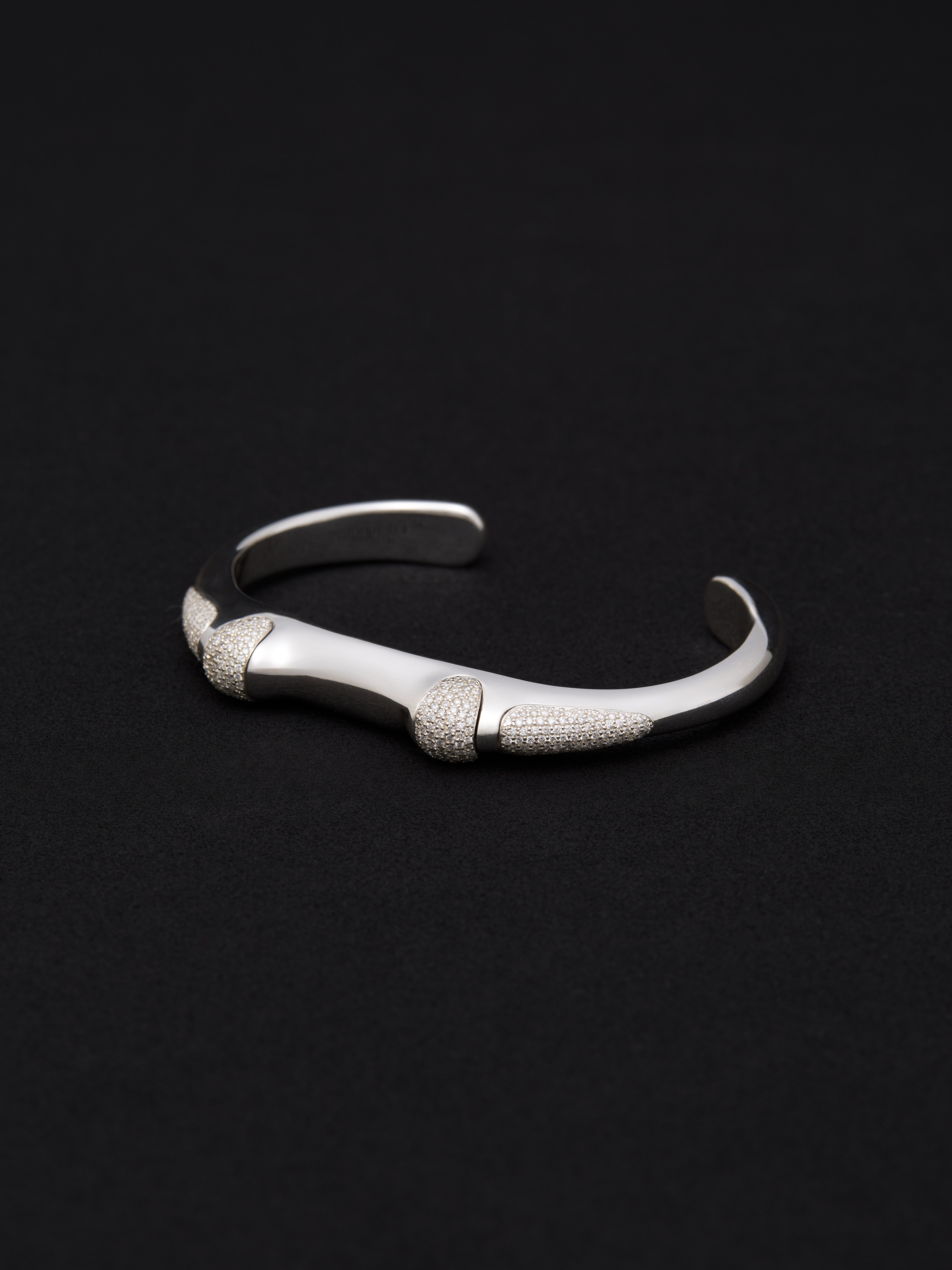 RHODES|ローズ シルバー製のバングル、ダイヤモンドをパヴェセッティング。 ローズは2021年にファビュラスサウンズのディレクター、吉田量によって設立したブランド。インスピレーションをキーワードに、多彩なデザインのジュエリーを展開。 日本製 シルバー925|ダイヤモンド 内周 : 17cm|幅 : 9mm アイテムナンバー|RHODES030
