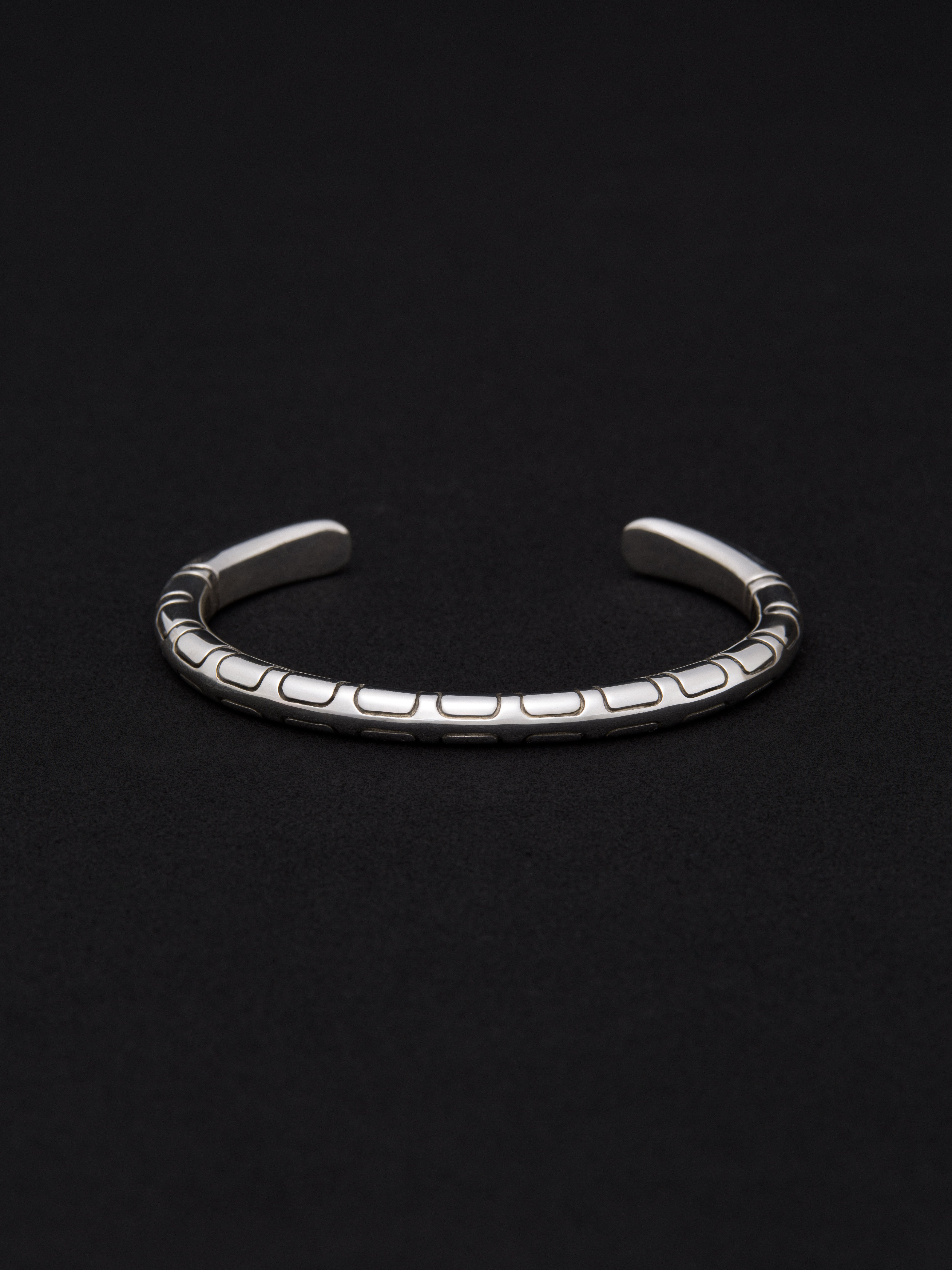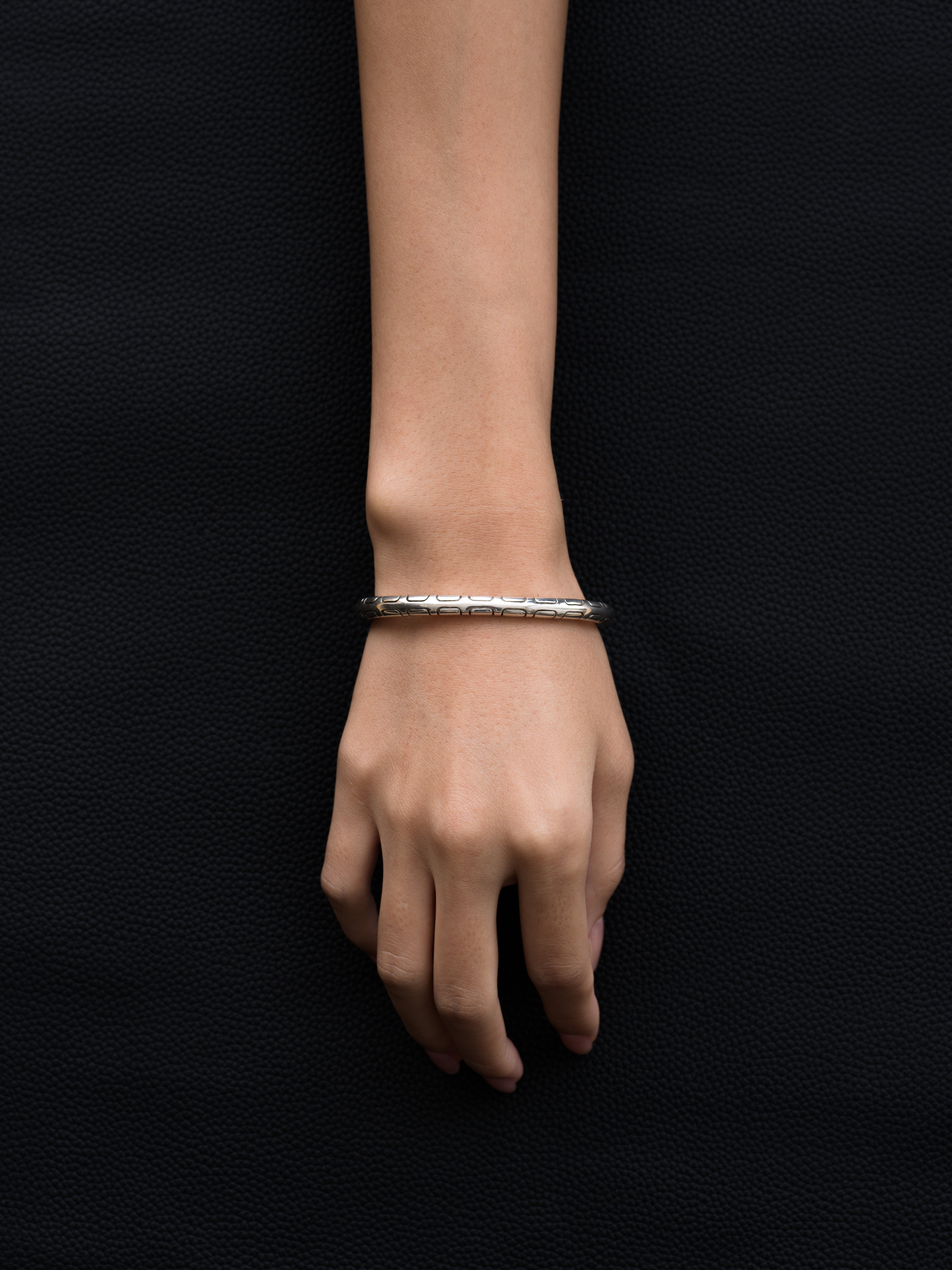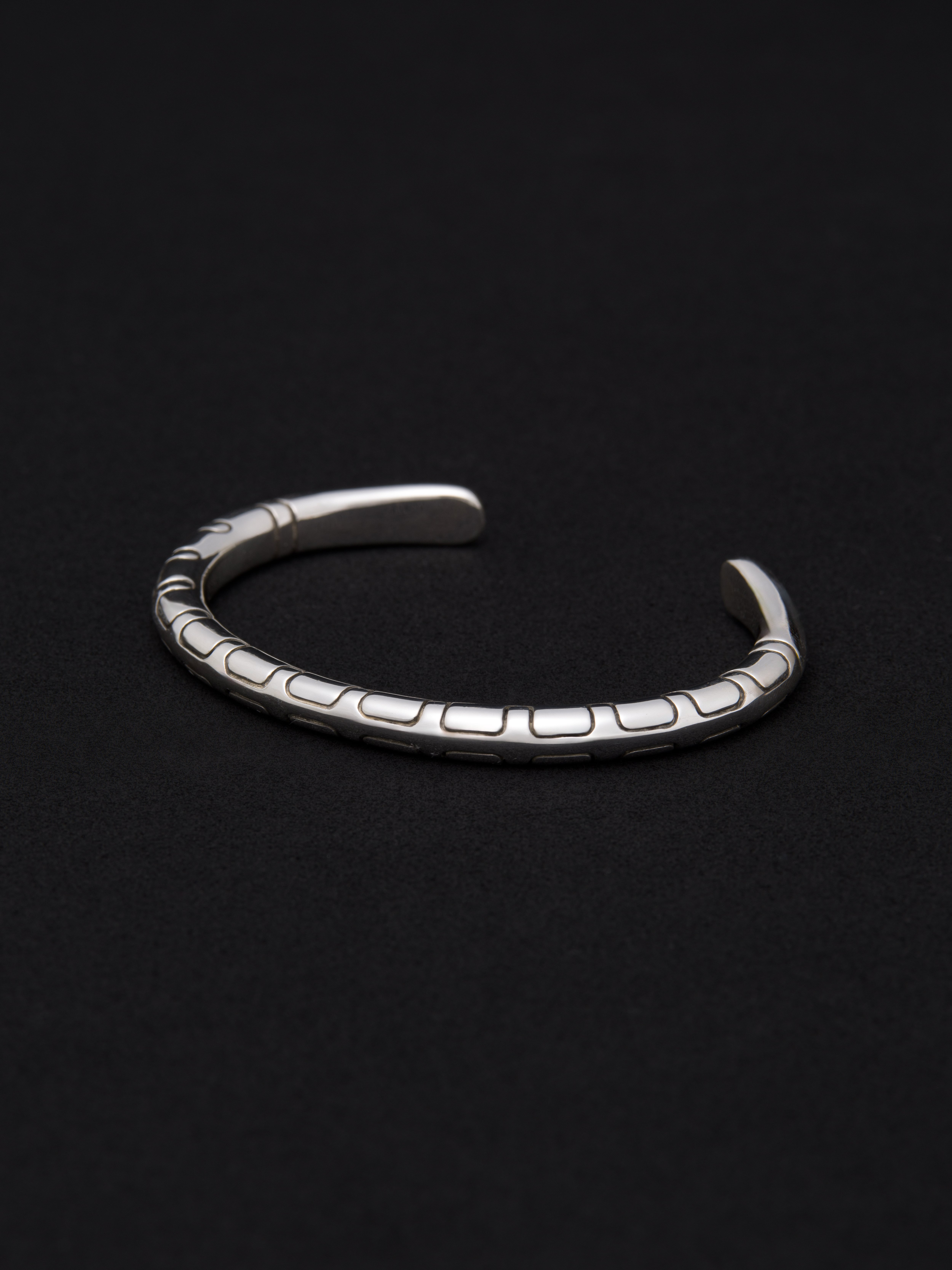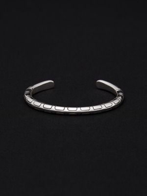RHODES|ローズ シルバー製のバングル。 ローズは2021年にファビュラスサウンズのディレクター、吉田量によって設立したブランド。インスピレーションをキーワードに、多彩なデザインのジュエリーを展開。 日本製 シルバー925 内周 : 17cm|幅 : 5.5mm アイテムナンバー|RHODES033