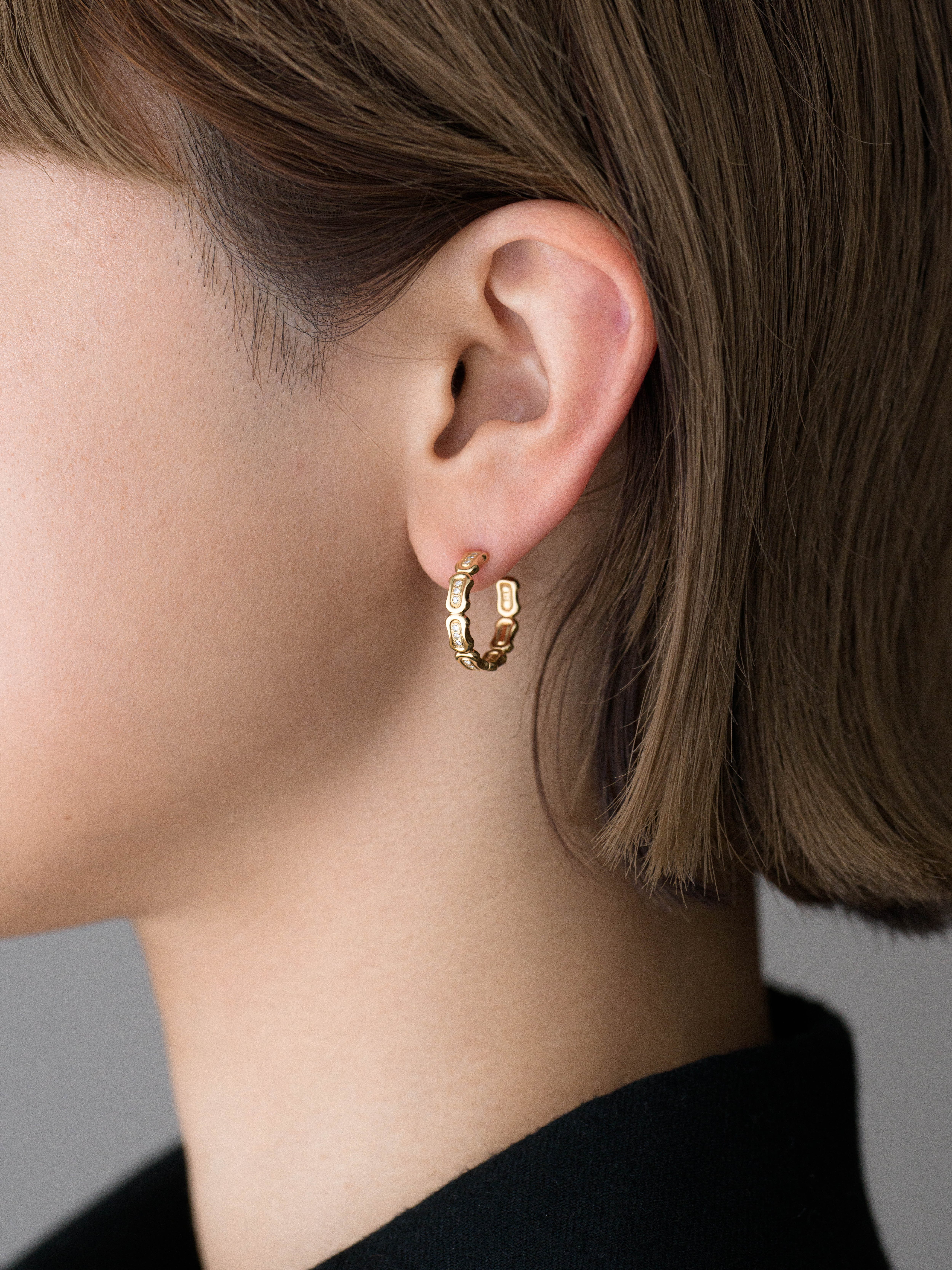 RHODES|ローズ 18Kゴールド製のフープピアス、メレダイヤモンド。 ローズは2021年にファビュラスサウンズのディレクター、吉田量によって設立したブランド。インスピレーションをキーワードに、多彩なデザインのジュエリーを展開。 日本製 18Kゴールド|ダイヤモンド サイズ : 1.8cm × 1.8cm|幅 : 3.8mm アイテムナンバー|RHODES038 シングル(片耳)販売