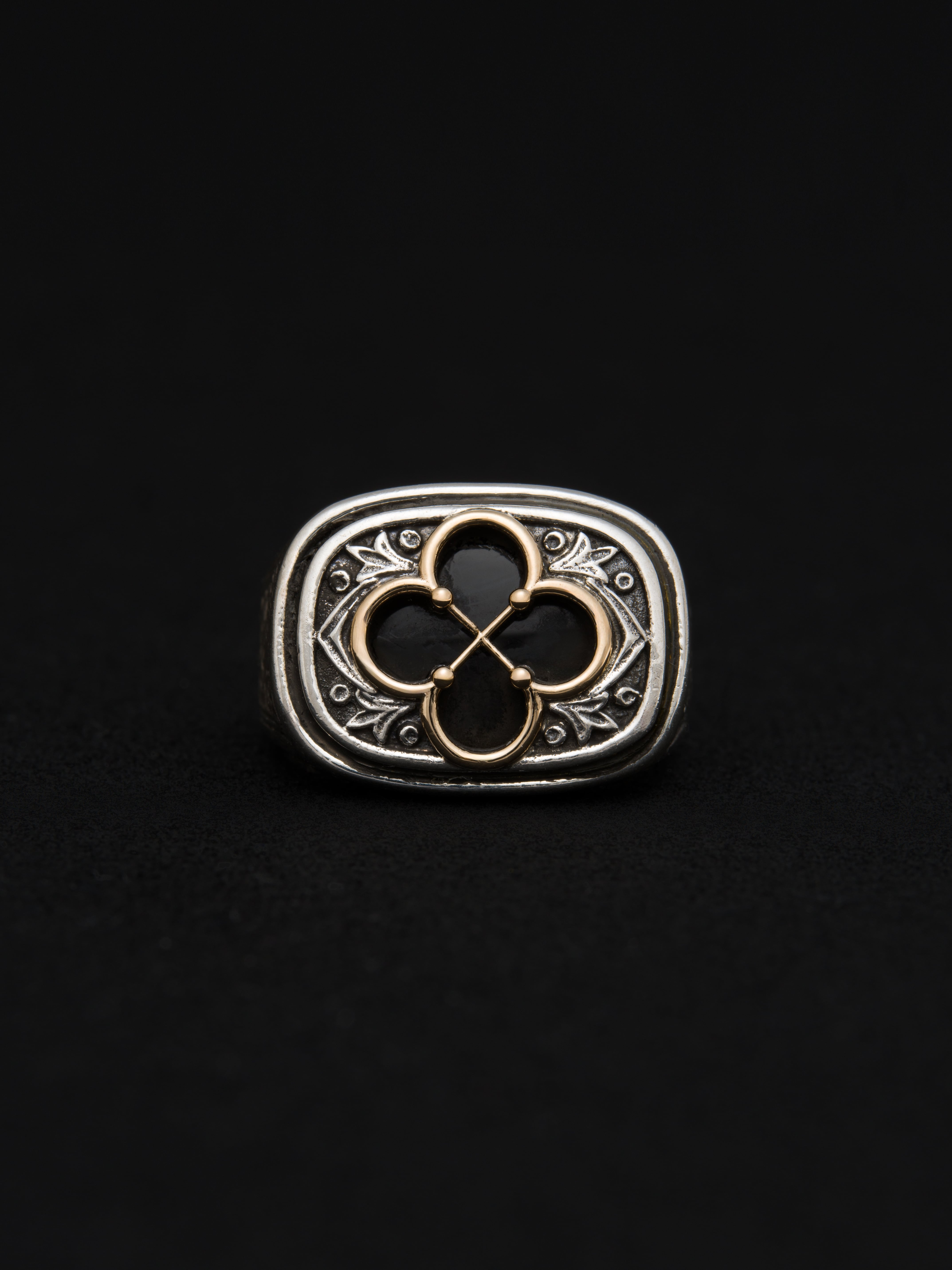 Gerochristo|ジェロクリスト オニキスを沈めたリング、シルバーと18Kゴールド製。 ギリシアに拠点を置くジェロクリストは、古典芸術様式であるビザンチンに影響を受けた伝統的な装飾技術を用い、クラシックとモダンが調和する独自のデザインでジュエリーを創り上げています。 ギリシア製 シルバー925|18Kゴールド|オニキス サイズ|JP 15 アイテムナンバー|GR090