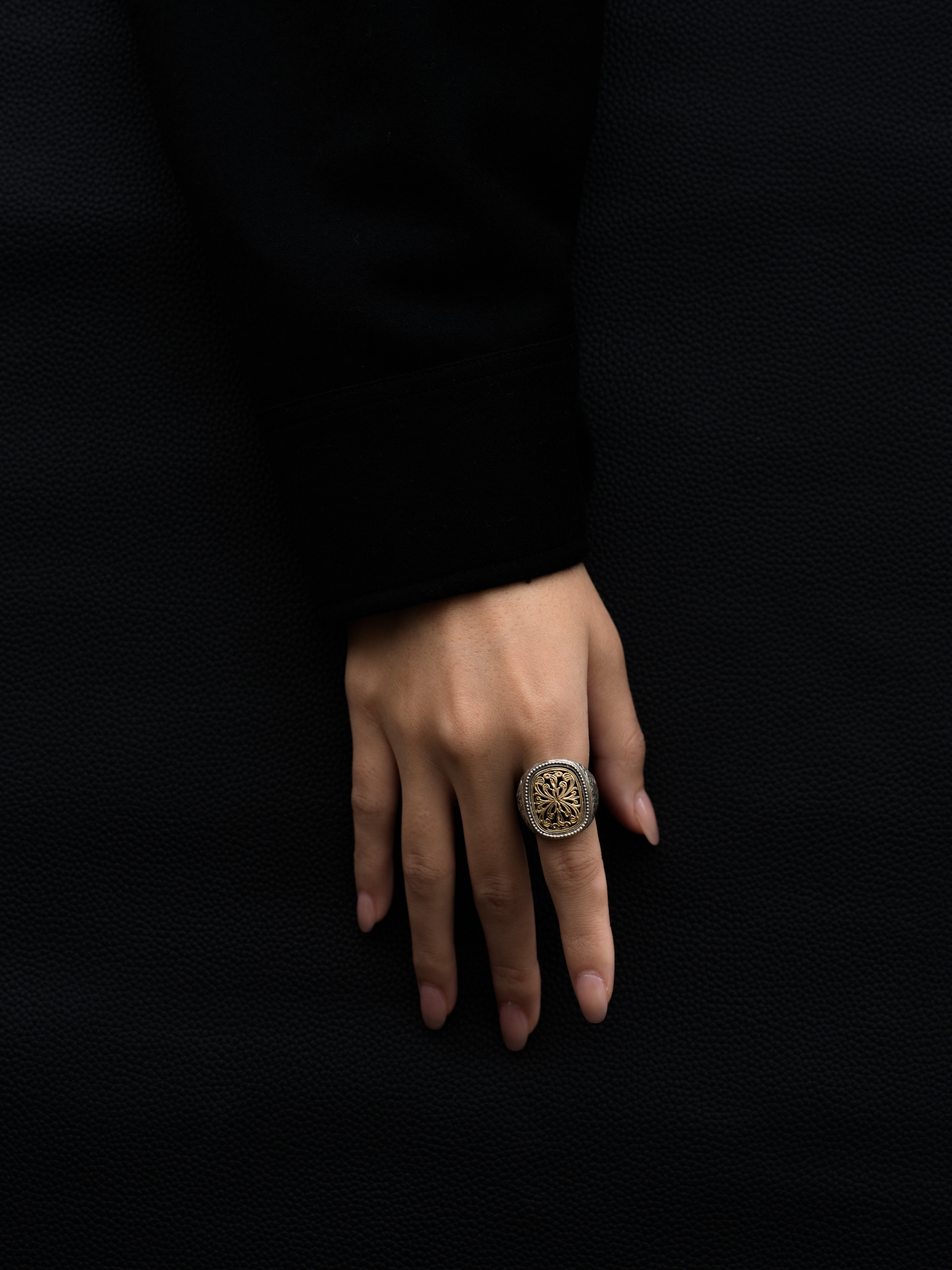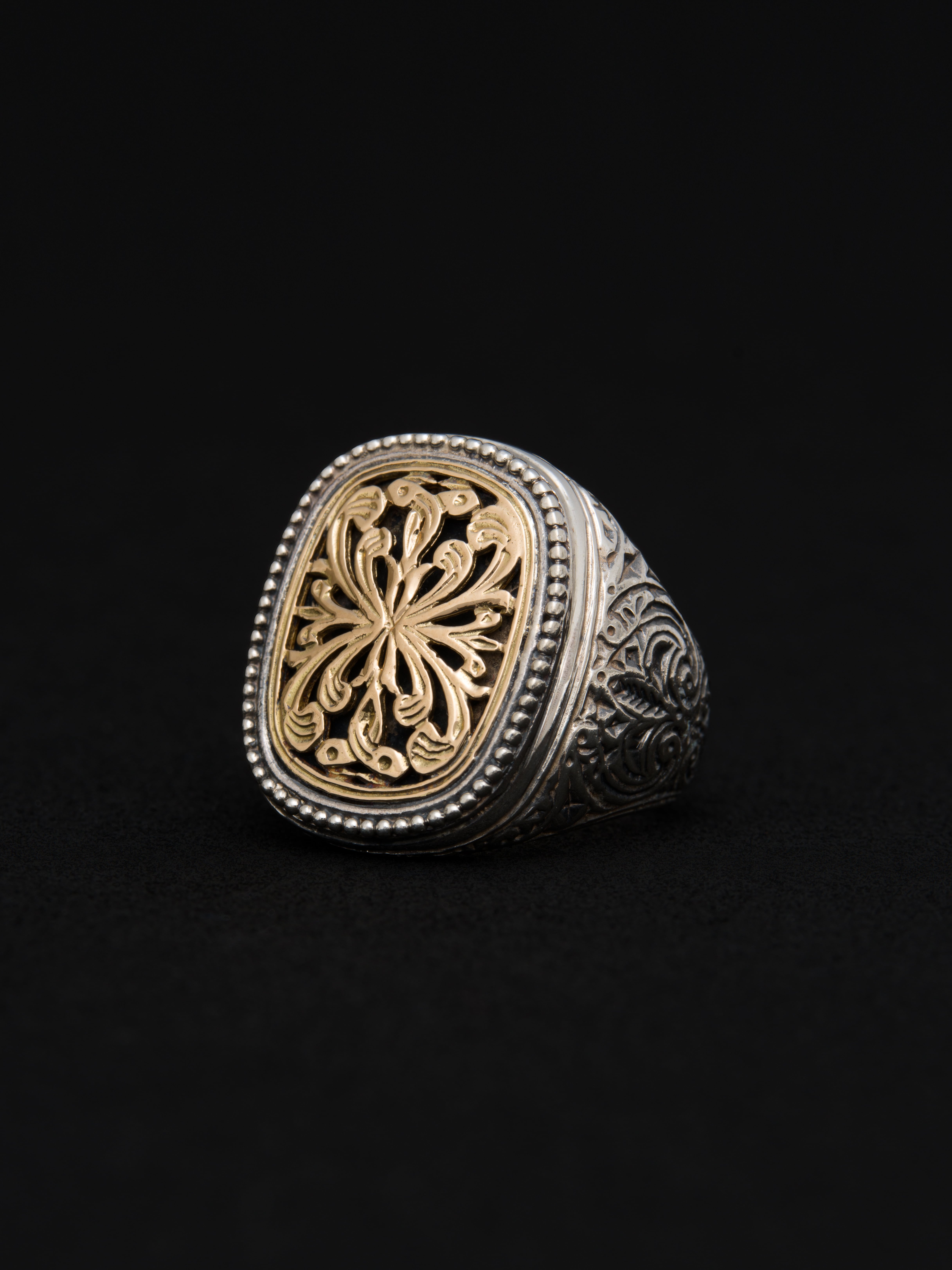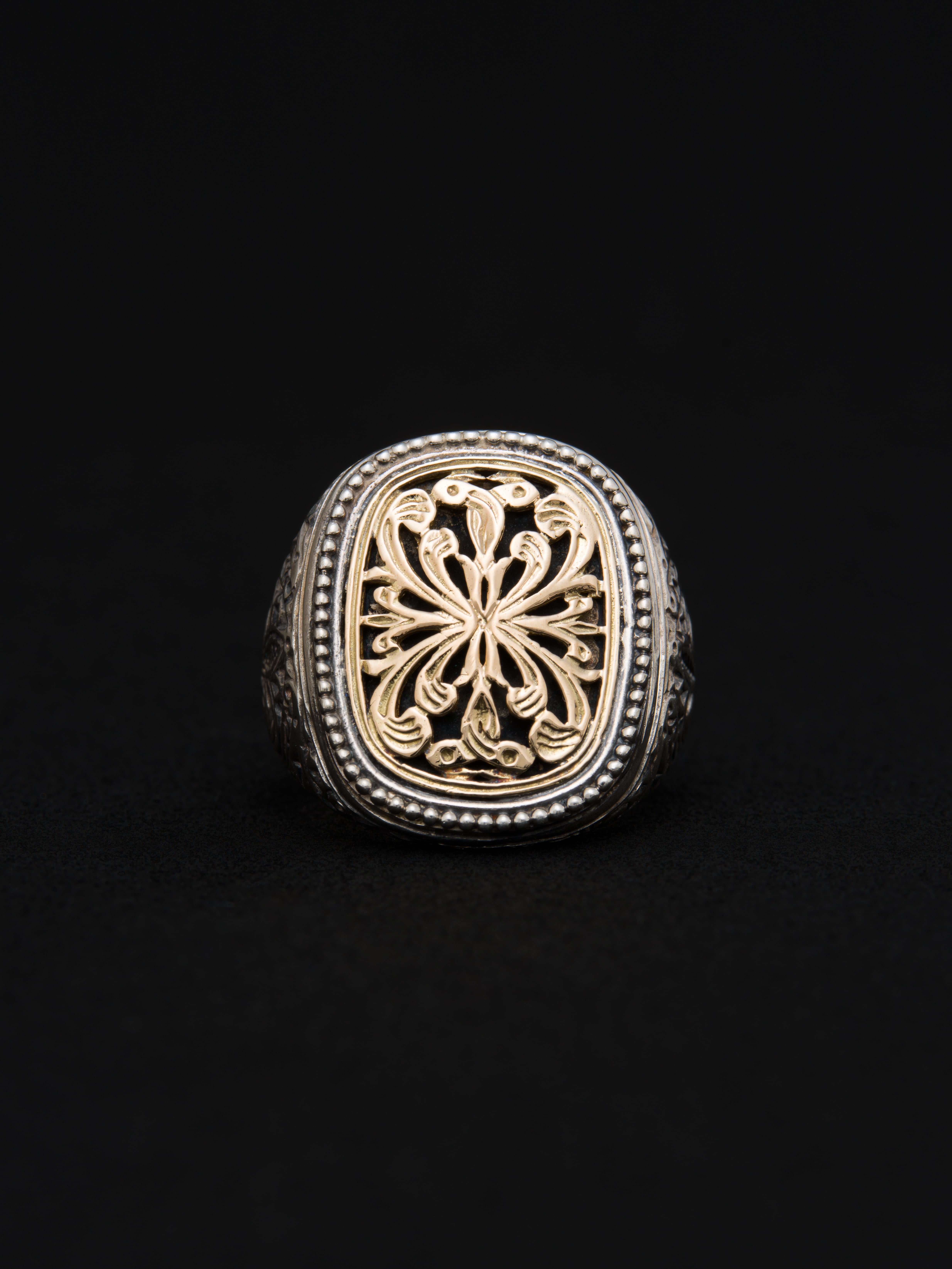 Gerochristo|ジェロクリスト シルバーと18Kゴールド製のリング。 ギリシアに拠点を置くジェロクリストは、古典芸術様式であるビザンチンに影響を受けた伝統的な装飾技術を用い、クラシックとモダンが調和する独自のデザインでジュエリーを創り上げています。 ギリシア製 シルバー925|18Kゴールド アイテムナンバー|GR092